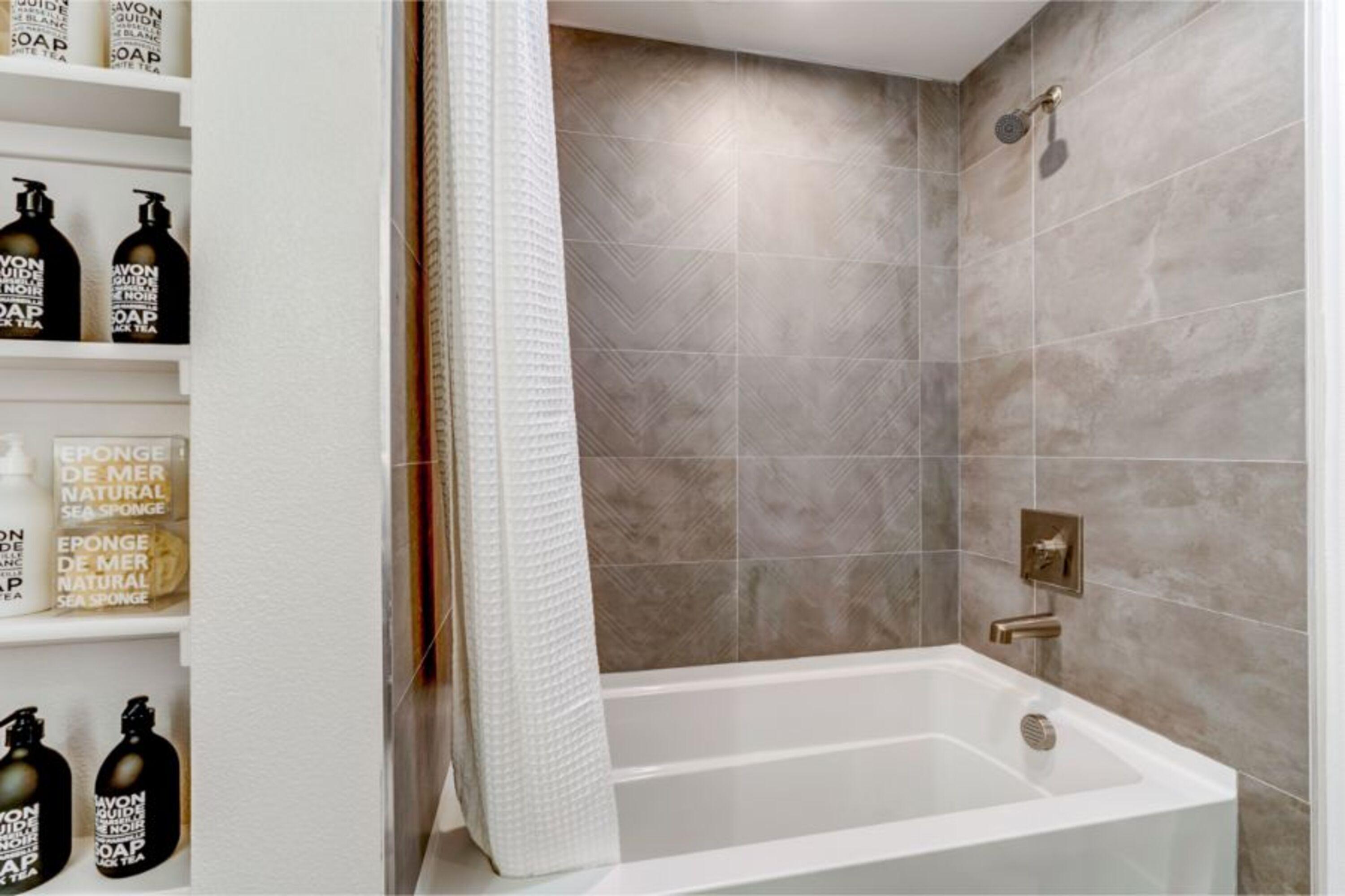 The kitchen and bathrooms in our apartments are equipped with elegant quartz countertops and full glass-tile backsplashes that are both aesthetically pleasing and functional. The upgraded cabinetry comes with under-mount lighting, and the custom pendant lighting adds to the stylish ambiance of the apartment.