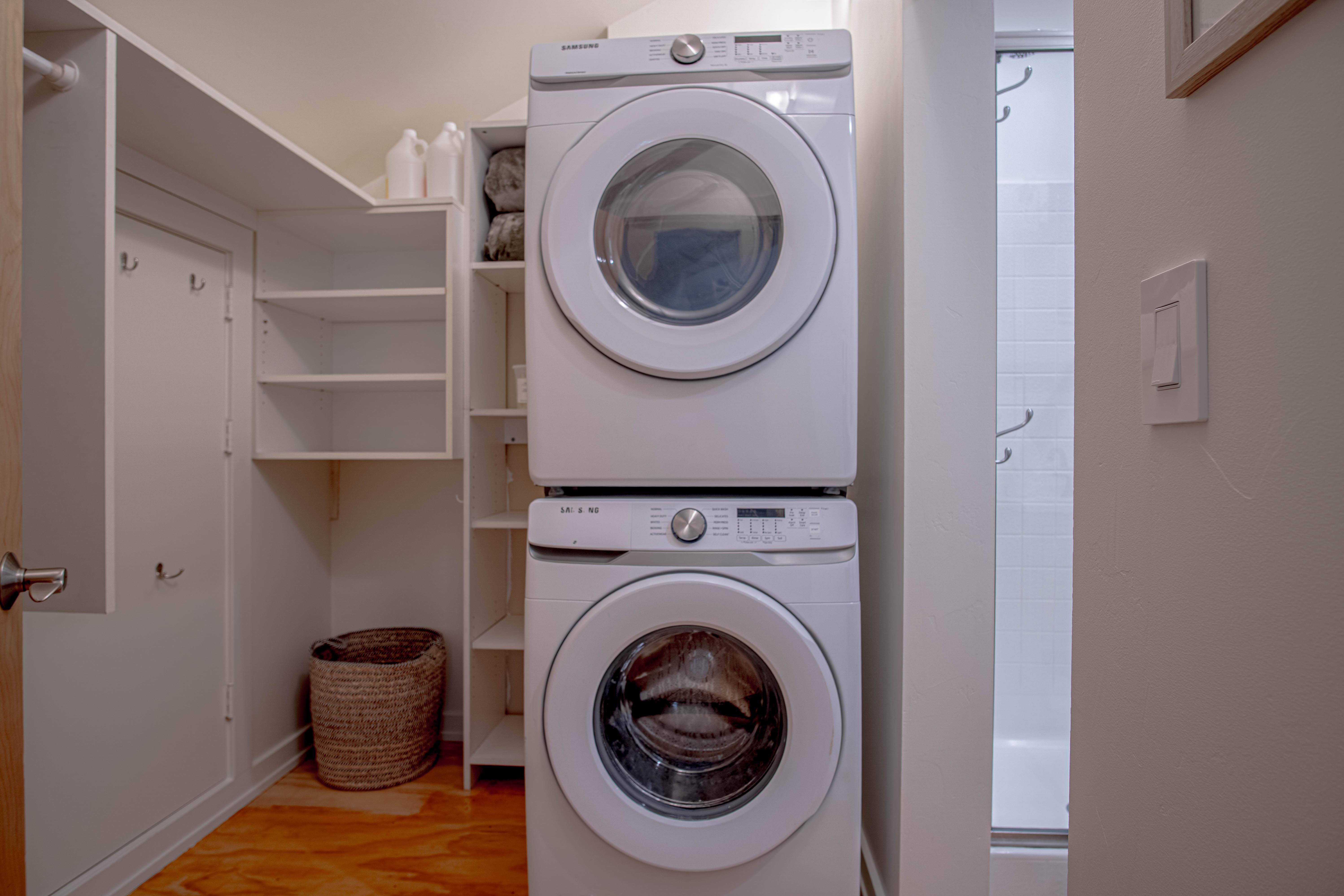 Upstairs, the second guest bedroom is ideal for families or friends traveling together. It includes a queen bed plus twin bunk beds, a Smart TV, and a private deck overlooking the school sports fields and mountains. An ensuite bathroom with a walk-in shower, closet space, and a stacked washer/dryer provide added comfort and convenience.
