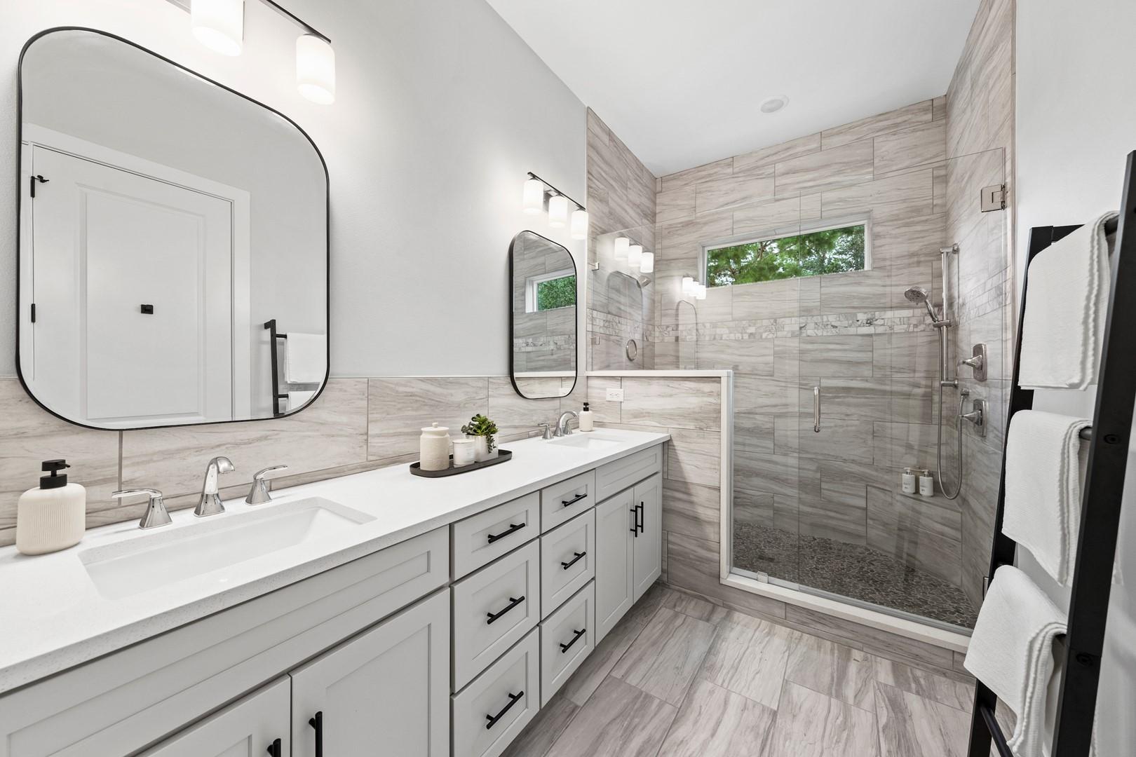 Primary Bedroom 1 (Main Level): King bed, 50" Smart TV, en suite bath with walk-in double shower (sleeps 2)