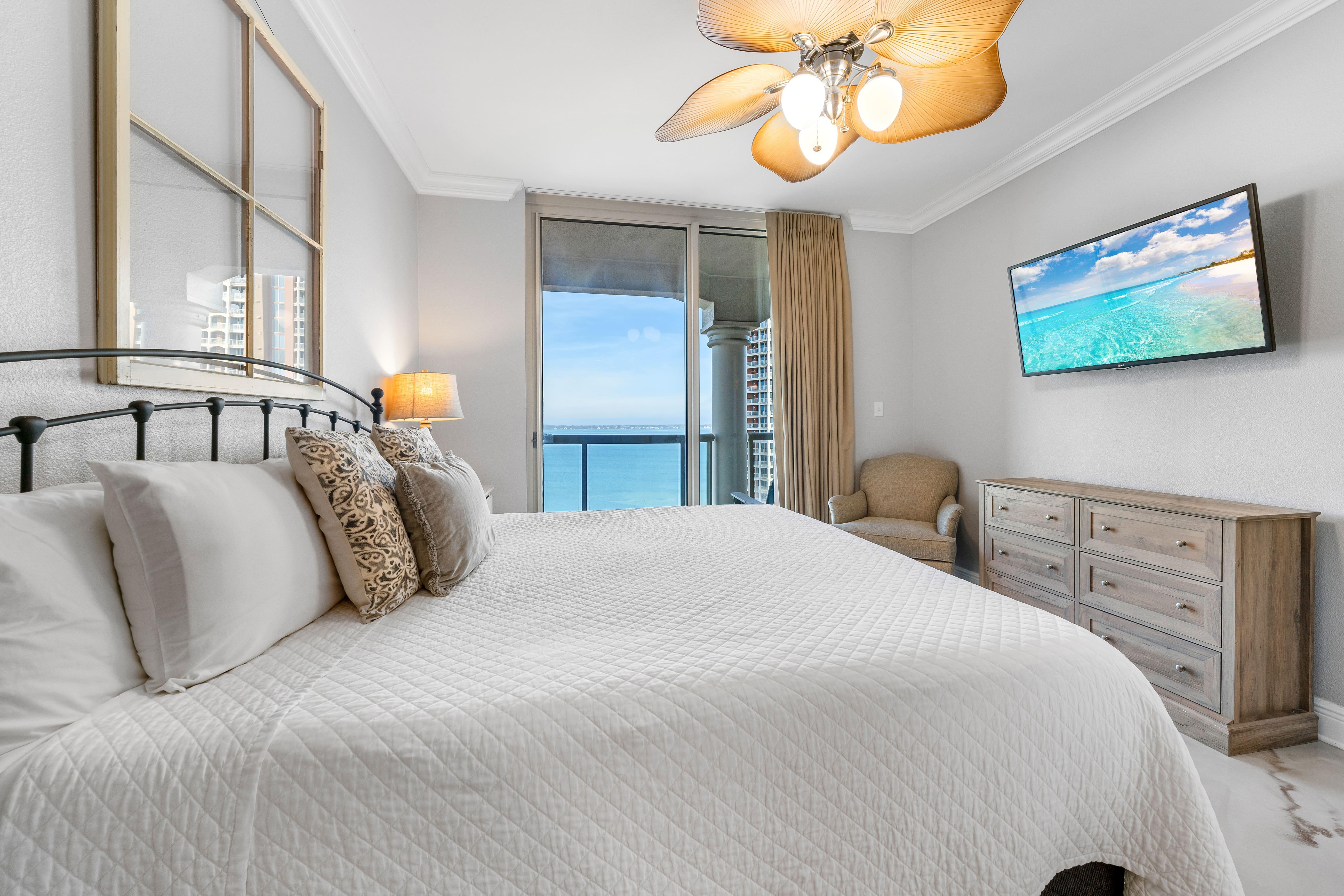 Step onto your private balcony to take in mesmerizing sunsets over the emerald waters, or unwind in the stylishly designed living area featuring a cozy seating space, a TV, and floor-to-ceiling windows that bring in natural light. The fully equipped kitchen has everything you need for home-cooked meals, and a dining area provides the perfect setting to enjoy them. For added convenience, the condo also includes a washer and dryer. The spacious bedrooms promise restful nights, while the sleek bathrooms offer a spa-like experience with modern fixtures, a soaking tub, and a walk-in shower.