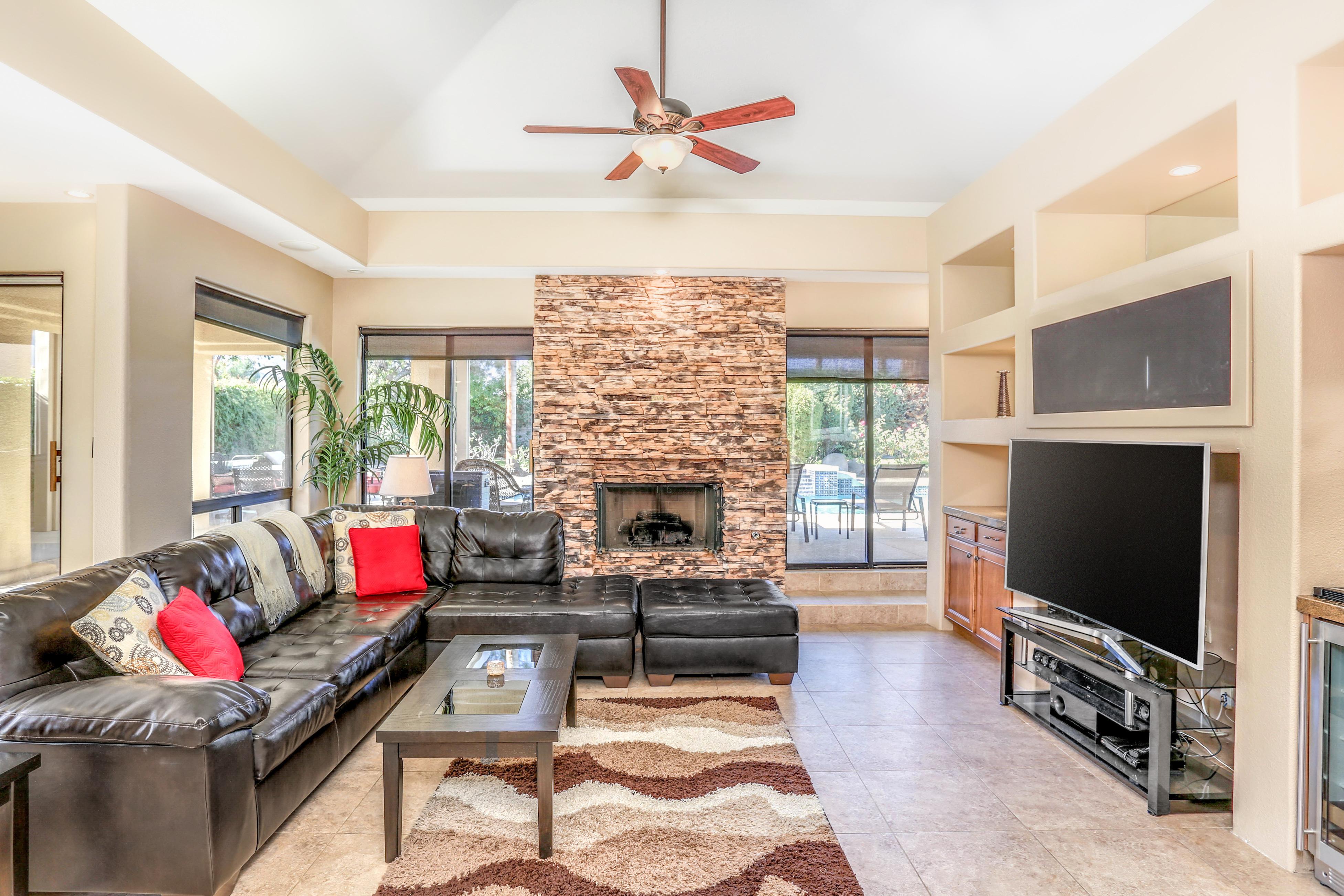 With a perfectly manicured outdoor terrace and a shimmering private swimming pool, this elegant home will help you make the most of Palm Desert's 350 days of annual sunshine. The backyard is a desert oasis, where palm trees, roses, bougainvillea, and a lemon tree surround the pool, a cascading waterfall feature, and an attached spa. You'll find plenty of shade to grill and dine alfresco, a firepit you can gather around each evening, and a beautiful indoor living space with vaulted ceilings, ample natural light, and a modern, stone-encased fireplace that perfectly sets the mood at night.
