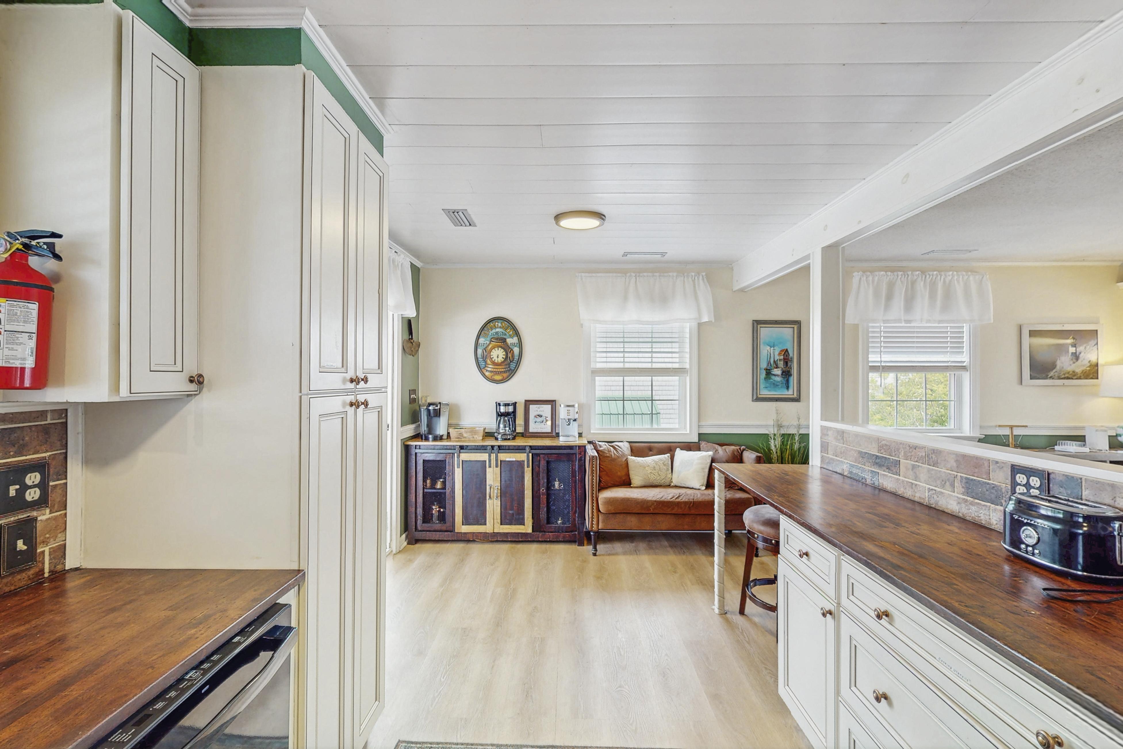 Indoor space is just as welcoming, with an open floor plan, comfortable furnishings, and hardwood floors throughout. The well-equipped kitchen features butcher block countertops, a lovely copper farmhouse sink, and stainless steel appliances. Coffee lovers will especially appreciate the coffee bar, at the ready to fulfill your caffeine needs. Countertop seating and a large farmhouse-style dining table round out the mealtime seating options, and there’s room for everyone to relax on the large sectional at the end of the day. When you get tired, three well-appointed bedrooms down the hall promise a restful night’s sleep, including the primary bedroom with deck access and an en suite bathroom. Drift off to sleep with one perfect vacation day behind you - and another to come tomorrow.
