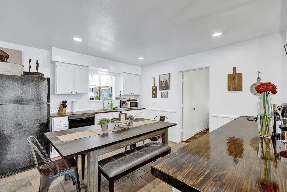 Bayer Guest Haus is a luxurious and spacious home that accommodates up to 8 guests comfortably. The inviting open living room, adorned with plush couches and a touch of charming farmhouse decor, features brand new wood floors and a large flat-screen TV—an ideal setting for unwinding and enjoying cozy movie nights with cherished loved ones.
