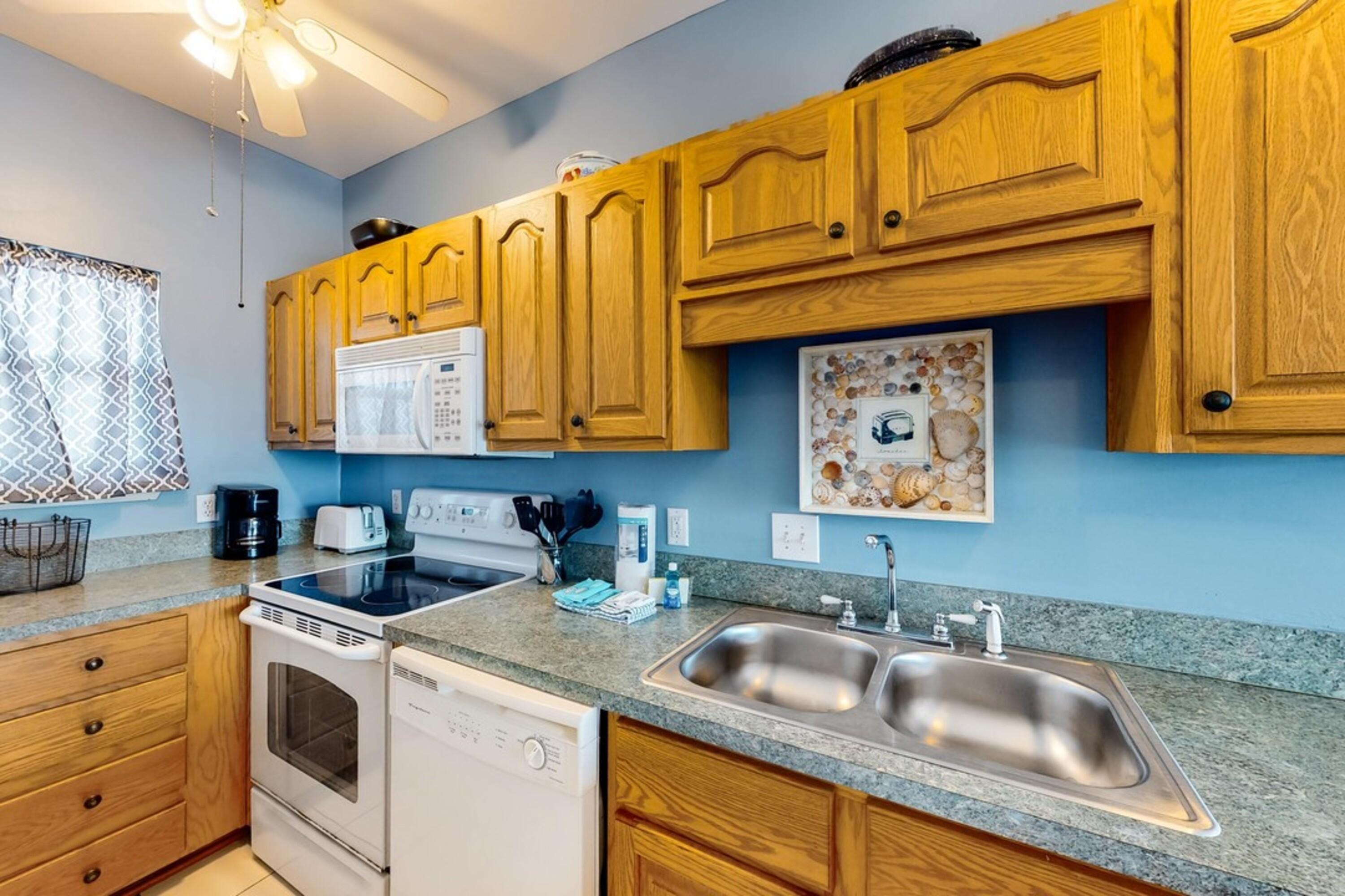 The interior is thoughtfully designed, featuring a spacious living area and a fully equipped kitchen to meet all your culinary needs. Each bedroom is furnished with a cozy queen bed, ensuring restful nights after a day of beachside adventures.