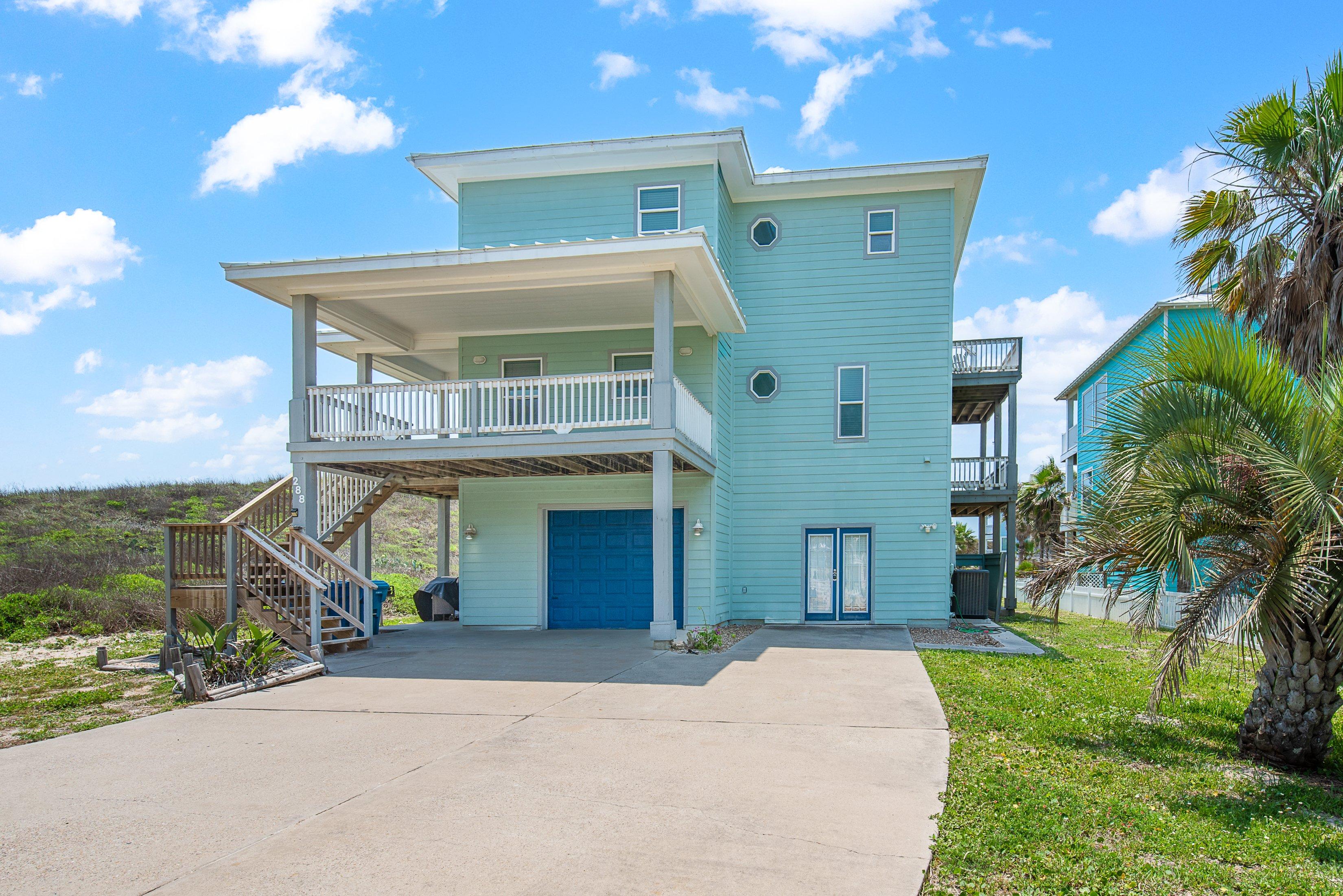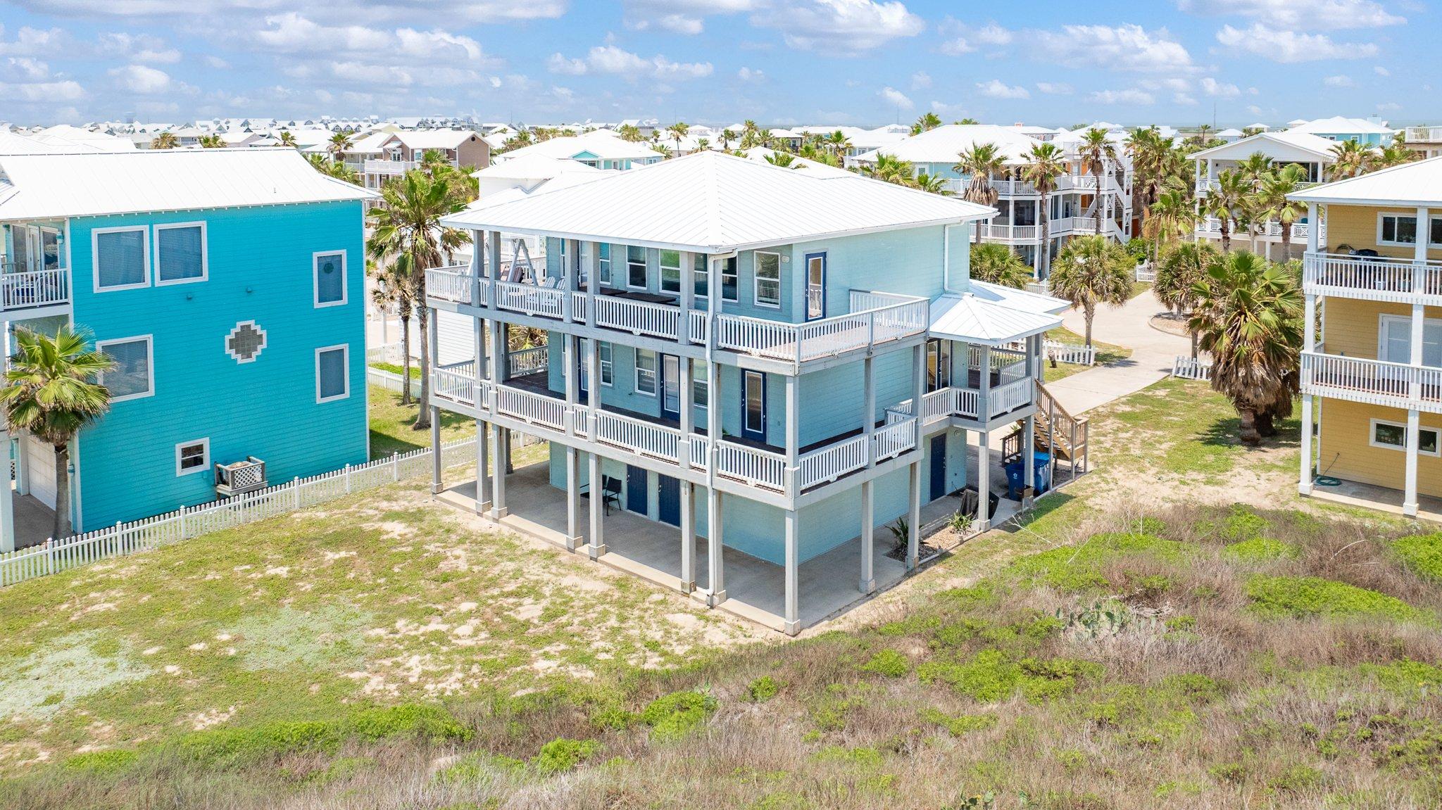 This stunning three-story beachfront home offers breathtaking ocean views and everything you need for an unforgettable coastal escape— including a golf cart, beach gear credit, and pet-friendly accommodations. Located in the vibrant, colorful Mustang Royale neighborhood of Port Aransas, the home sits on nearly three-quarters of an acre, directly backing onto the Gulf of Mexico.