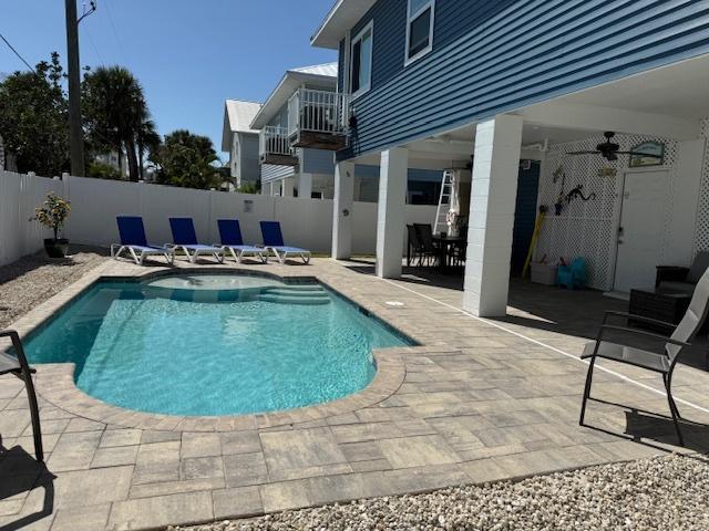 heated swimming pool with a fountain on a paved deck and outdoor furnishings,
