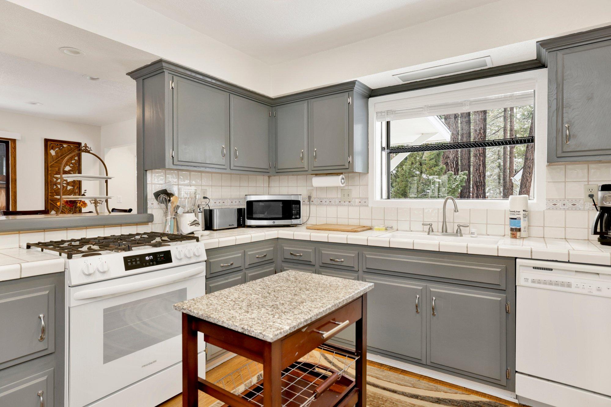 The stunning brick fireplace takes center stage in the open great room upon entering your home, with white walls, a vaulted ceiling in the living room and comfy sitting couches sat around the mounted flat screen TV, you will love enjoying movie nights here in front of a toasty fire. Complimentary WIFI and Digital Steaming Services are available for your convenience. Big open windows provide the perfect amount of natural lighting while doubling as a wonderful space to snuggle up and watch the snow falling in the winter seasons. The spacious open floor plan conveniently leads right into the Cooks kitchen and dining area, you will find all that you need to whip up your home cooked meals here. Boasting modern appliances and ample tile counter spaces to ensure that your meal prep here is a breeze. Cookware, appliances, and utensils are conveniently stocked in the slate grey cabinets while a dishwasher is also available for your convenience. The dining room area has multiple windows for you to enjoy the views while you dine at the table for 8 or there is also breakfast bar stool seating available for your group.