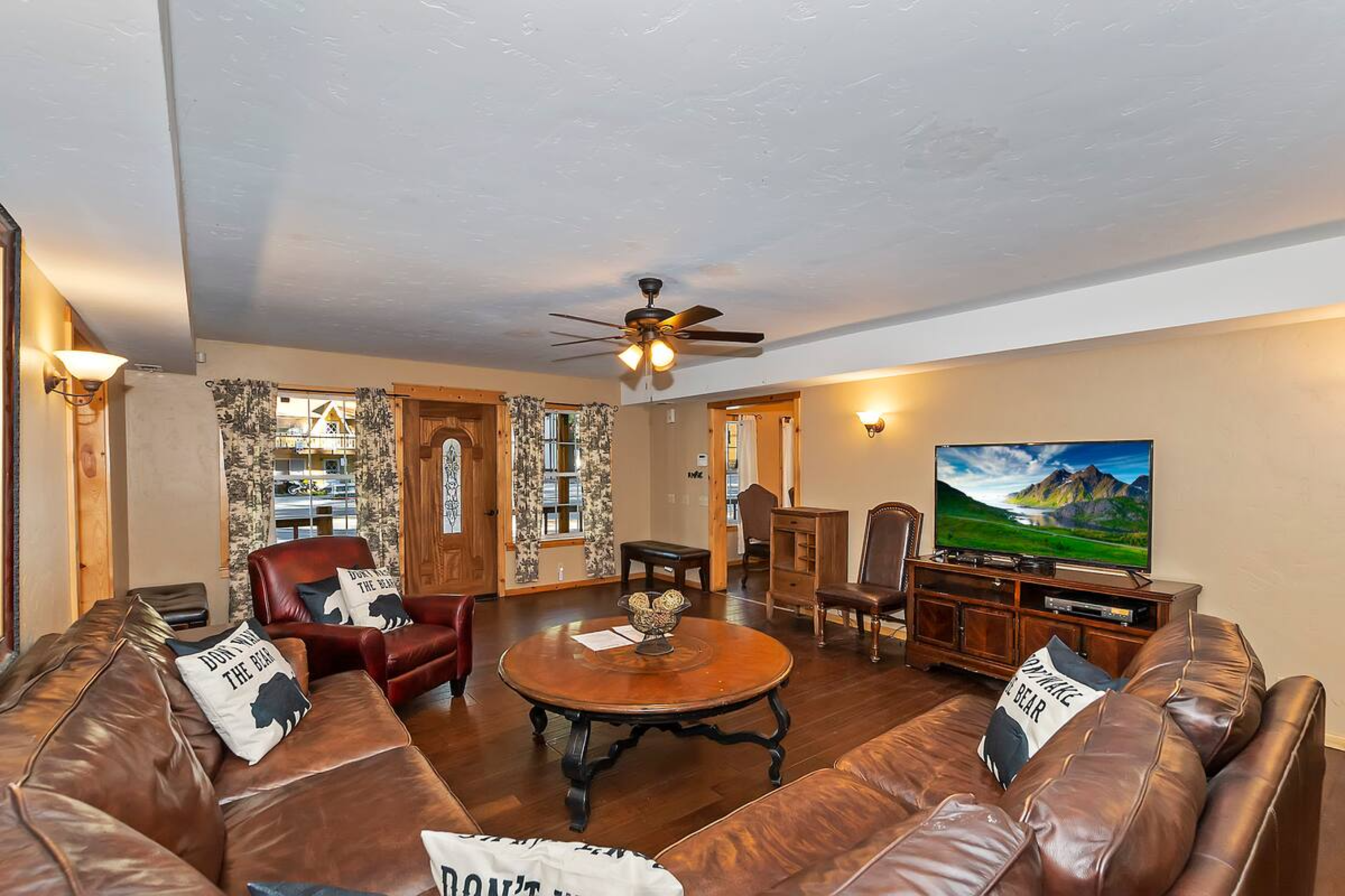 Step inside to find a warm and inviting living space featuring a cozy indoor fireplace, perfect for relaxing after a day of outdoor adventures. The open-concept design allows for easy gathering, whether you're cooking in the fully equipped kitchen, dining together, or unwinding in the comfortable lounge area.