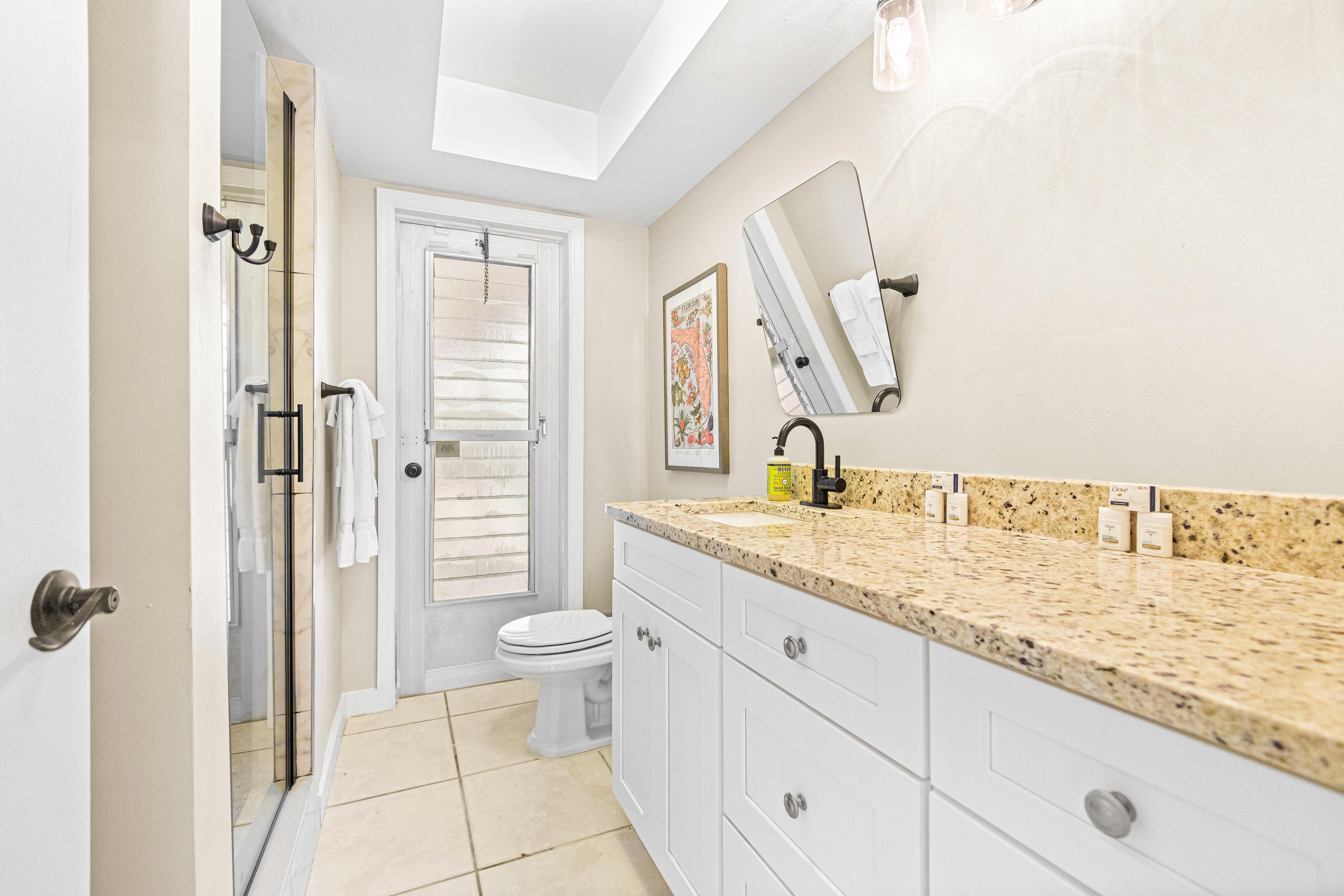 Lit by the charming glow of the chandelier, the primary bedroom offers expansive living quarters with a lovely en suite bathroom. Rinse off the day's sunscreen in the walk-in shower and apply a soothing face mask at the extra-large vanity. The additional four bedrooms are just as lovely, all lined with soft linens, a nautical theme, and central air-conditioning. A private washer/dryer and internet access round out the interior conveniences.