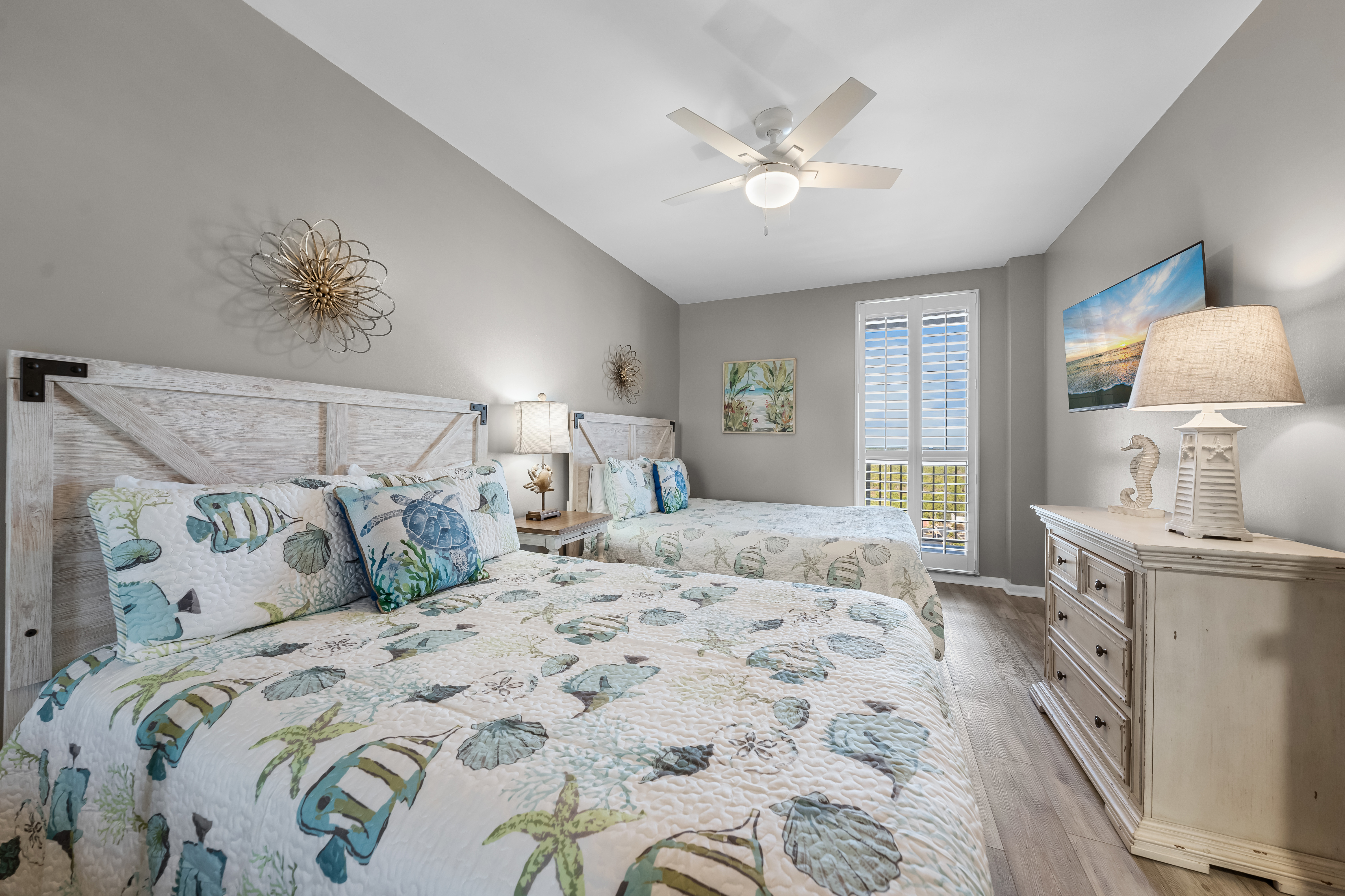 You will find that this three-bedroom, two-bathroom penthouse-level condo provides a very open layout. The bedrooms have been updated with new furniture that gives you that beachy vibe. The main bedroom features a king-size bed with access to the outdoor living area on the oversized balcony. The second bedroom which could serve as a second master bedroom also has a king-size bed and a large flat-screen TV. The third bedroom features both a queen-size bed and a full-size bed with a flat-screen TV as well.