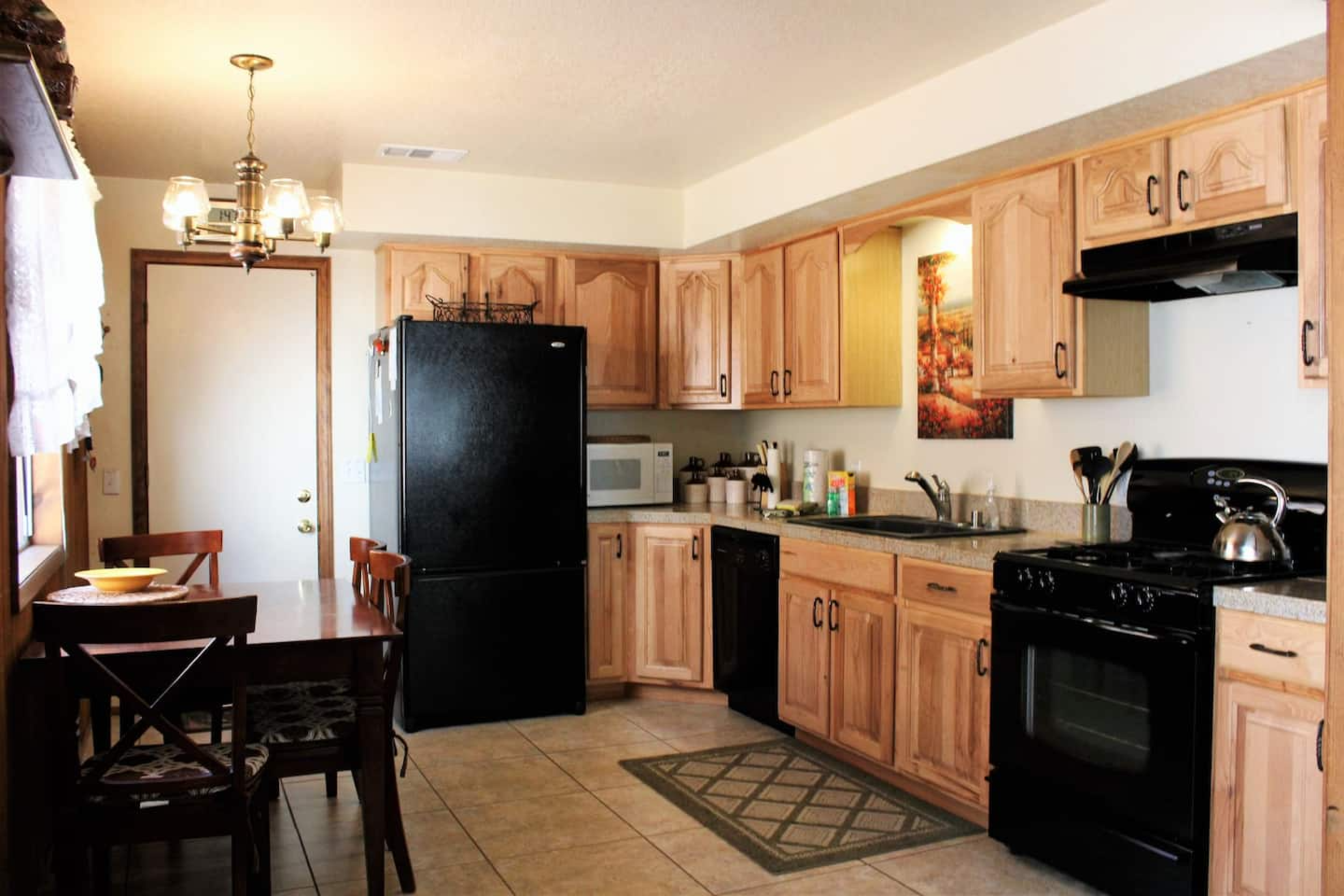 The kitchen is updated and fully equipped with granite tile counters, wood cabinets, and modern appliances. The dining table is great for enjoying meals or your morning coffee. Step out the back door to a new patio with a BBQ grill, outdoor seating, and a fenced yard for kids to play.