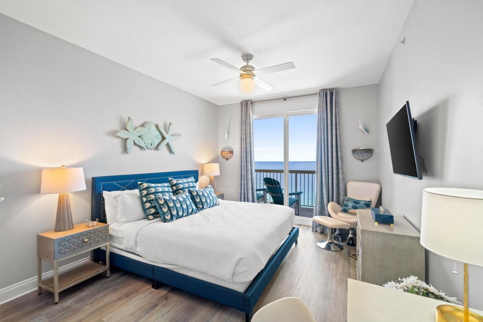 Bedroom 1 – Gulf-front king bed, TV, balcony access, en suite bathroom