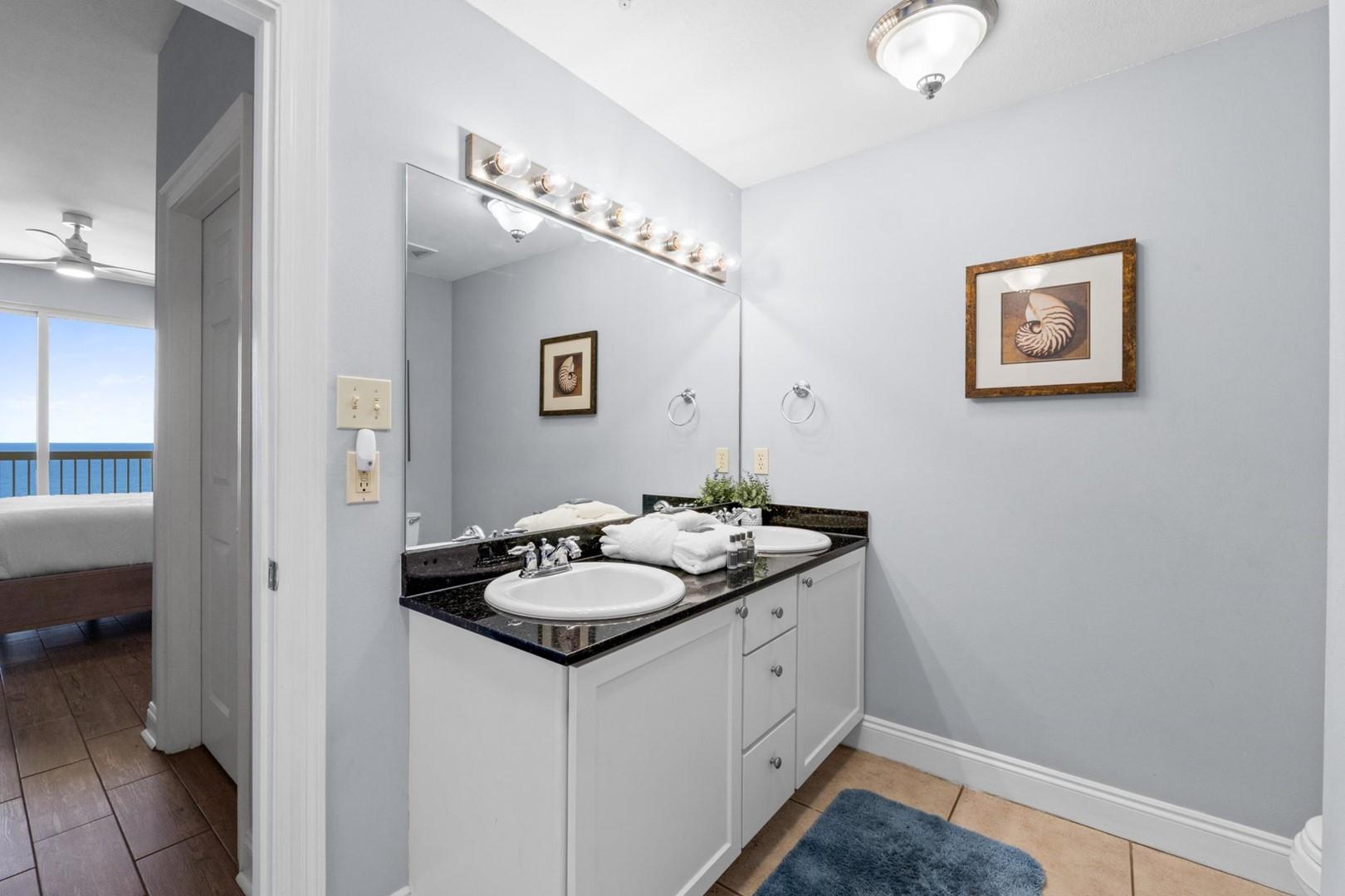 Gulf-front master bedroom – king bed, en suite bathroom with double vanity, balcony access
