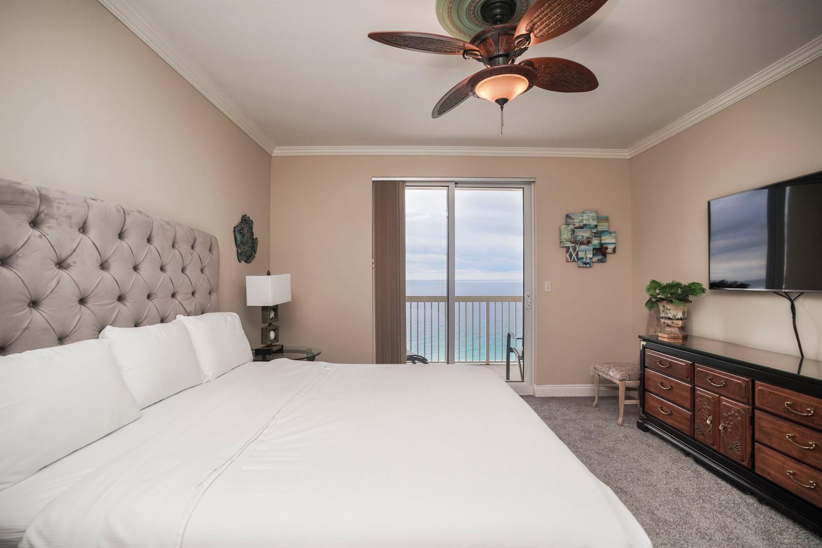 Gulf-front master bedroom – king bed, 60" TV, en suite bathroom, private balcony access