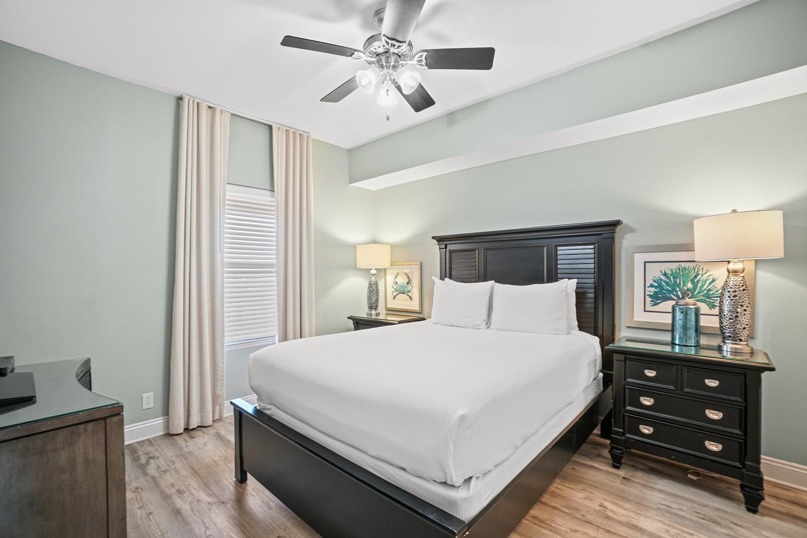 Master bedroom – king bed, Gulf view, private balcony access, en suite bath with double vanity