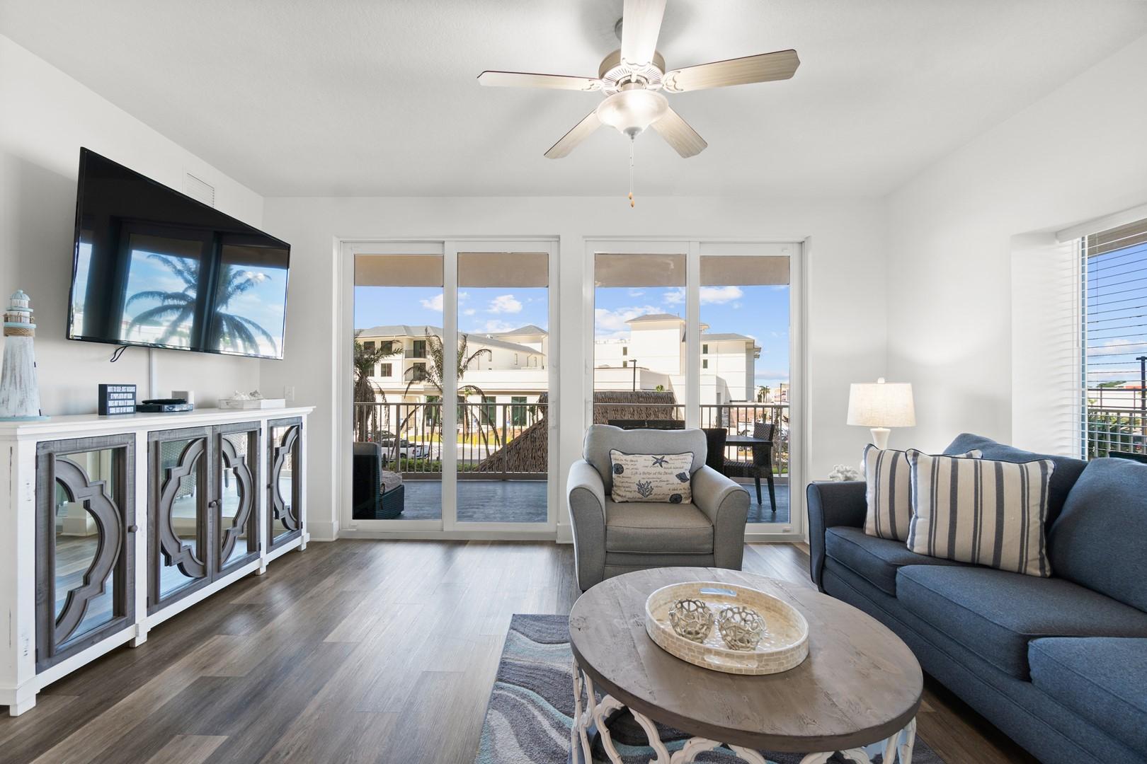 Open-Concept Living Area – Smart TV, Tile Floors, Balcony Access