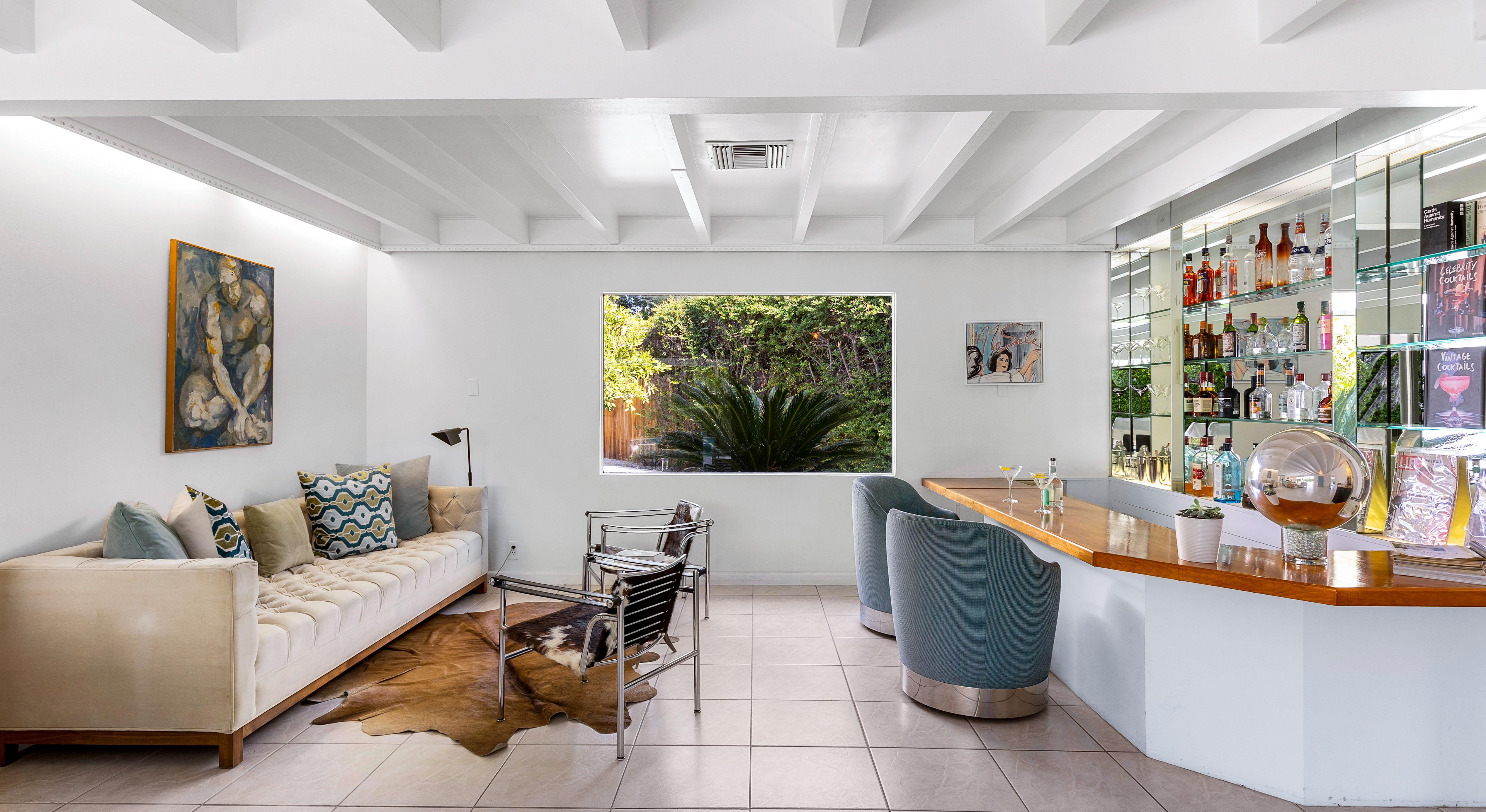 Step into a private, beautifully landscaped yard with a unique “space capsule” saltwater pool, fire pit, and multiple seating areas. Relax in shaded chaises, enjoy al fresco dining, or pick fresh citrus from the trees for your morning coffee. By night, gather around the fire pit for stargazing and conversation, surrounded by the beauty of California palm trees and mountain views.