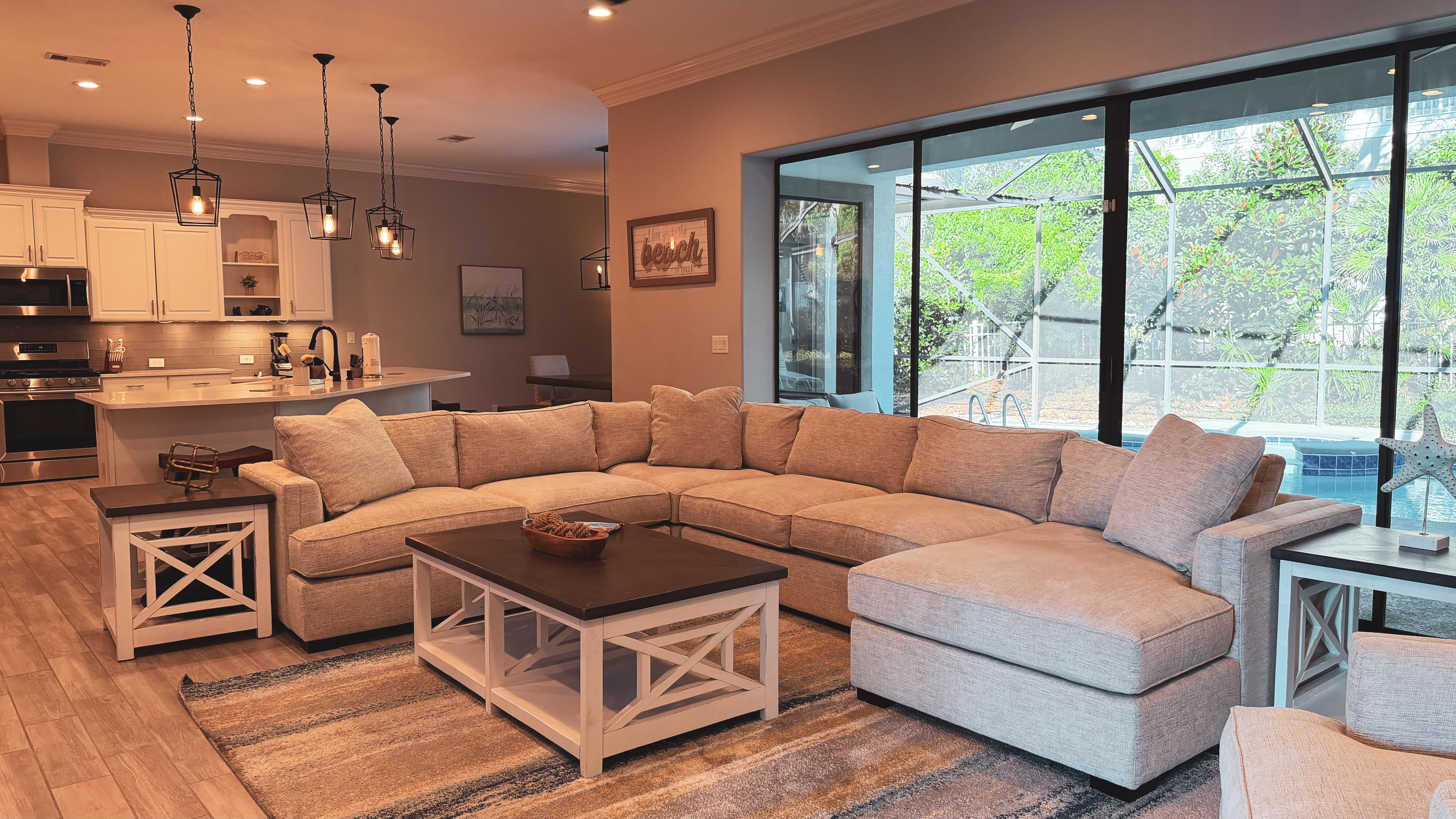 - Private screened pool and spa with TV, grill, and lounge area