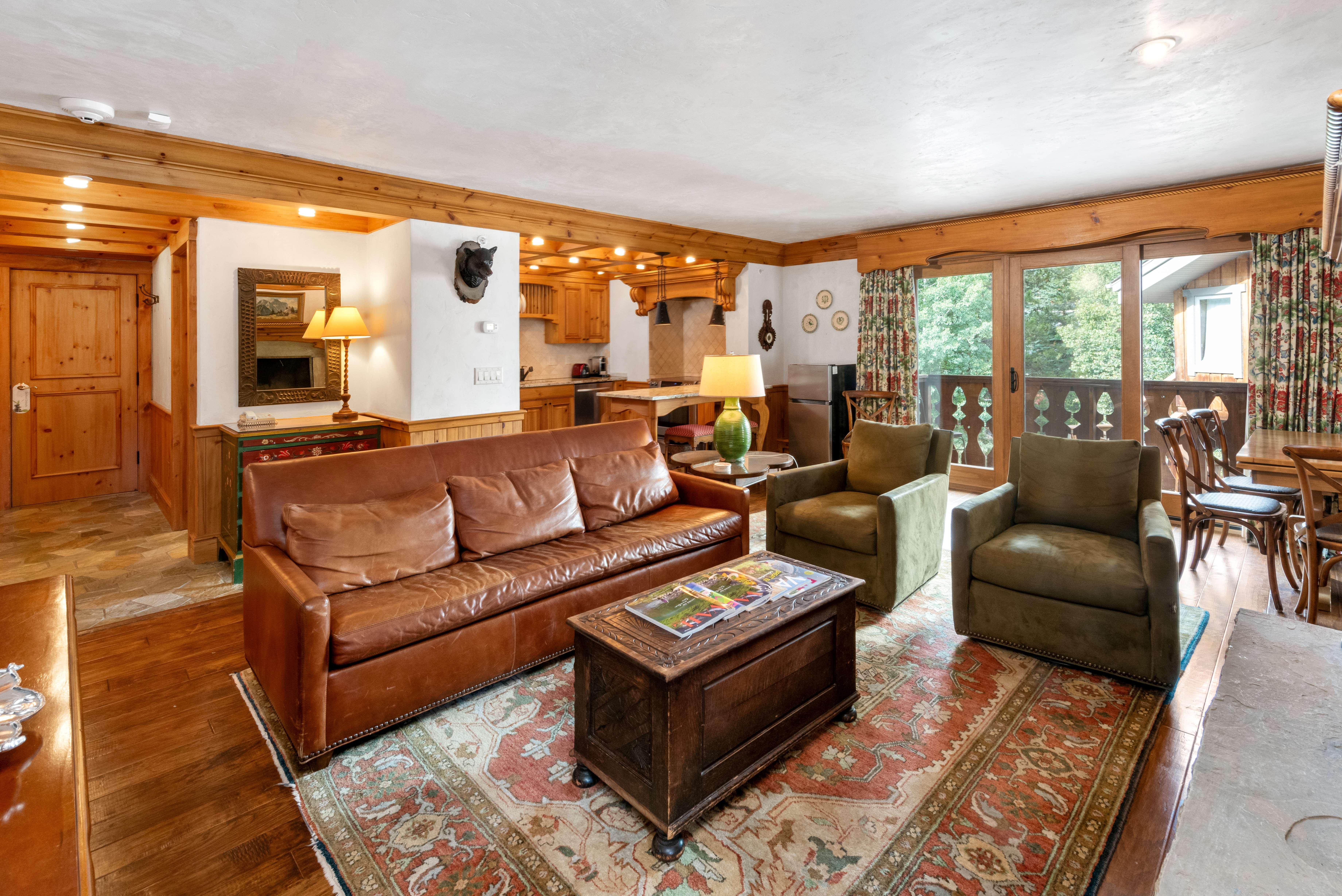 Chateau Christian 310 is a beautifully decorated, luxury mountain residence that features 2 bedrooms and 3 bathrooms, offering ample space for the whole family. Situated on the top floor. King size bed in the master with en-suite bathroom and King size bed in the second bedroom with built in bunk beds, en-suite bathroom The spacious living room includes a pull-out sofa bed, and additional spaces include a fully equipped kitchen and a dining area. Amenities include a wood-burning fireplace, three flat-screen TVs, a washer/dryer, and a balcony overlooking the Christiania pool. Connected to the Christiania Lodge, Chateau 310 is just 50 yards from Gondola One in Vail Village. One parking space per unit is provided, with a surcharge