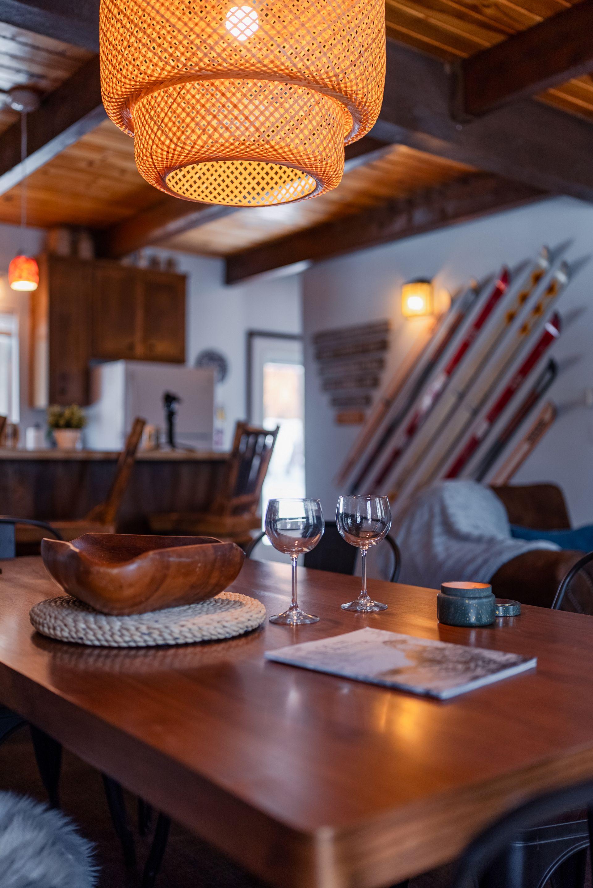 Enter on the lower level of your chalet where you are greeted with knotty pine beamed ceilings and mountain themed décor within a cozy and warm open floor plan- perfect for visiting together on the sitting couch as you warm your toes in front of the toasty wood burning fireplace and watch the snow falling thru the open windows and tree top views. The log dining table pairs with the breakfast bar stools to ensure there is plenty of comfortable seating for your party while the cute kitchen is equipped with all that you need for your home cooked meals together including cookware, utensils, and general appliances. Enjoy two sleeping quarters and a spacious bathroom on each level of your sprawling chalet keeping you perfectly spaced out yet still connected while vacationing- each room is made up for your group with warm linens, blankets, pillows, and fresh shower towels for your visit when you arrive.