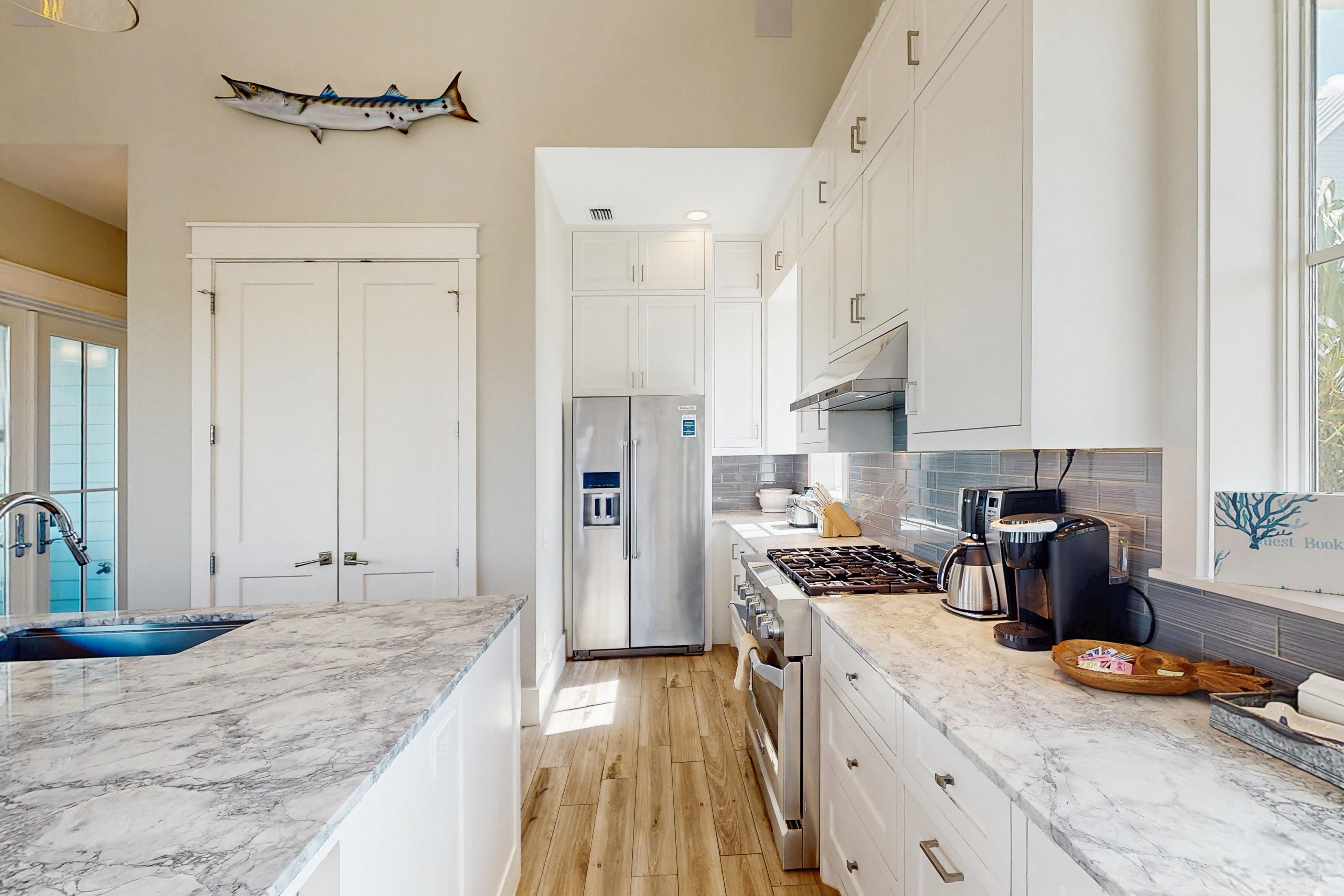 Relax in the laid-back yet upscale living room with sunset views of the fairways and marina. Indulge in the warm Gulf breezes from the private decks. The gourmet kitchen features granite countertops, a huge center island, and stainless steel appliances. Enjoy meals together at the dining table or kitchen bar. Wind down in the comfortable bedrooms, including three primary suites with private balconies to experience the Gulf air. Additional amenities include high-speed WiFi and two sets of washers and dryers.