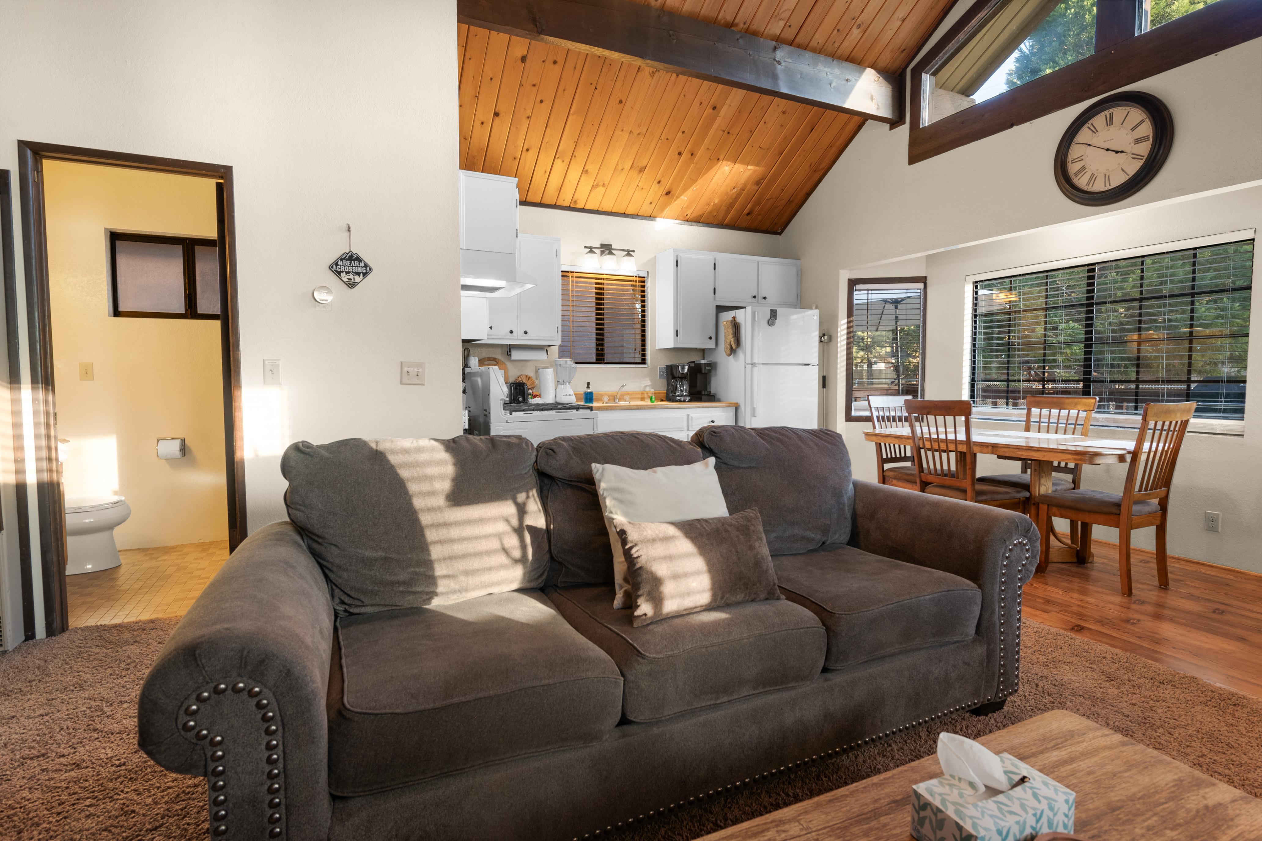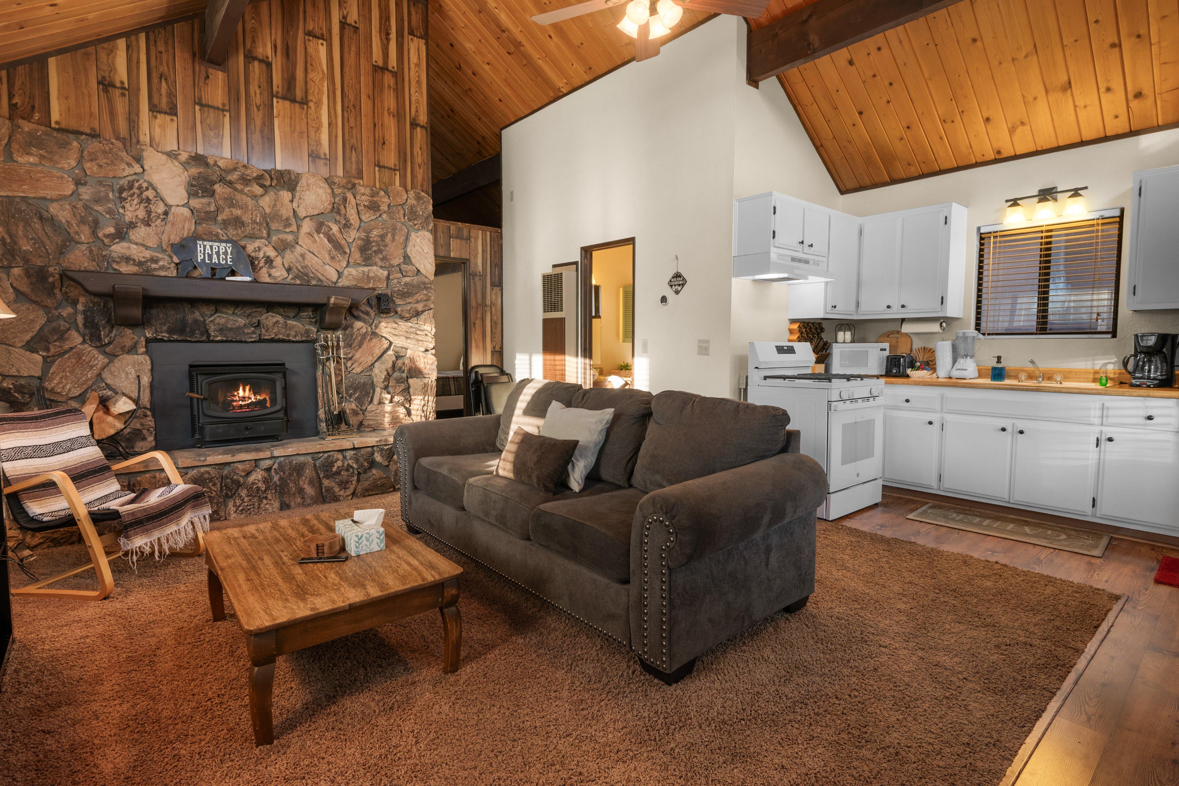 LIVING SPACE - Cozy 700+ sq ft home with living room, dining table, wood burning fireplace, and plenty of comfortable living room seating.