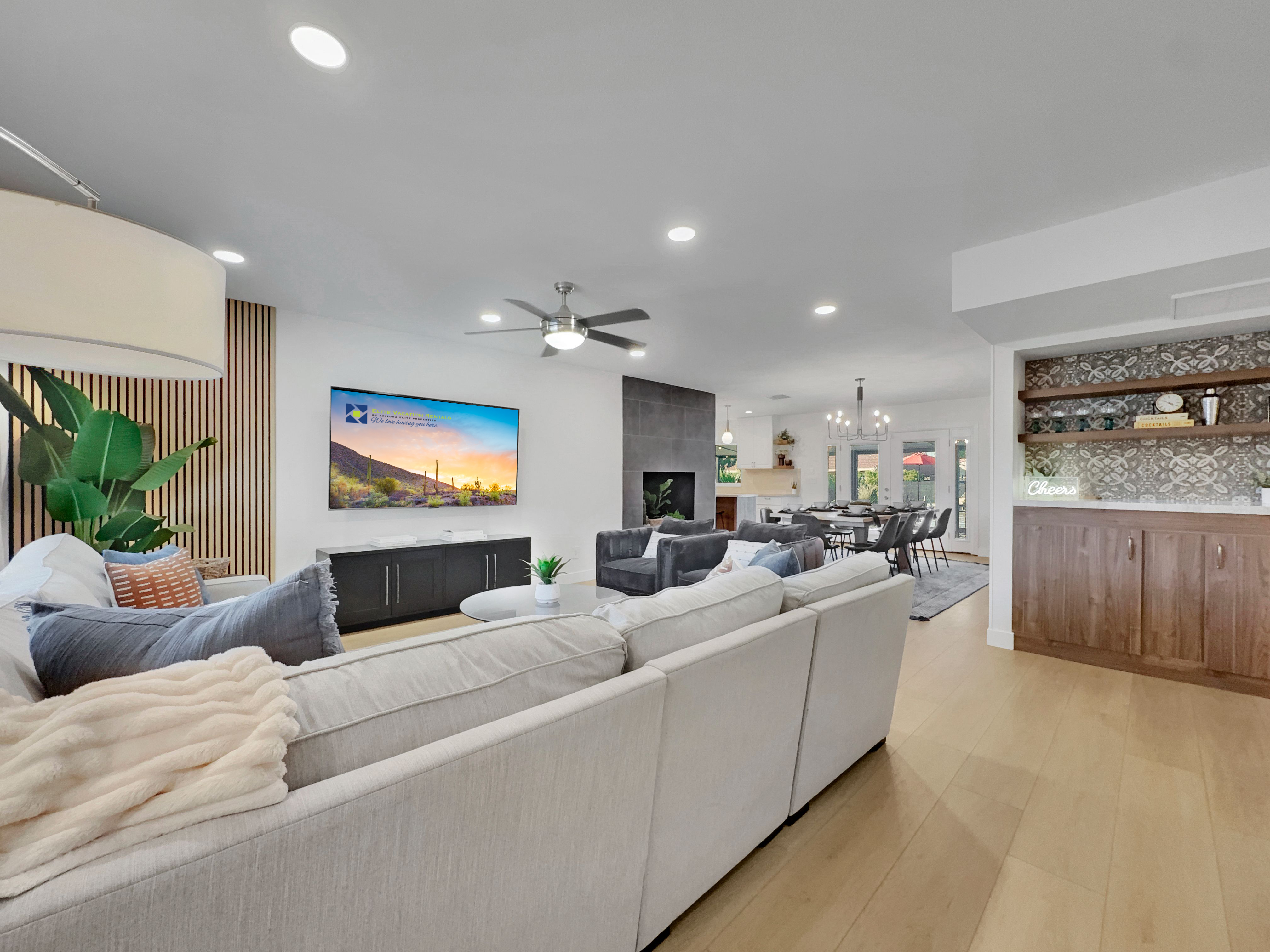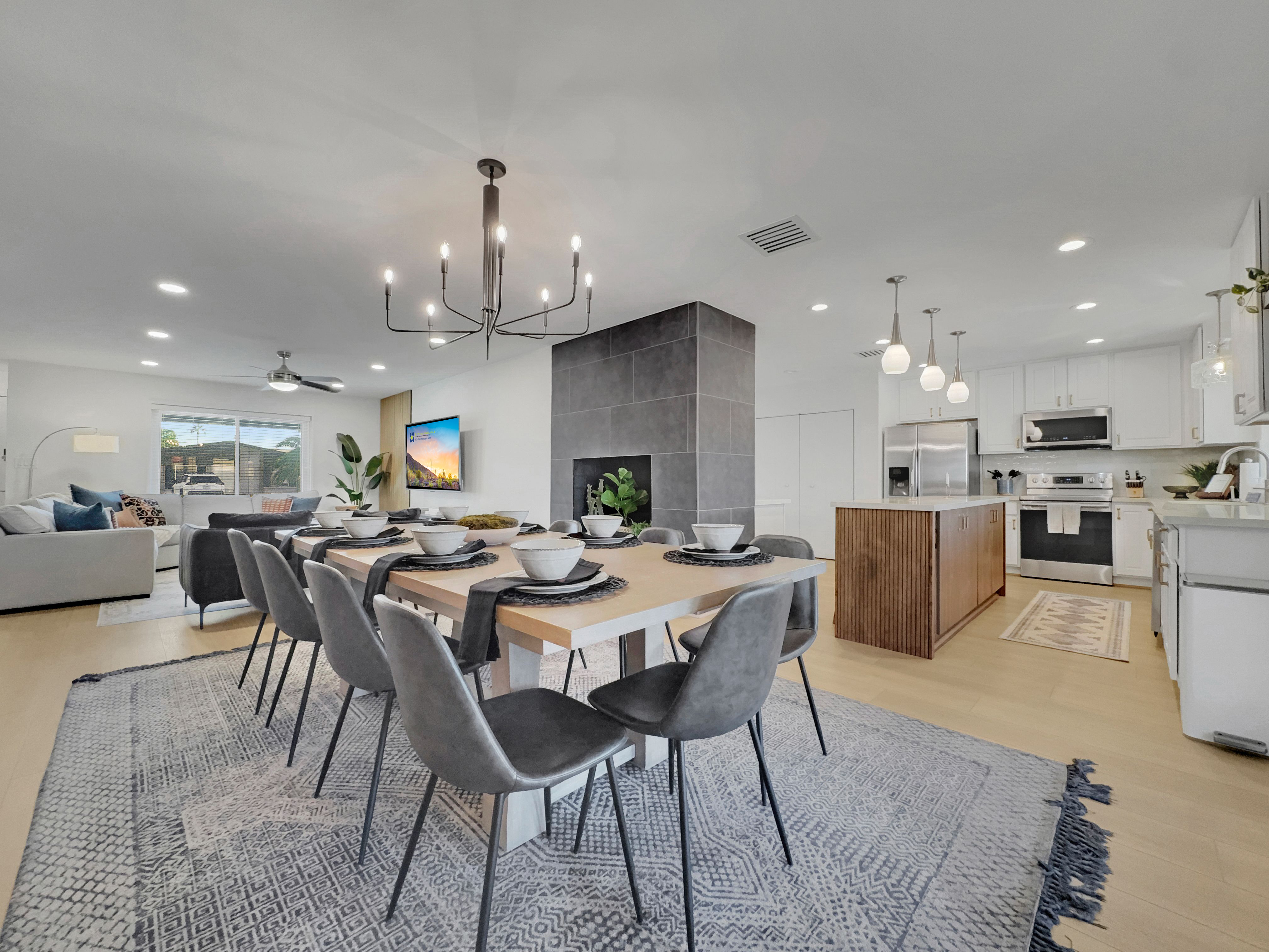 Upon entering this remodeled oasis you are greeted with a comfy oversized sectional and plush velvet chairs surrounding a large 75” TV with HuluLive. The living room is perfect for curling up to watch movies or a day full of sports. The open concept kitchen, dining, and living room with a fireplace, are updated with a modern aesthetic and perfect for entertaining. The dining table comfortably seats 10 and has a massive fully stocked kitchen for preparing meals. The pass-through kitchen window acts as a bar for ease of serving food/drinks while enjoying the covered patio with outdoor living room and smart TV.