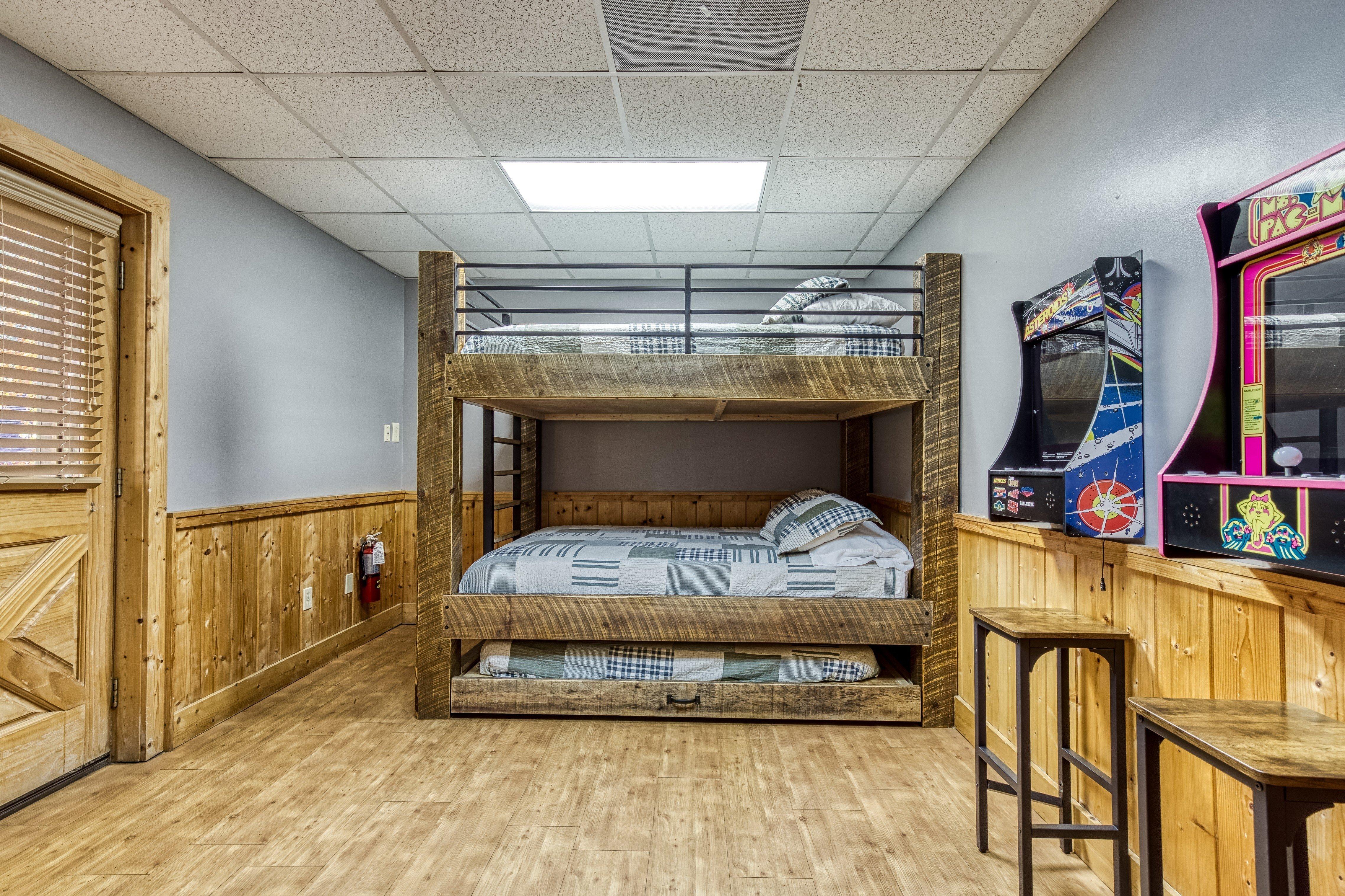 queen bunks and a trundle bed, as well as two arcade games and a TV for