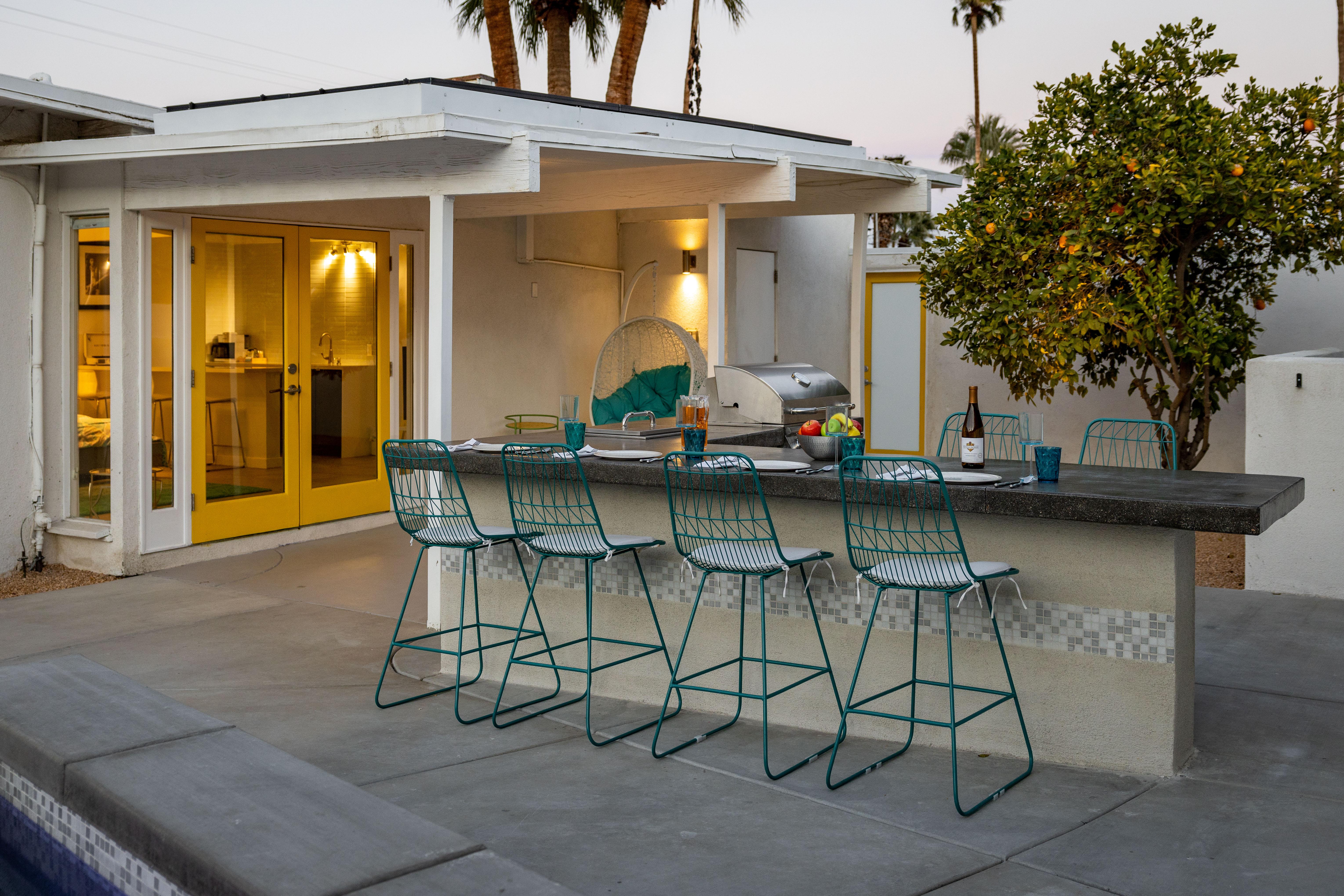 Gorgeous in its simplicity, as Mr. Alexander and his architects Palmer and Krisel intended, you’ll find clean lines, an open concept floor plan and spectacular walls of glass that let the light pour in and reveal beautiful outdoor living spaces. The living room, dining area and kitchen are all open to each other - providing enough space for your entire group to gather, relax and enjoy. The new center island kitchen is stunning with stainless steel appliances including a gas stove. Perfect for group and individual meal prep. The mid mod-inspired furnishings give the place a retro chic look while being very comfortable at the same time.