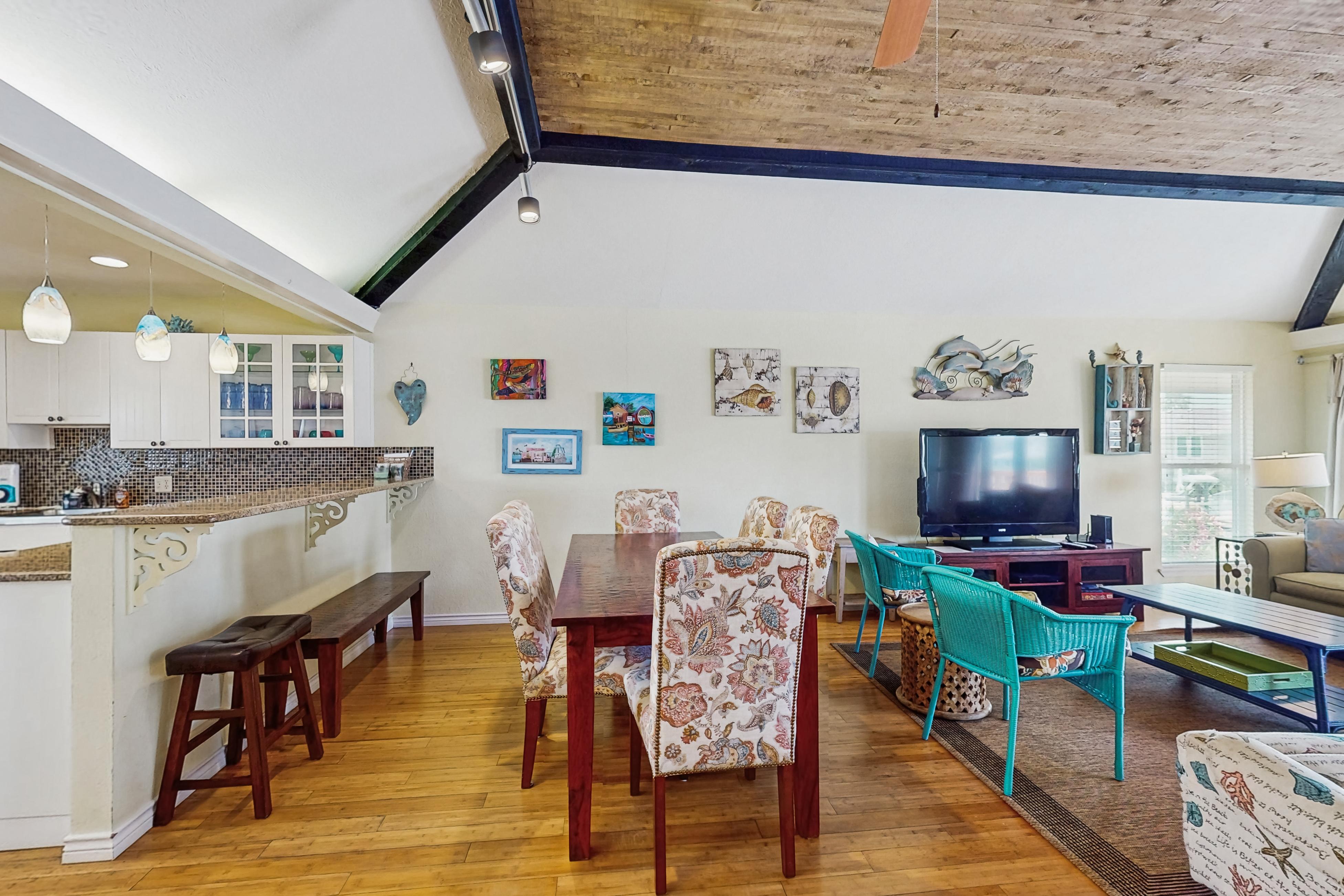 The relaxation continues indoors. The bright, open living space, with its vaulted ceilings and cheery beach-themed décor, flat-screen TV, high-speed internet, and a cupboard full of cards and board games to enjoy after a day at the beach. Take a deck of cards out to the lower deck and play while grilling burgers on the grill!