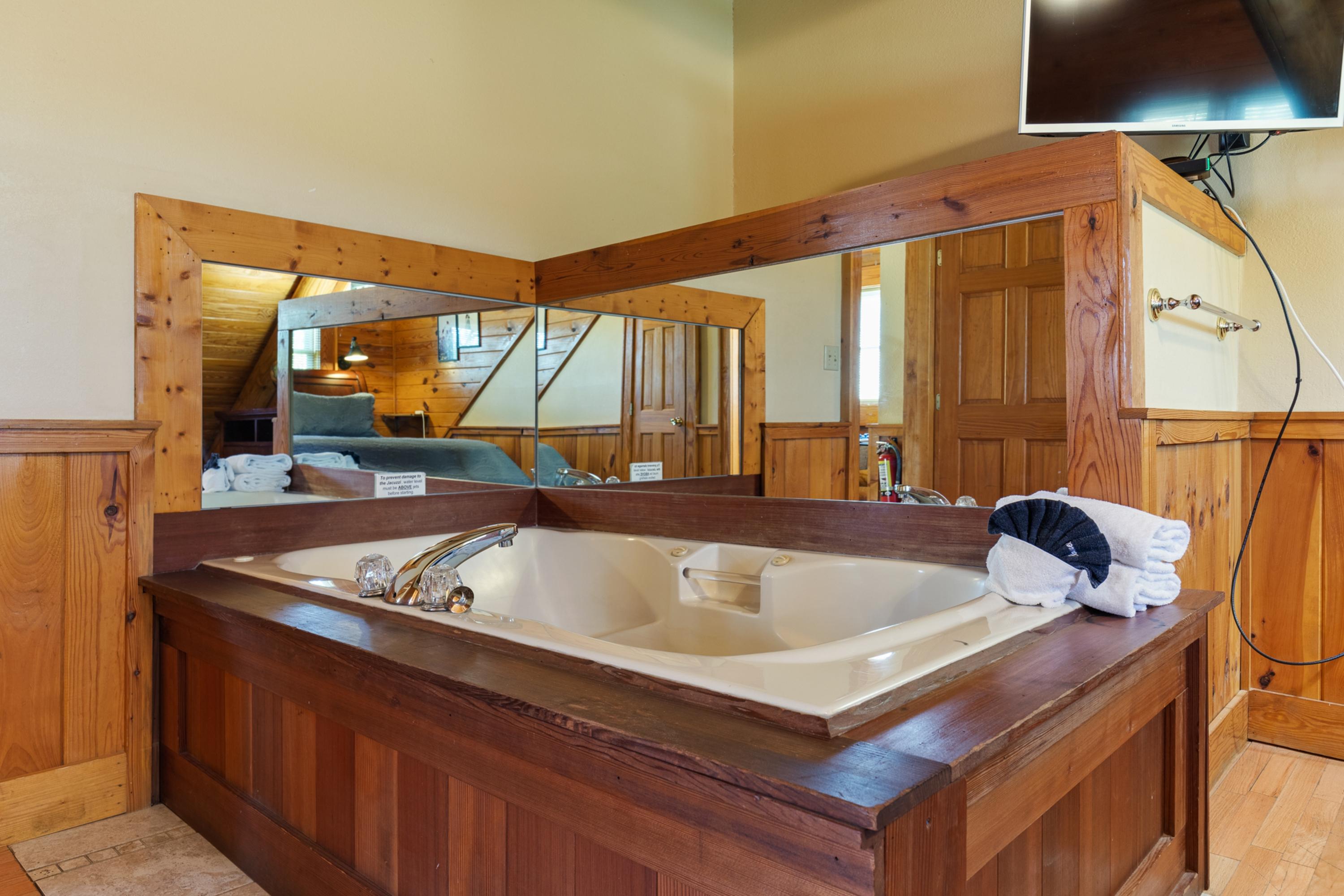Escape to a Suite at Dollywood lane, your perfect mountain retreat in the heart of Pigeon Forge! Nestled in nature, this charming cabin offers everything you need for a rejuvenating escape. Start your day sipping coffee on your private deck, taking in the serene surroundings. After a day of exploring local attractions, return to the comfort of your spacious bedroom suite, where you can unwind in a bubbling jet tub before bed.
