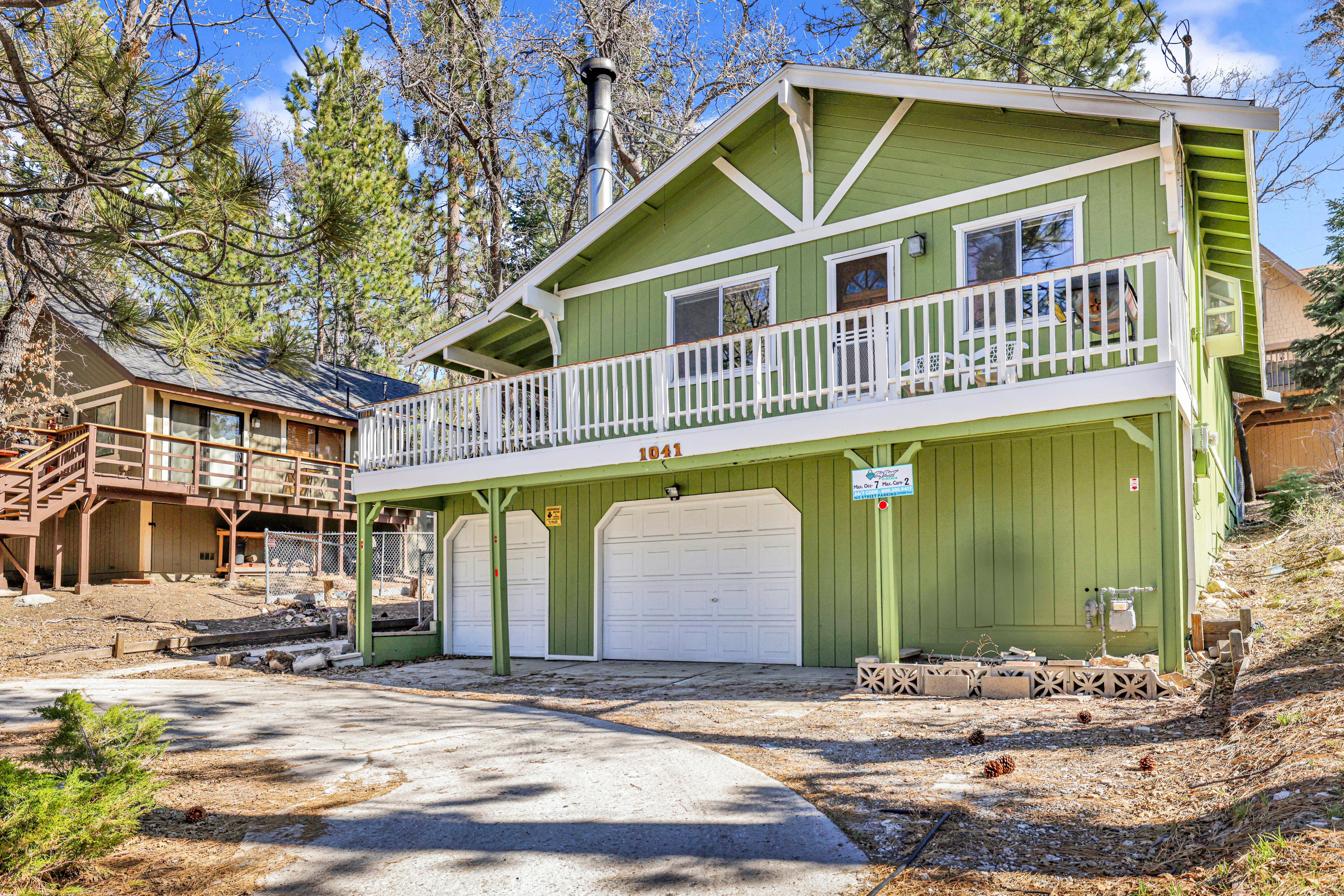 Good Times is a super relaxing and fully furnished chalet cabin located within minutes to all that Big Bear has to offer, pairing the necessities from home with added bonus amenities, you will love this spacious flat lot, full of pine trees and a fenced back yard, you will find a seasonal horseshoe pit available in the Summer months. The lower level garages are off limits to guests leaving you with a single story chalet once you climb and arrive at the top of the stairs to the wrapped redwood deck, the perfect place to enjoy the private outdoor spa and BBQ.