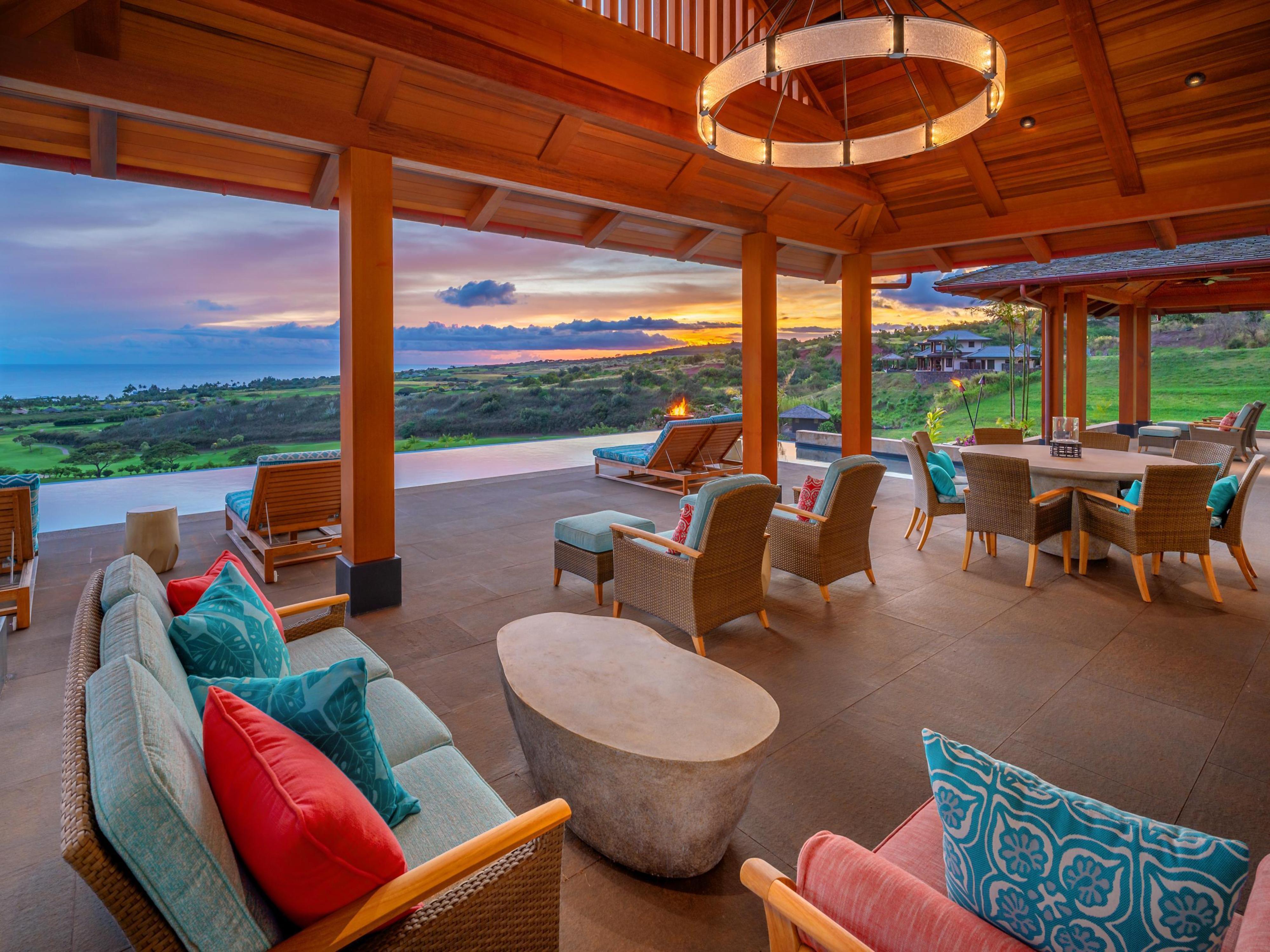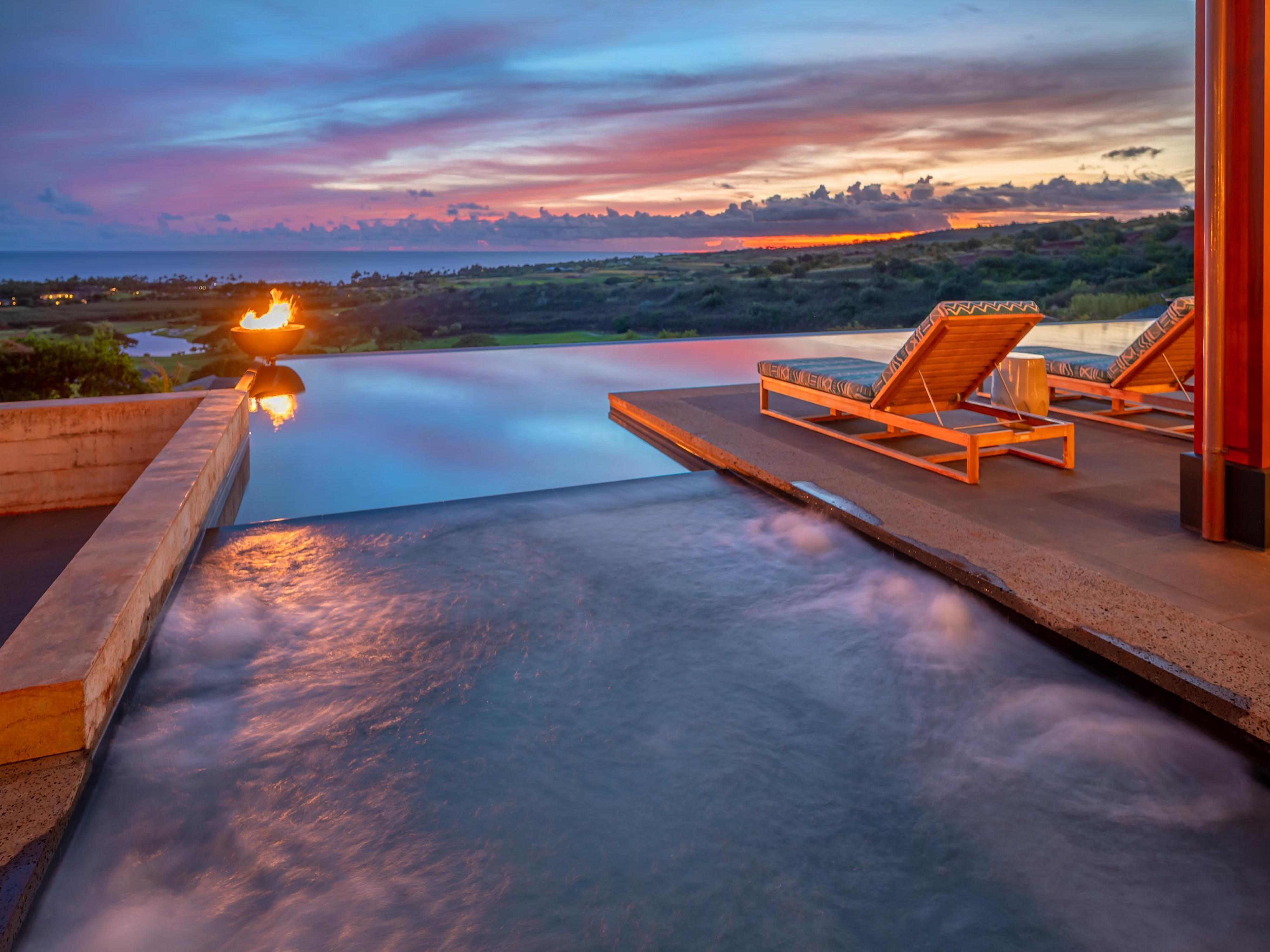 The great room features a signature vaulted redwood ceiling with exposed beams and a window wall facing the Pacific Ocean, creating an open, bright, and inviting space. The great room opens out onto a vast lanai bordering the infinity edge pool, which juts outward from its enviable elevated vantage point to offer commanding views of Kauai’s verdant landscape and the Pacific Ocean beyond. The two outward corners of the infinity pool contain fire bowls that can be lighted with the flick of a wall switch, while additional built-in tiki torches on the pool deck create a romantic tropical atmosphere to complement the chromatic south shore sunsets and bring light to the evenings.