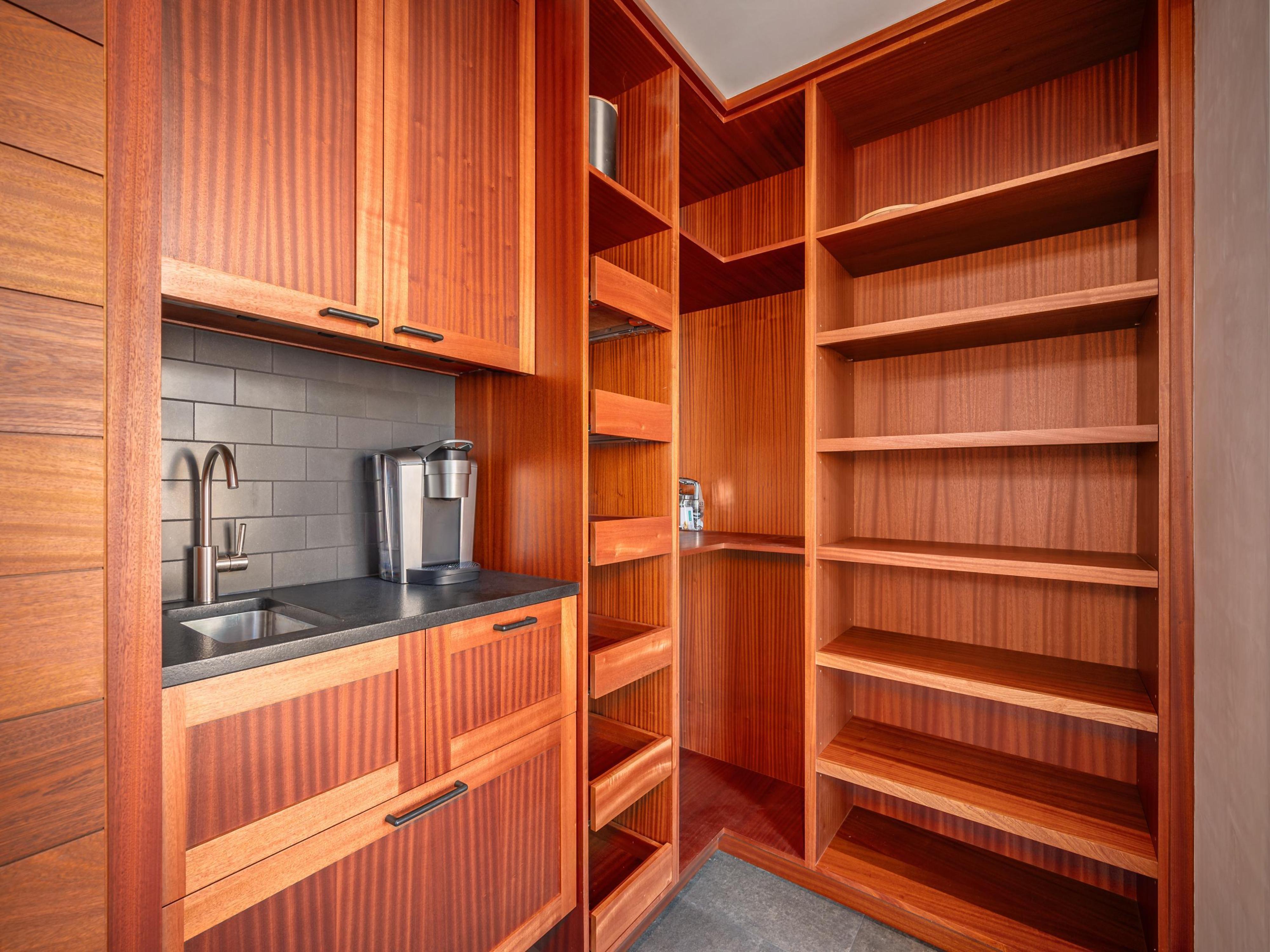 The kitchen meets the needs of the most demanding home and professional chefs alike with its array of luxury appliances, including a Wolf range and oven, a Sub-Zero refrigerator-freezer, a wine refrigerator, a warming drawer, and a Miele whole bean coffee system.