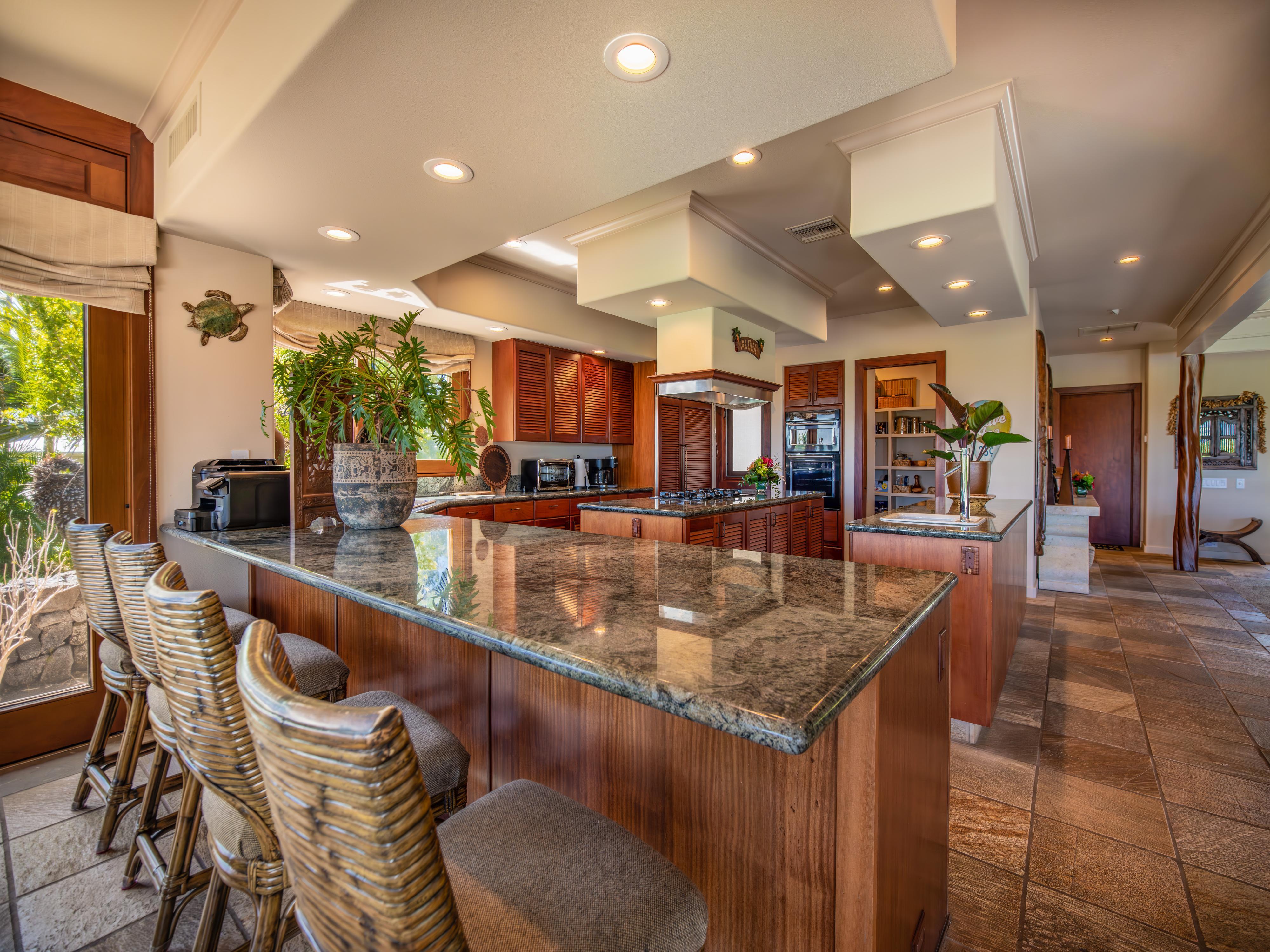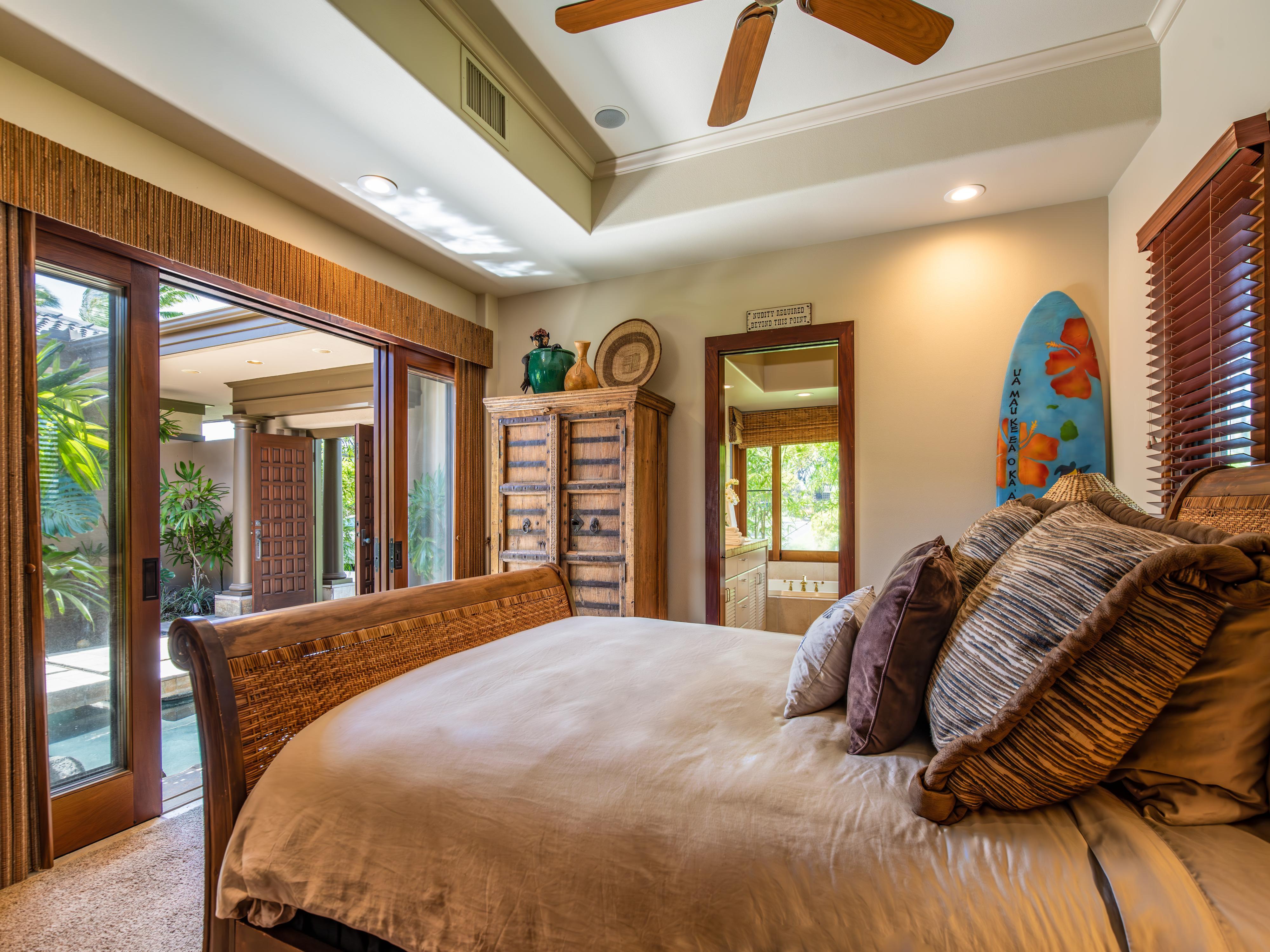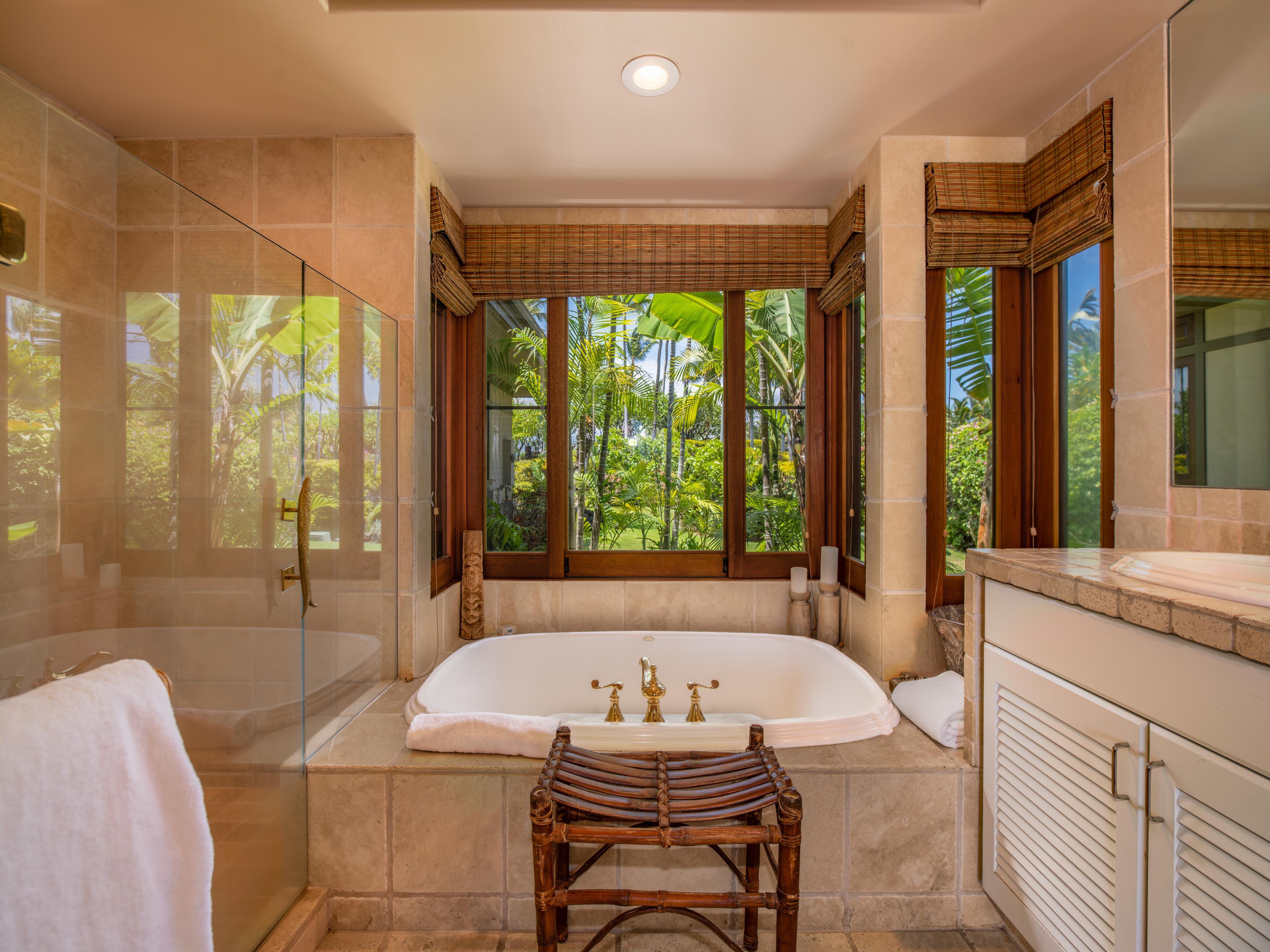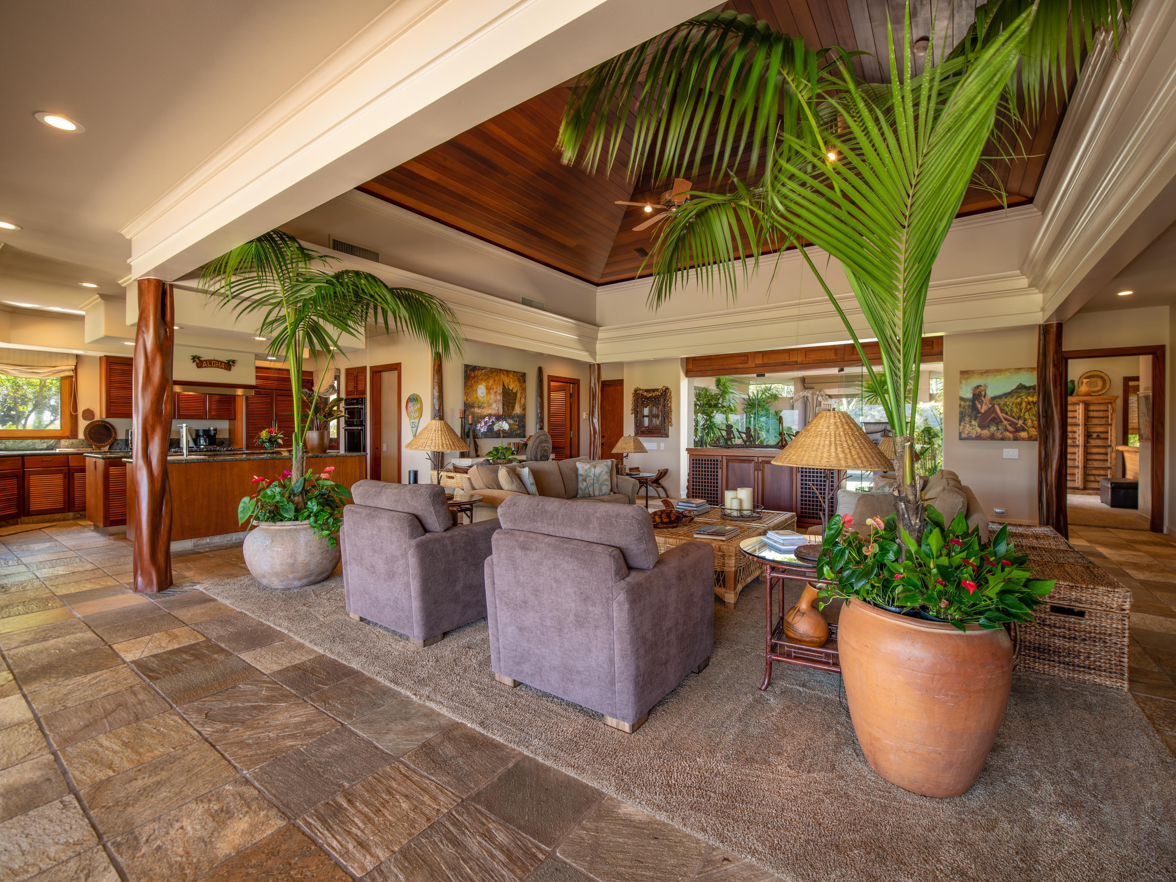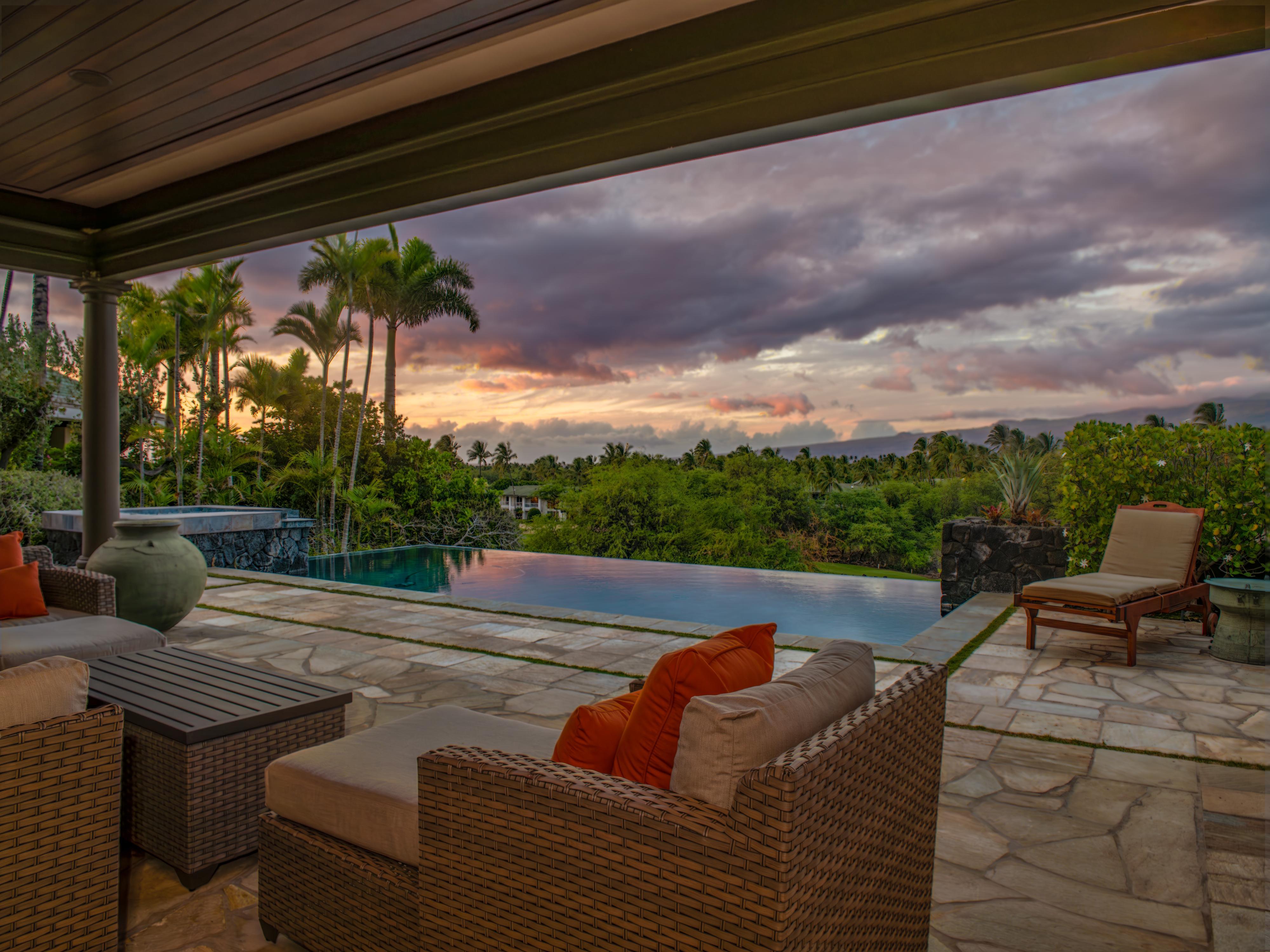 After a day of exploration, unwind in the infinity pool or soak in the soothing waters of the jacuzzi. With four chaise lounge chairs, outdoor sofa, and two chairs with ottomans, there’s room for everyone. Whether you're basking in the warm Hawaiian sun or stargazing under the night sky, the outdoor amenities of this home provide the perfect backdrop for relaxation and tranquility.