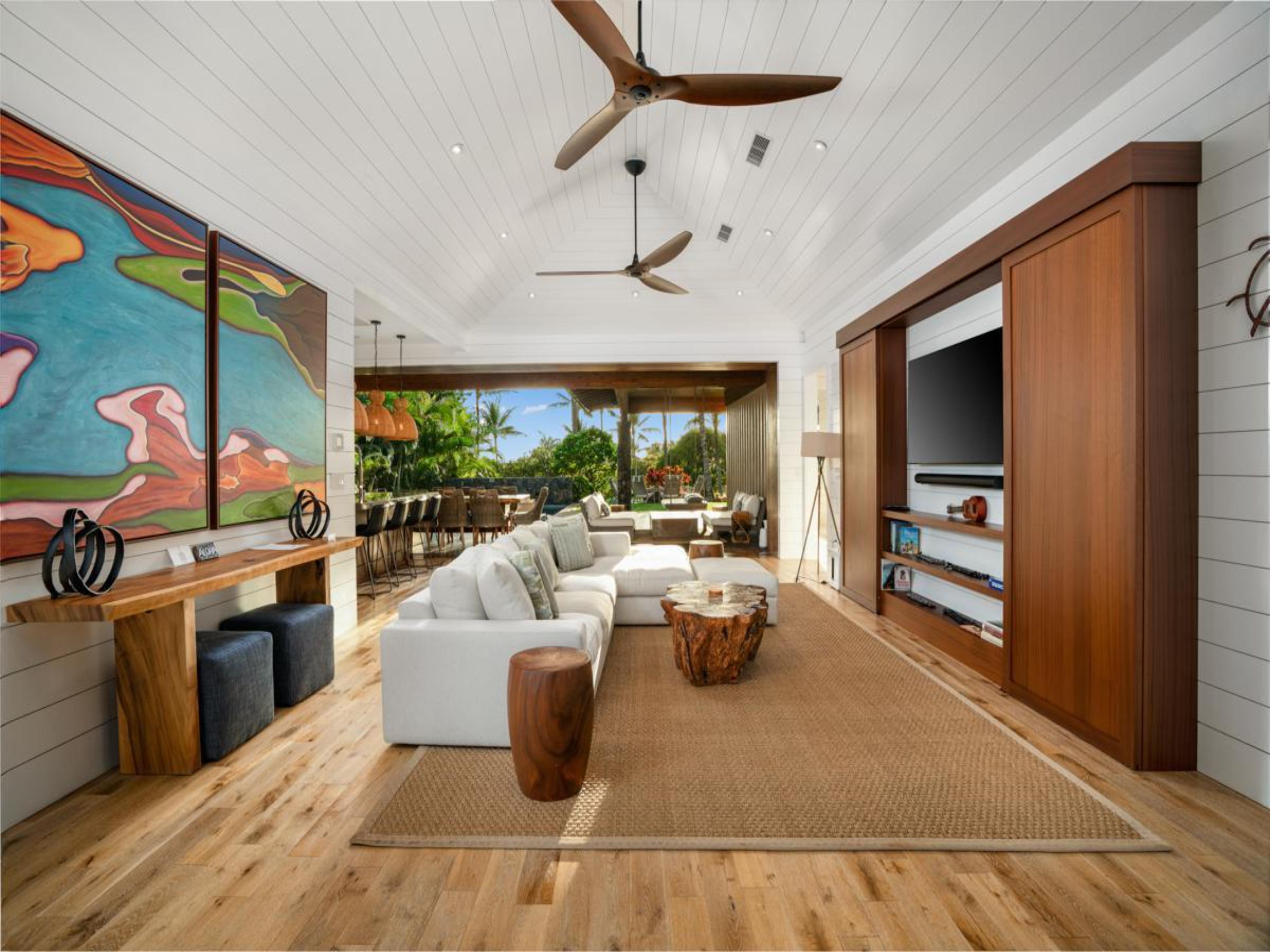 Hale Wa'a boasts an impressive indoor/outdoor living experience, with a spacious great room that flows effortlessly onto a covered lanai through expansive glass pocket doors. The bright white interior, vaulted ceilings, and comfortable furnishings create an atmosphere of relaxation and renewal, complemented by the cool trade winds that naturally ventilate the home.