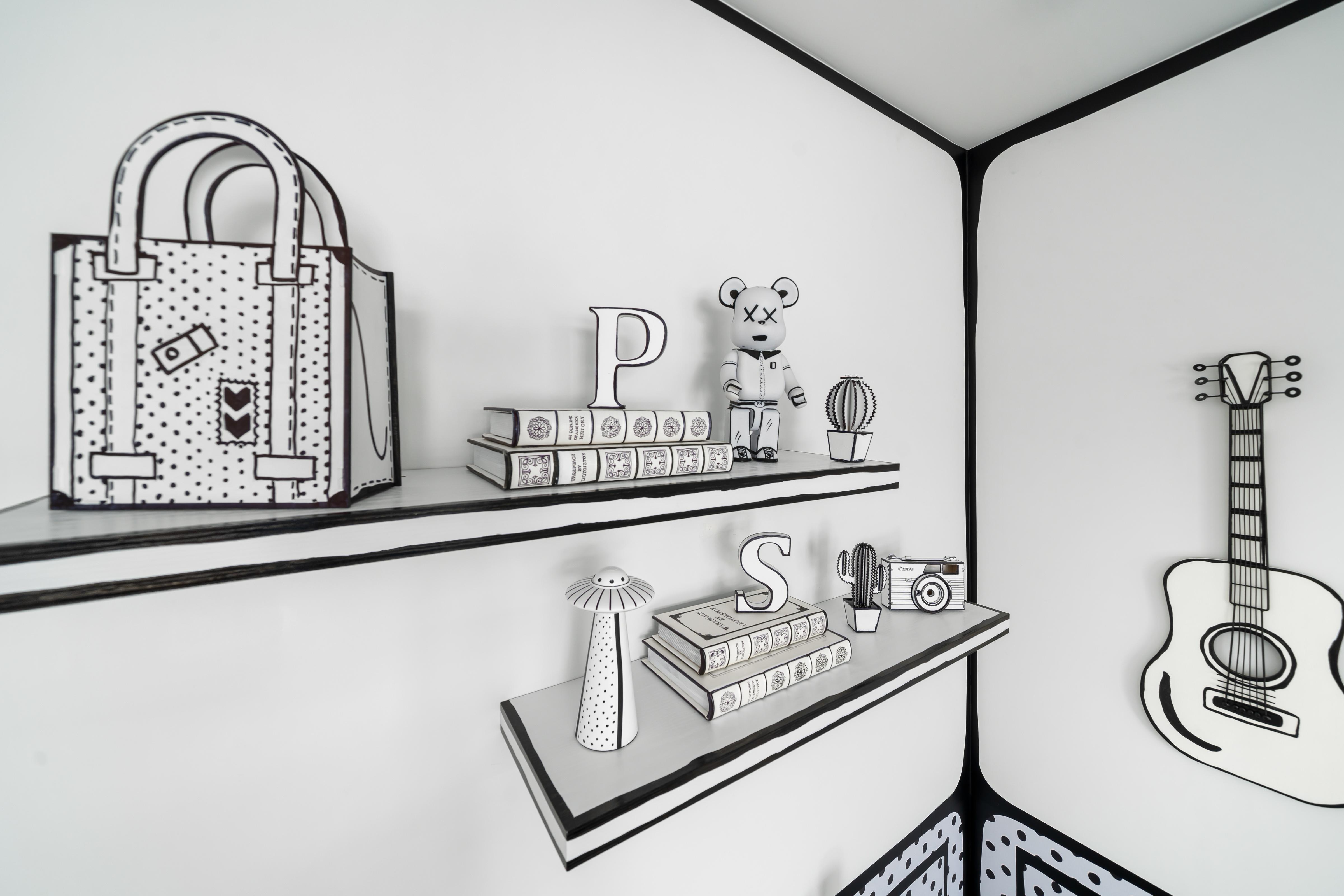 Save the casita, or “2D Room,” for those in your group who’d most like to wake up in a cartoon. Containing a Queen sized bed, this space is a trompe l’oeil from top-to-bottom. It is completely black-and-white and looks as though it’s been ripped from the pages of a sketchbook. Everything from the fan to the wainscoting has been carefully designed to appear two-dimensional. This room has its own ensuite (and, yes, it’s “2D,” too).