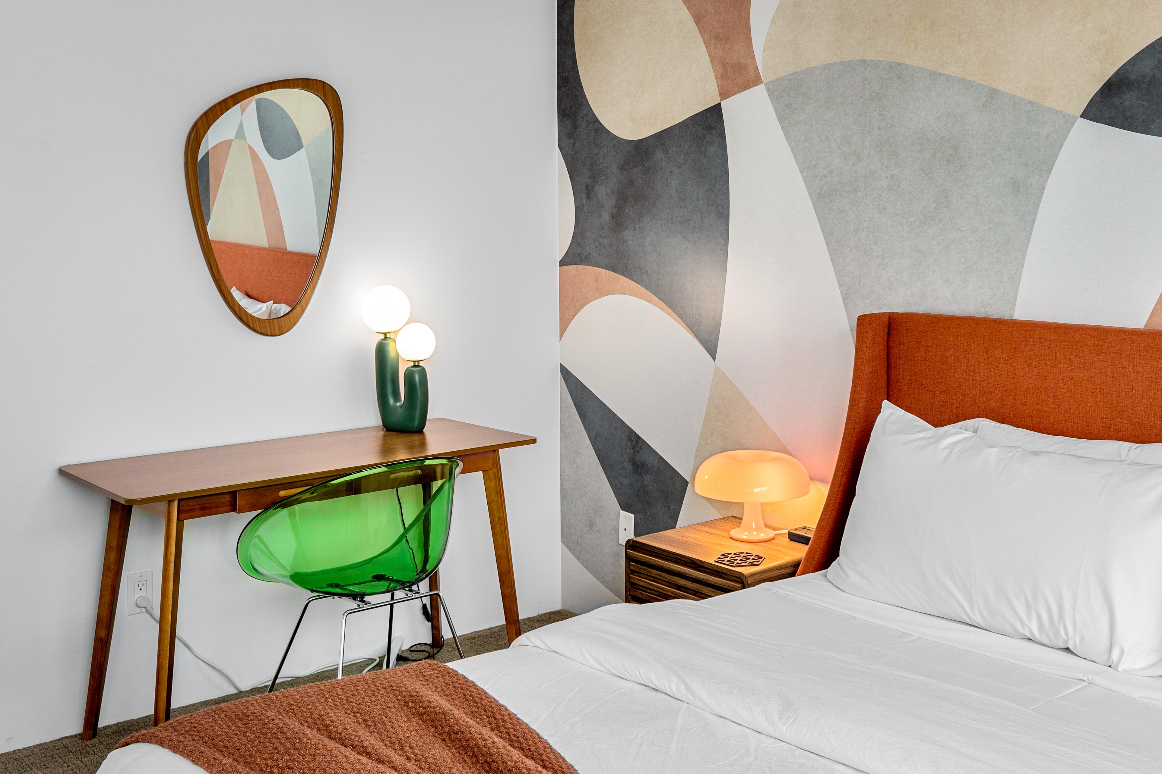 The Orange Room, with its bright mural and slightly 70s vibe shares a jack-and-jill bath with The Green Room, whose decor is midcentury with Jazz Age flourishes. Both rooms contain King sized beds.