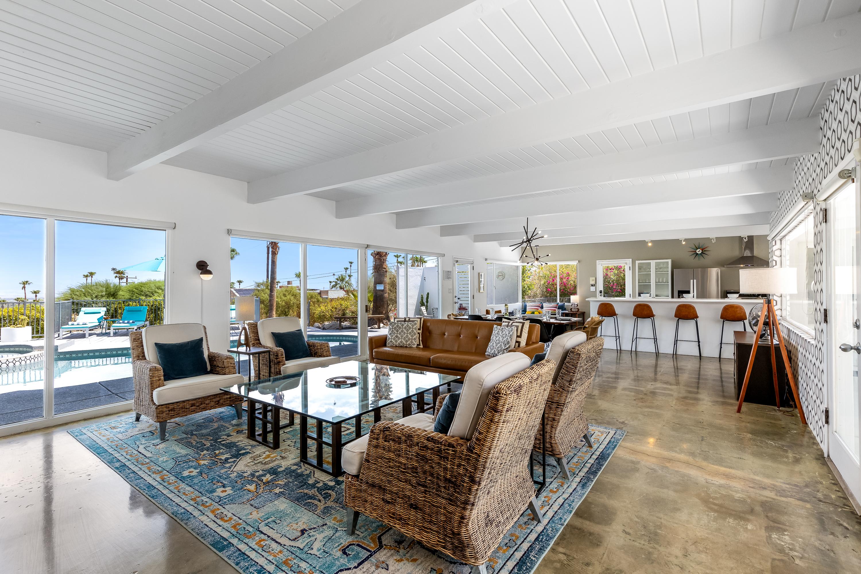 This charming and luxe property is a true nod to 1950s Palm Springs. The living/dining area is a guest favorite, with walls of glass on both sides creating a quintessential indoor/outdoor feel. Share meals at the large dining table or curl up in the corner nook, perfect for kids, reading, and puzzles. The gorgeous modern kitchen features modern appliances but original doors, windows, and cabinetry that evoke the 50s vibe. It is equipped with state-of-the-art stainless steel appliances, cooking utensils, and spices, making it simple to prepare meals. The kitchen's colossal countertop and breakfast bar for four offer plenty of space for casual morning coffee and breakfast. Gather around the 8-person dining table for a tasty meal, or step onto one of two patios to enjoy al fresco dining under the stars.