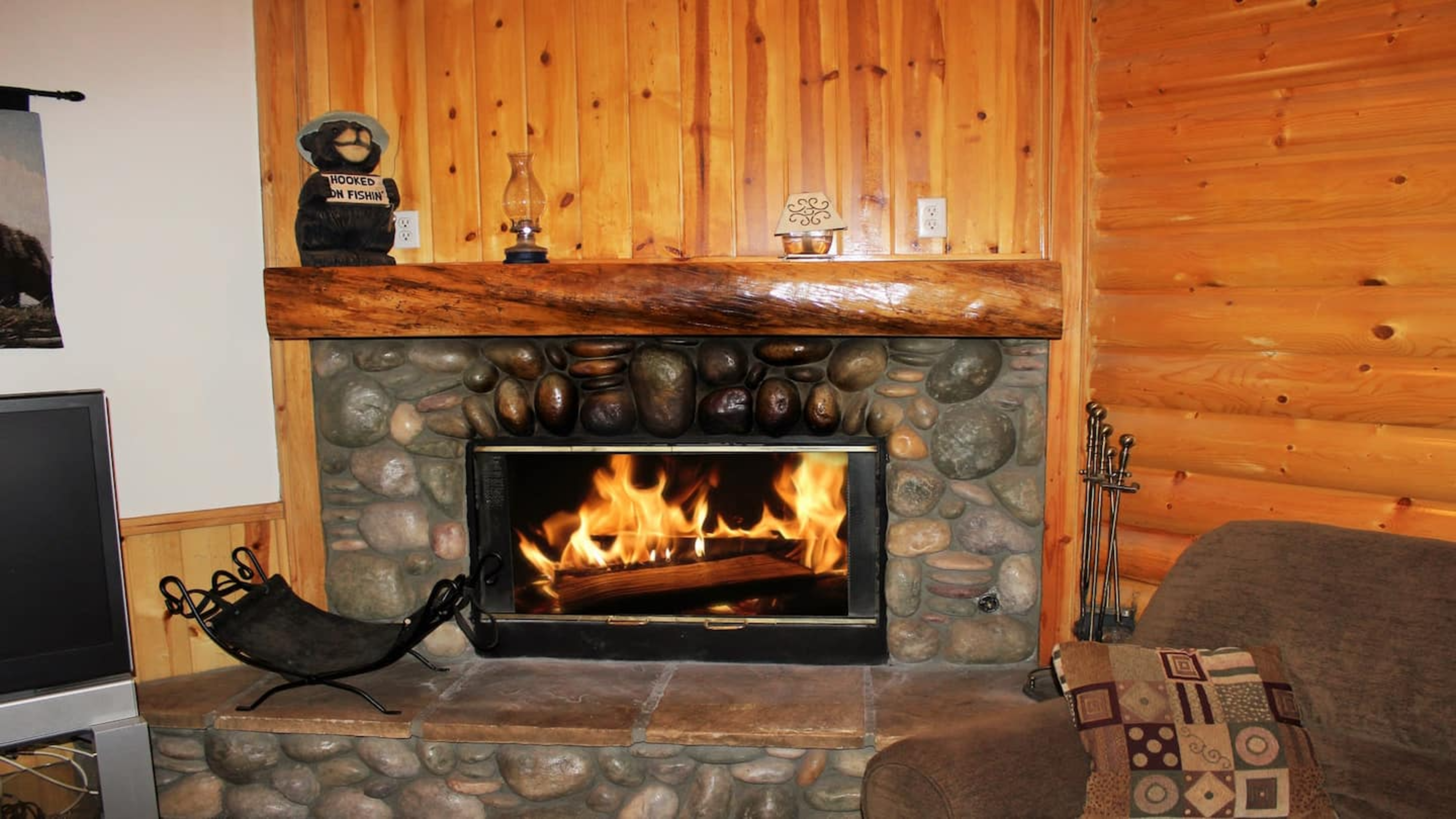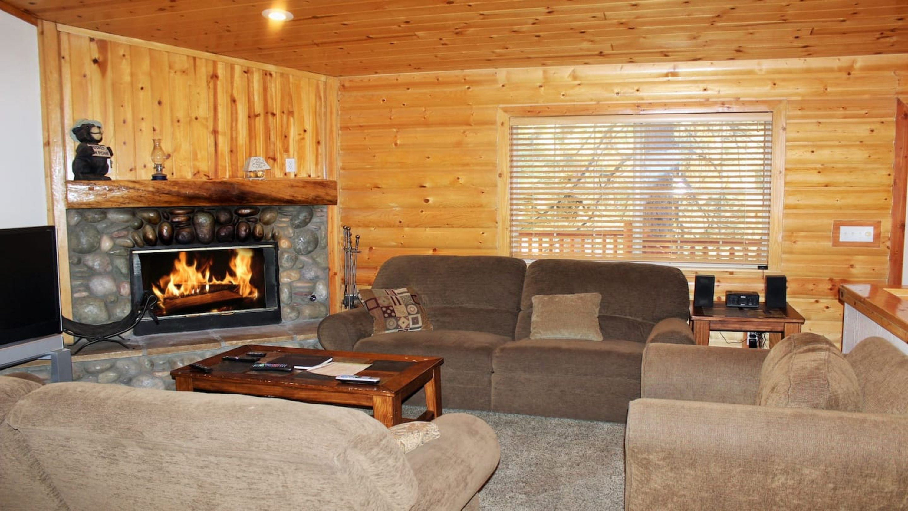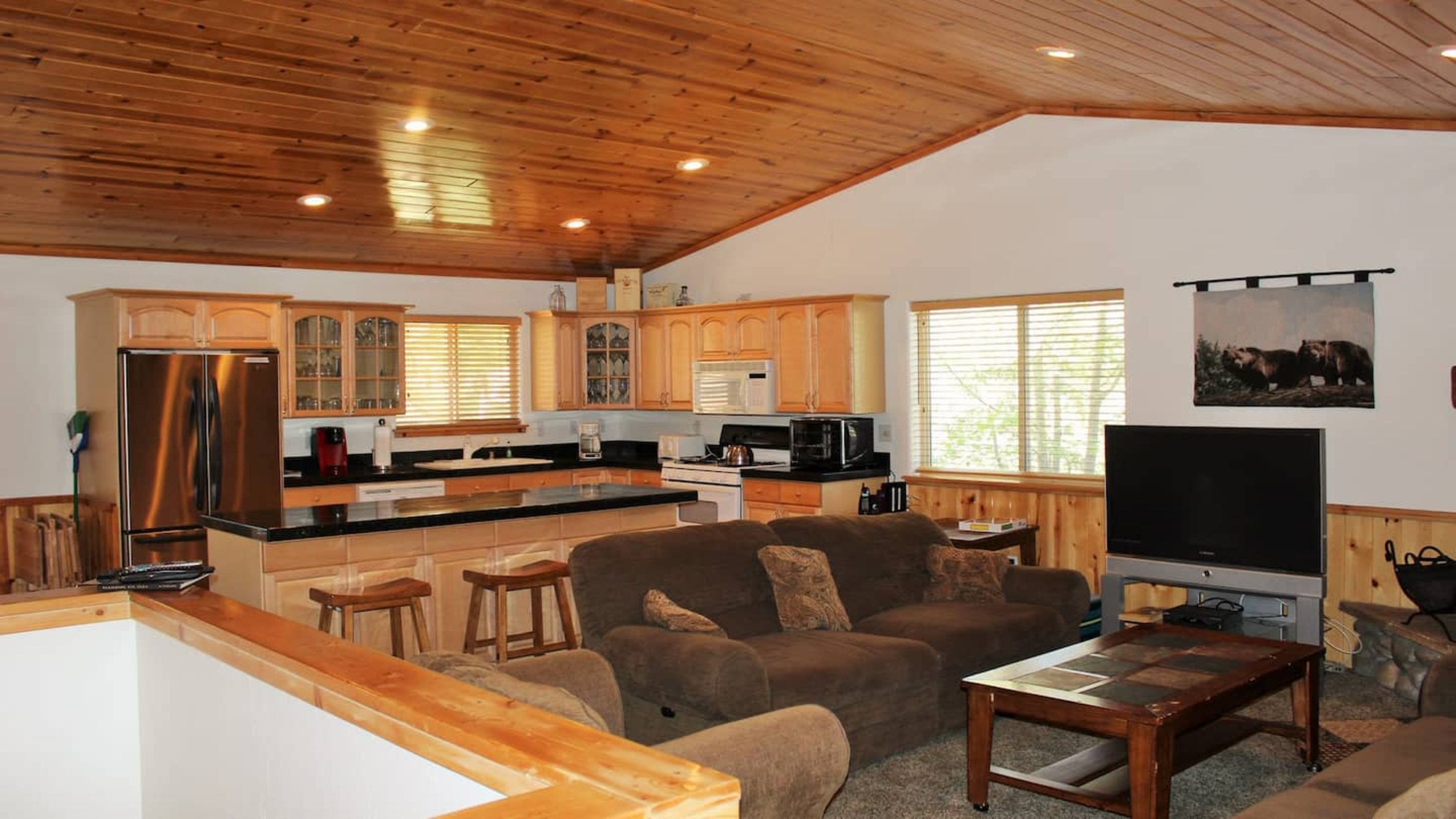 This custom-built 4-bedroom retreat has everything you need for a relaxing and fun-filled getaway. The cozy living room invites you to unwind by the wood-burning fireplace, enjoy a movie on the large flat-screen TV, or simply sink into the plush seating after a day outdoors.