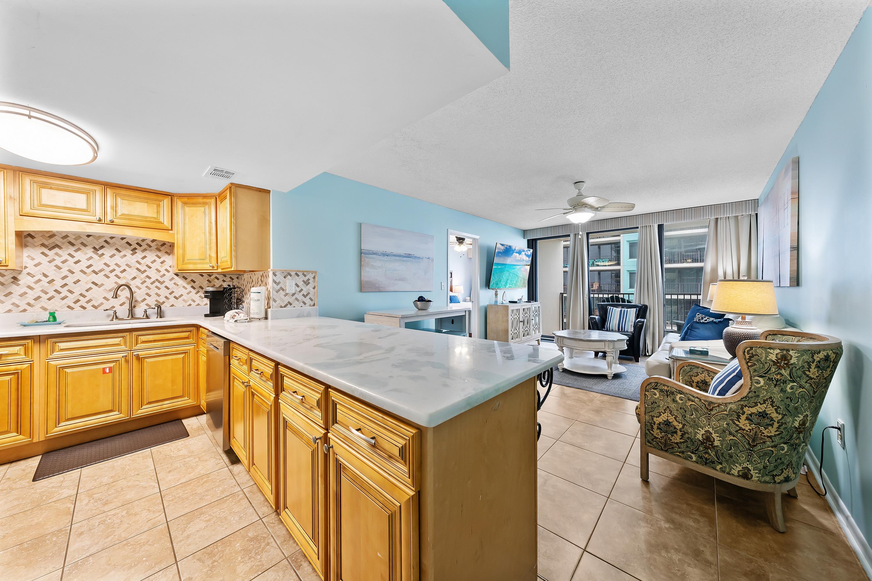 Step inside and enjoy a cozy, coastal-inspired living space with floor-to-ceiling windows and a private balcony, ideal for sipping morning coffee or watching the sunset melt into the waves. The fully equipped kitchen has everything you need to prepare meals after a day at the beach, while the open layout invites conversation and relaxation.