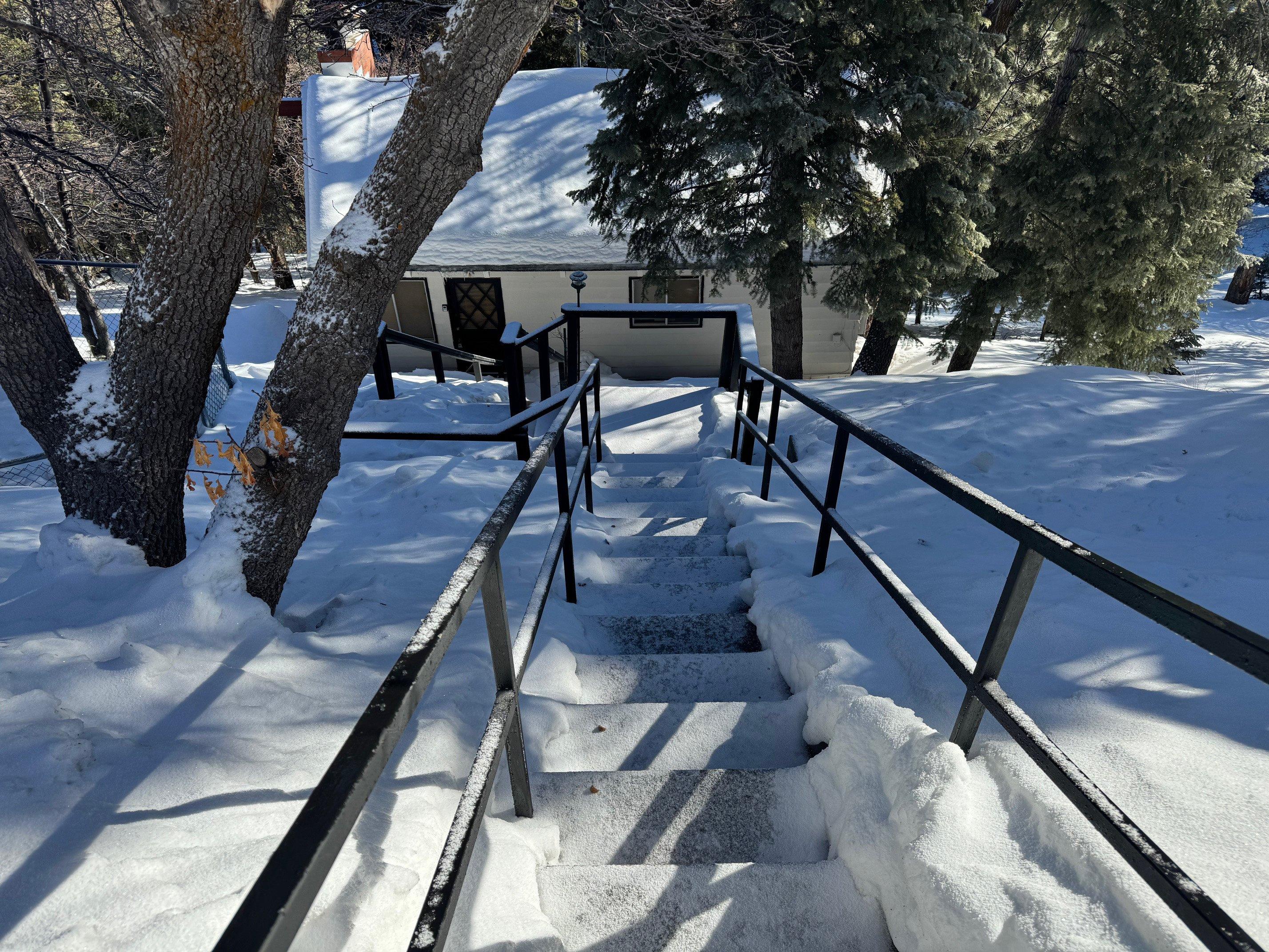 Cut into a mountainside, staircase leading down to the front door, this bi-level chalet-style cabin features breathtaking views of the treetops from your own private deck. Nestled in the heart of the Moonridge community, this cabin offers the perfect blend of mountain living and local convenience. Enjoy your morning cup of coffee on the deck soaking in the fresh mountain air. Step inside to discover a cozy haven adorned with rustic charm and comfort.