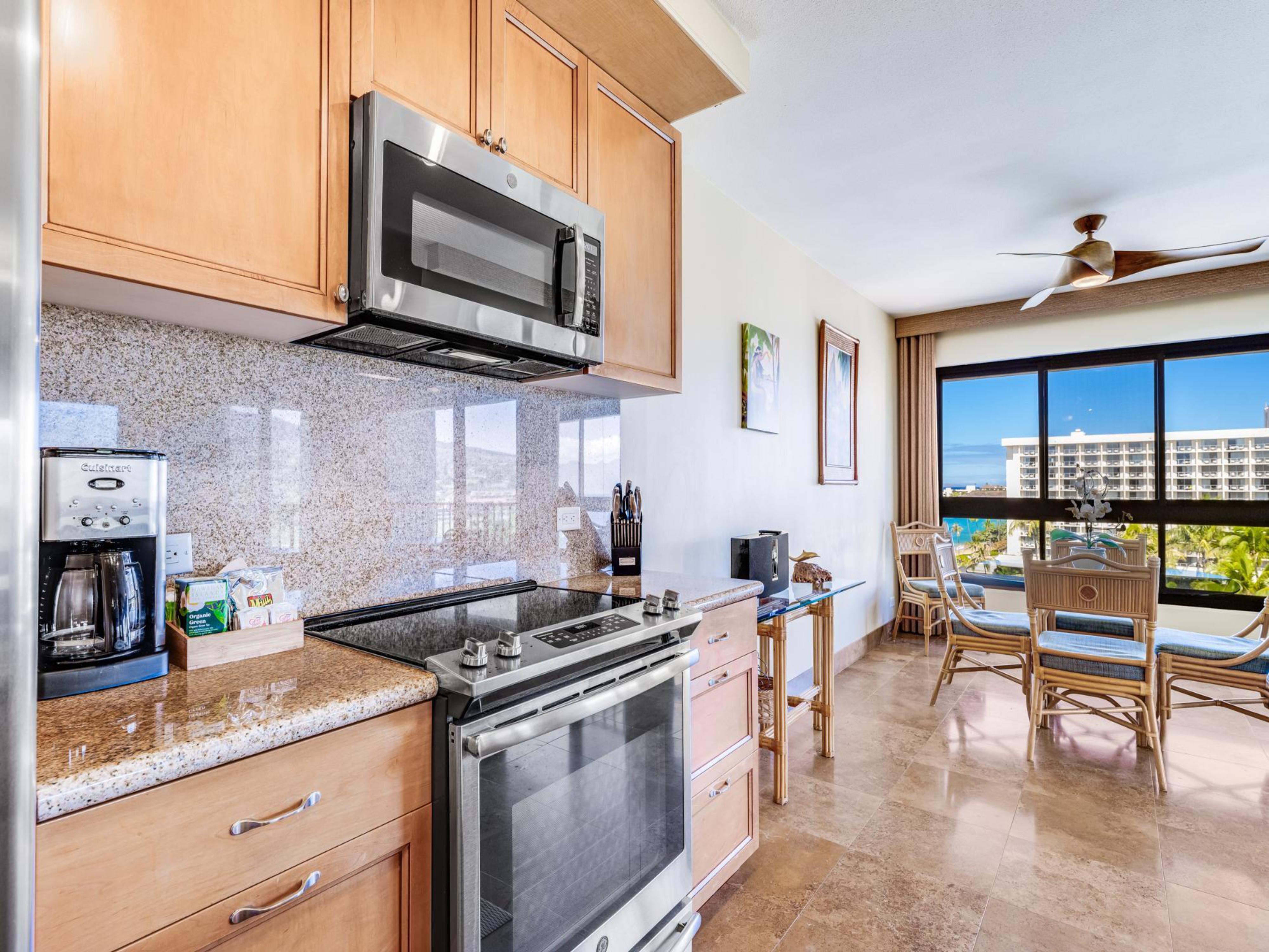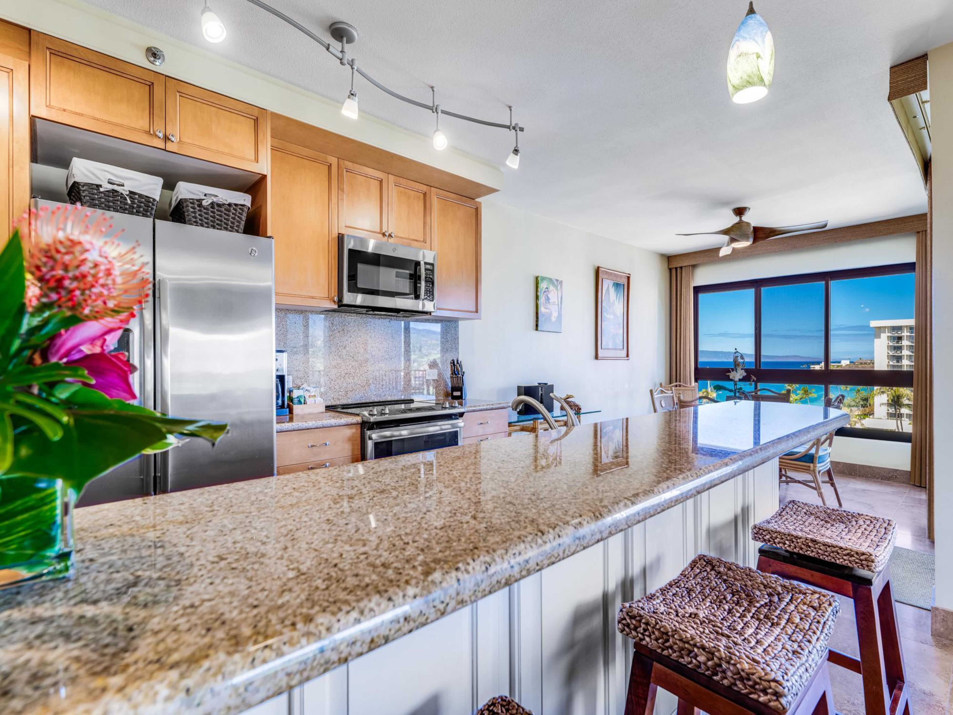 Inside, the residence features uniquely Hawaiian décor that adds warmth and authenticity throughout. The fully equipped kitchen includes light cabinets that brighten the space and create an inviting atmosphere for preparing meals or entertaining. The open-concept living area flows seamlessly onto a private lanai, where you can enjoy partial ocean views and the lush surroundings.