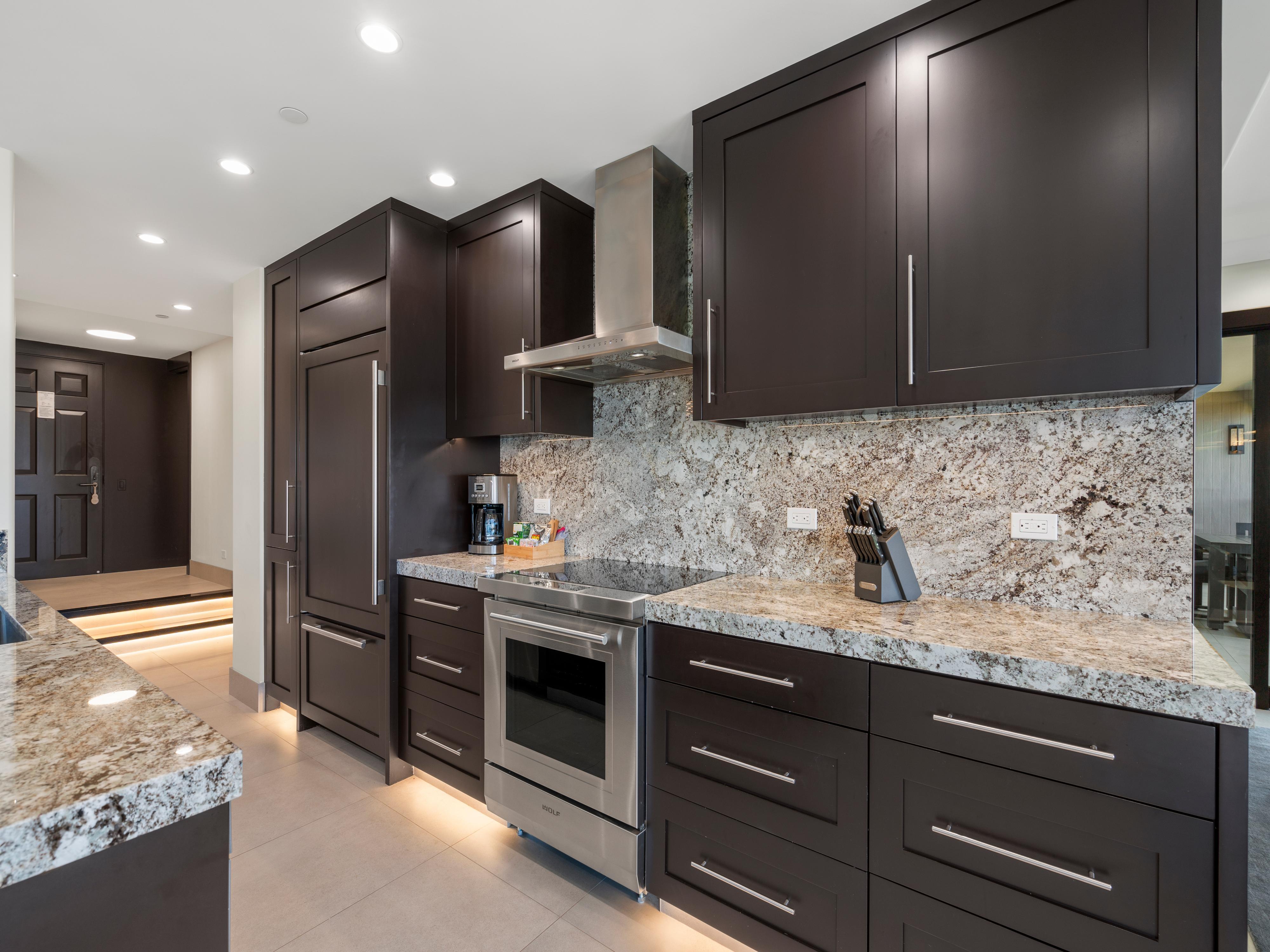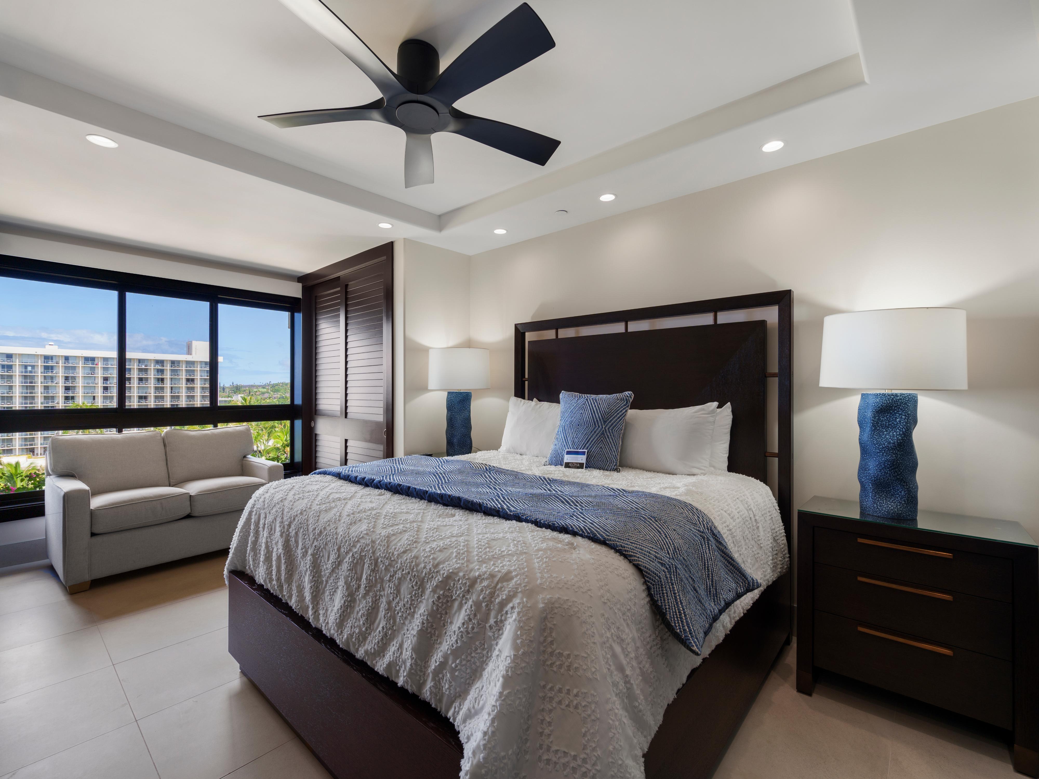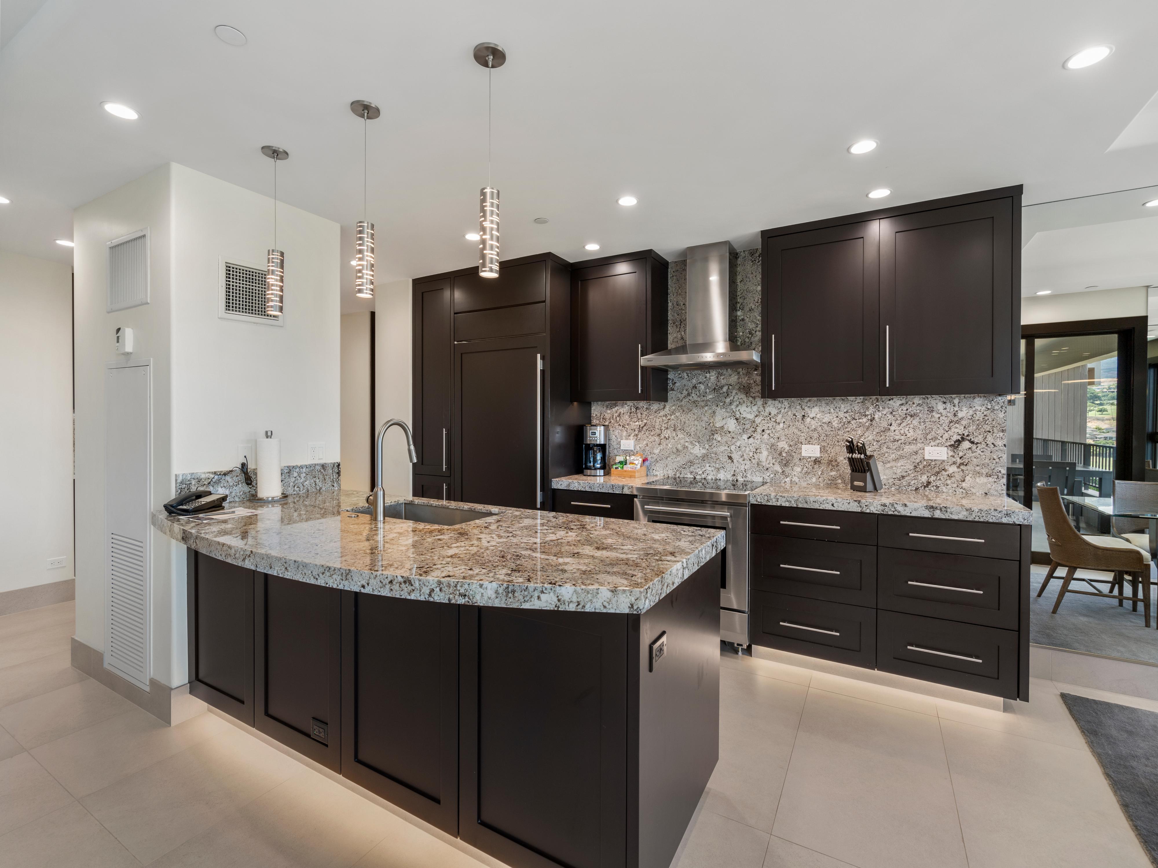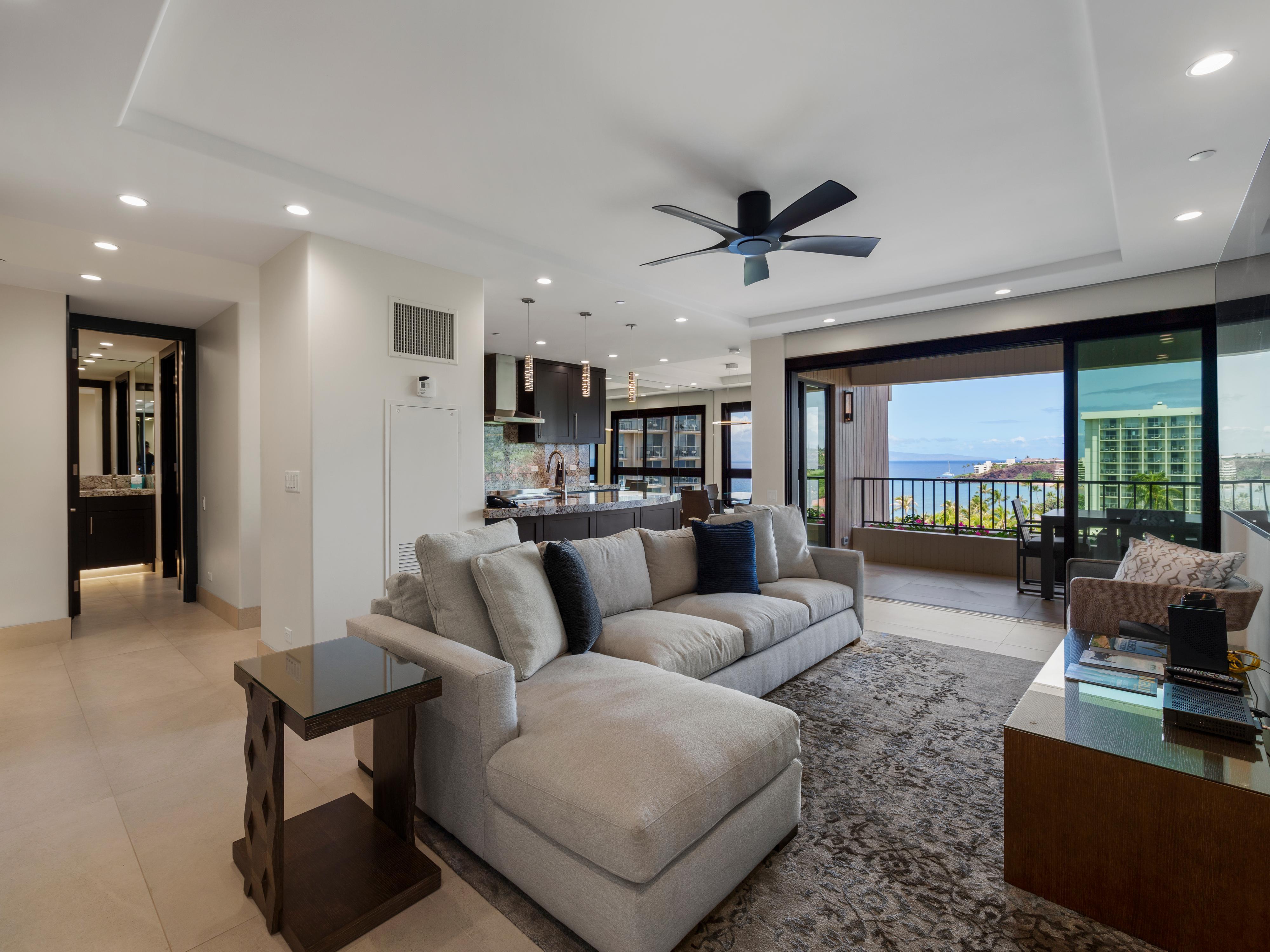 Inside, the residence is elegantly appointed with a modern island-inspired palette of greys, dark brown finishes, and vibrant blue accents. Spacious living areas provide plenty of room to unwind, and the well-designed layout makes it easy to entertain or spend quality time with family and friends. With comfortable bedrooms, thoughtfully designed spaces, and a prime beachfront location, condo 1103 delivers a refined and relaxing Maui getaway.