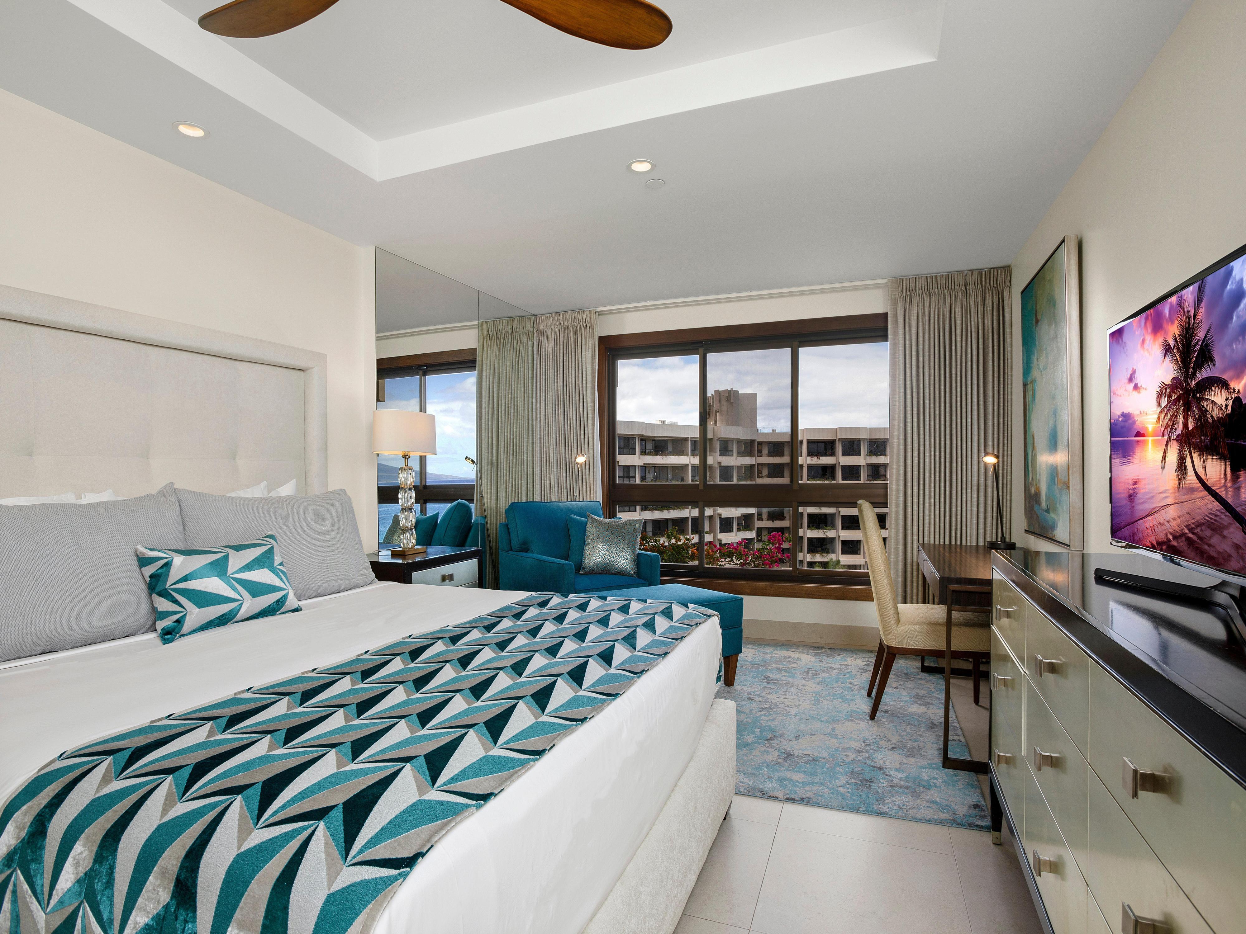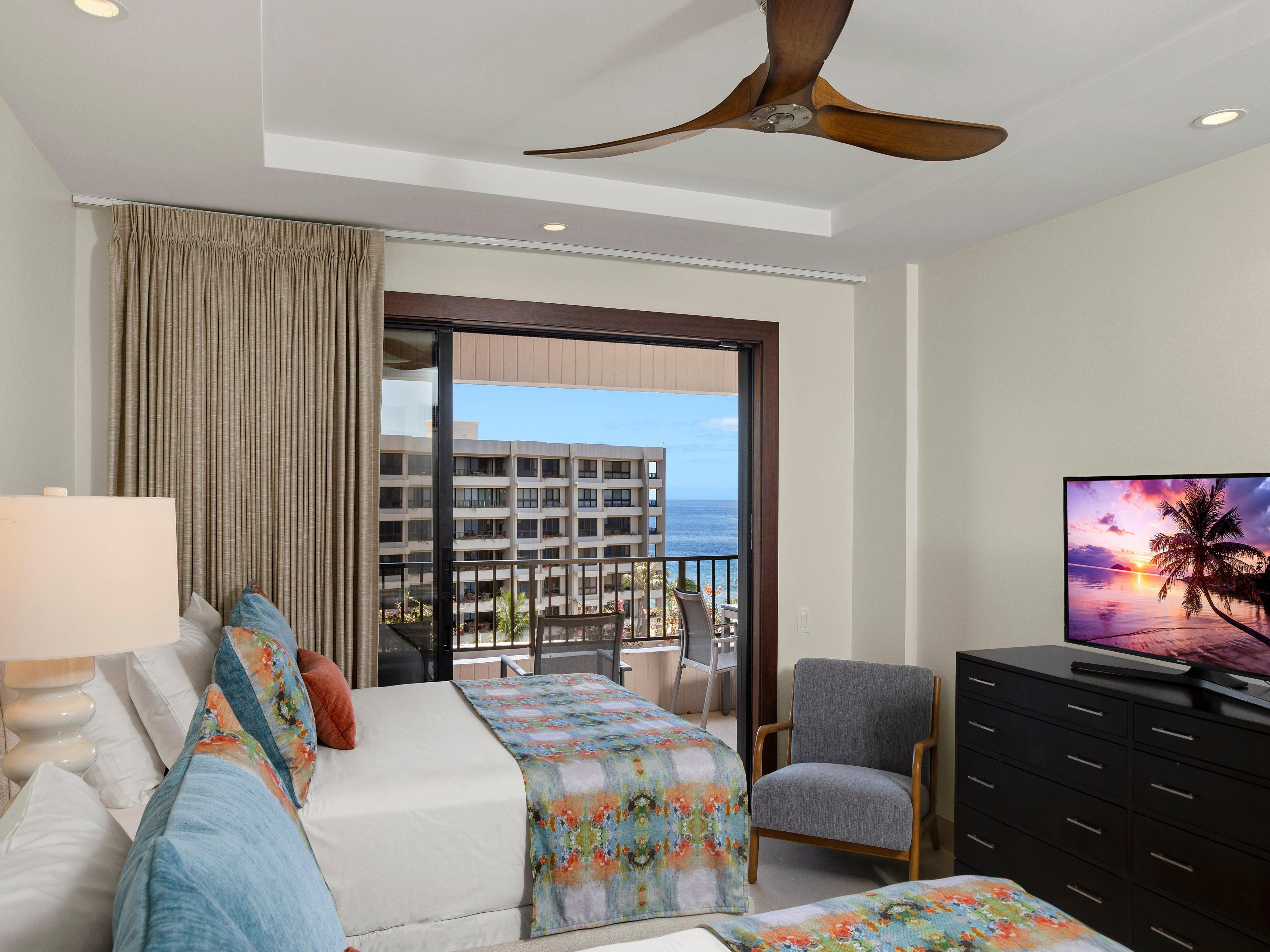 The second bedroom includes two full-size beds and opens directly onto the lanai, while the primary suite features a king bed, a cozy seating area, and a workspace framed by wide windows overlooking the water.