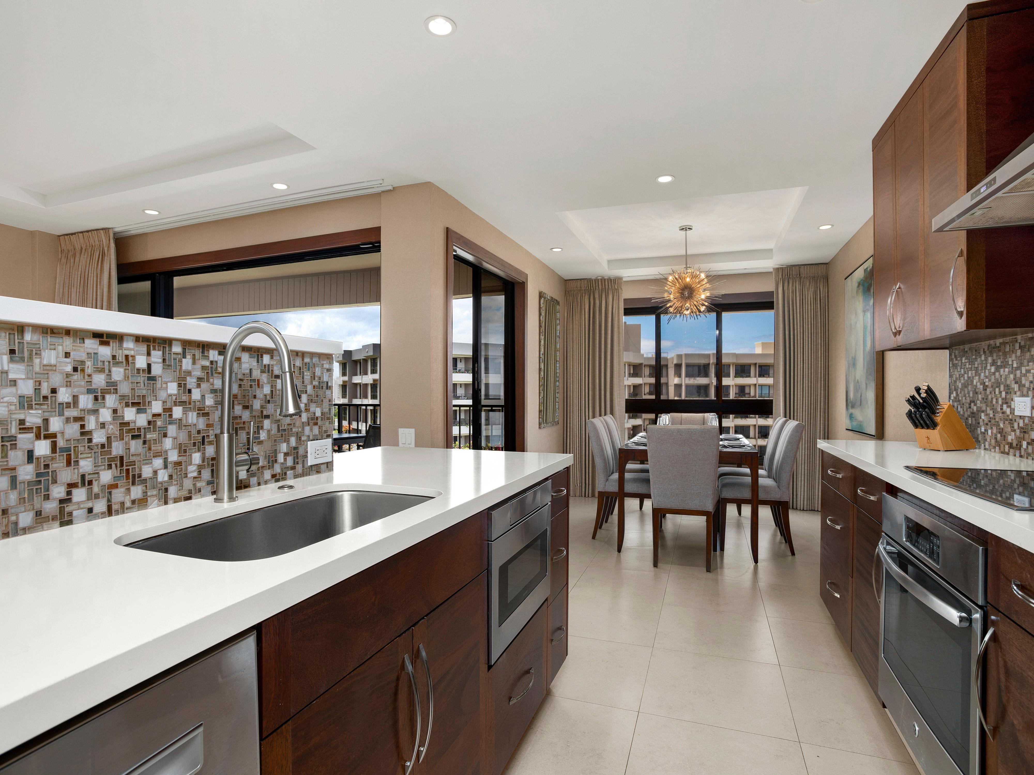 The open-concept layout makes entertaining effortless. The gourmet kitchen boasts modern appliances, bar seating, and ample counter space for preparing island-inspired meals. Enjoy dinner at the elegant table for six or step out to the expansive lanai, where ocean views come without the afternoon glare—ideal for sunset dining over the Pacific.
