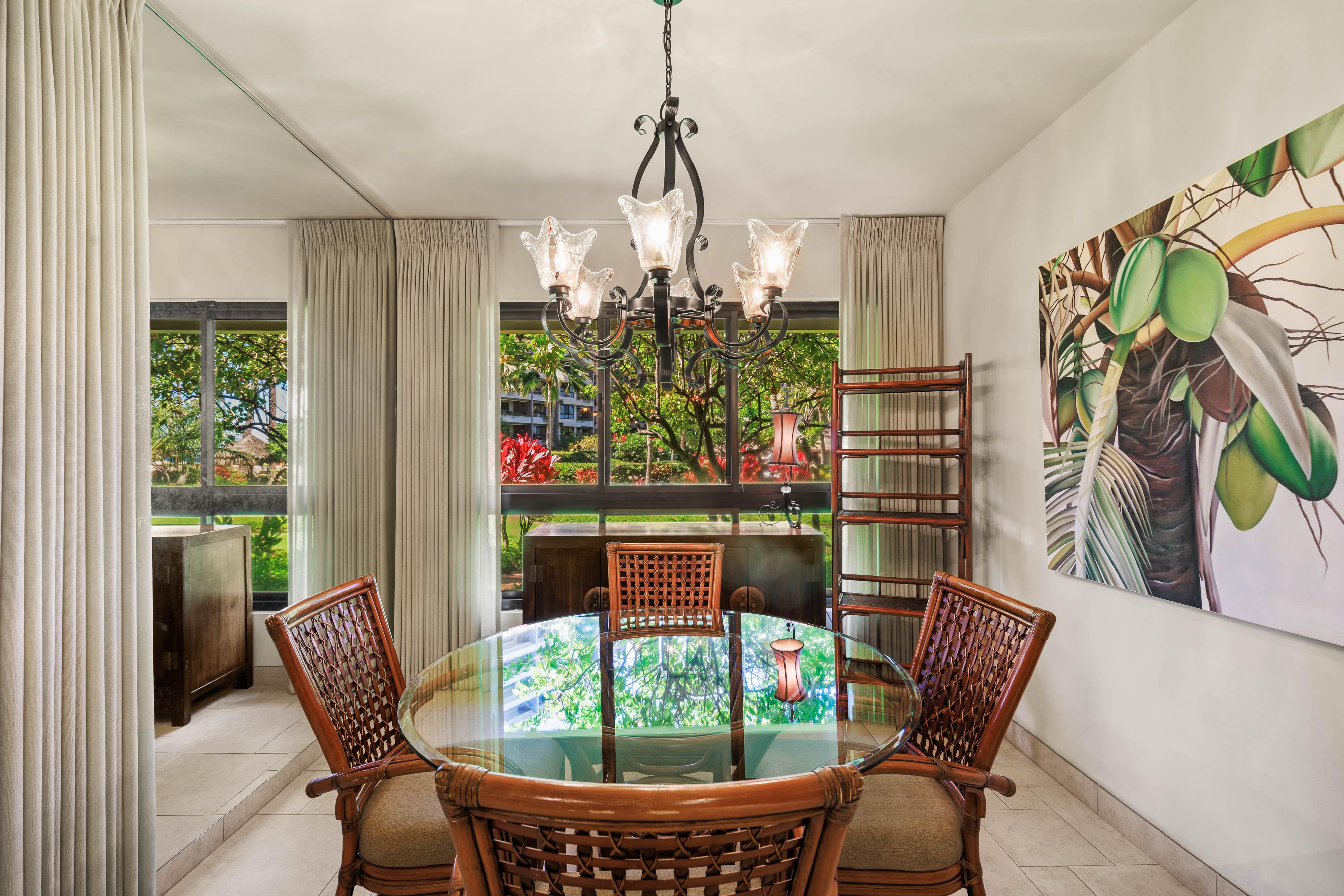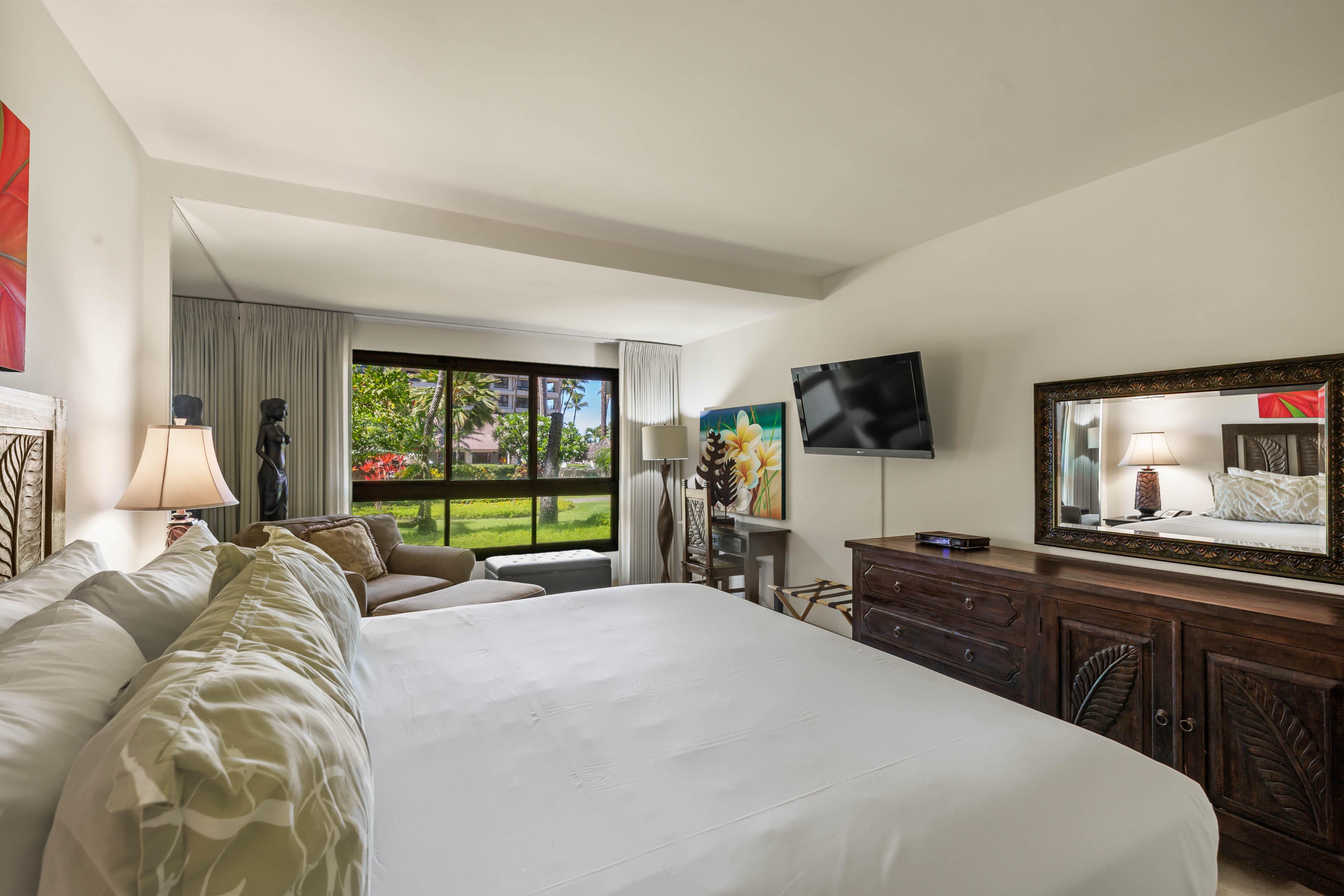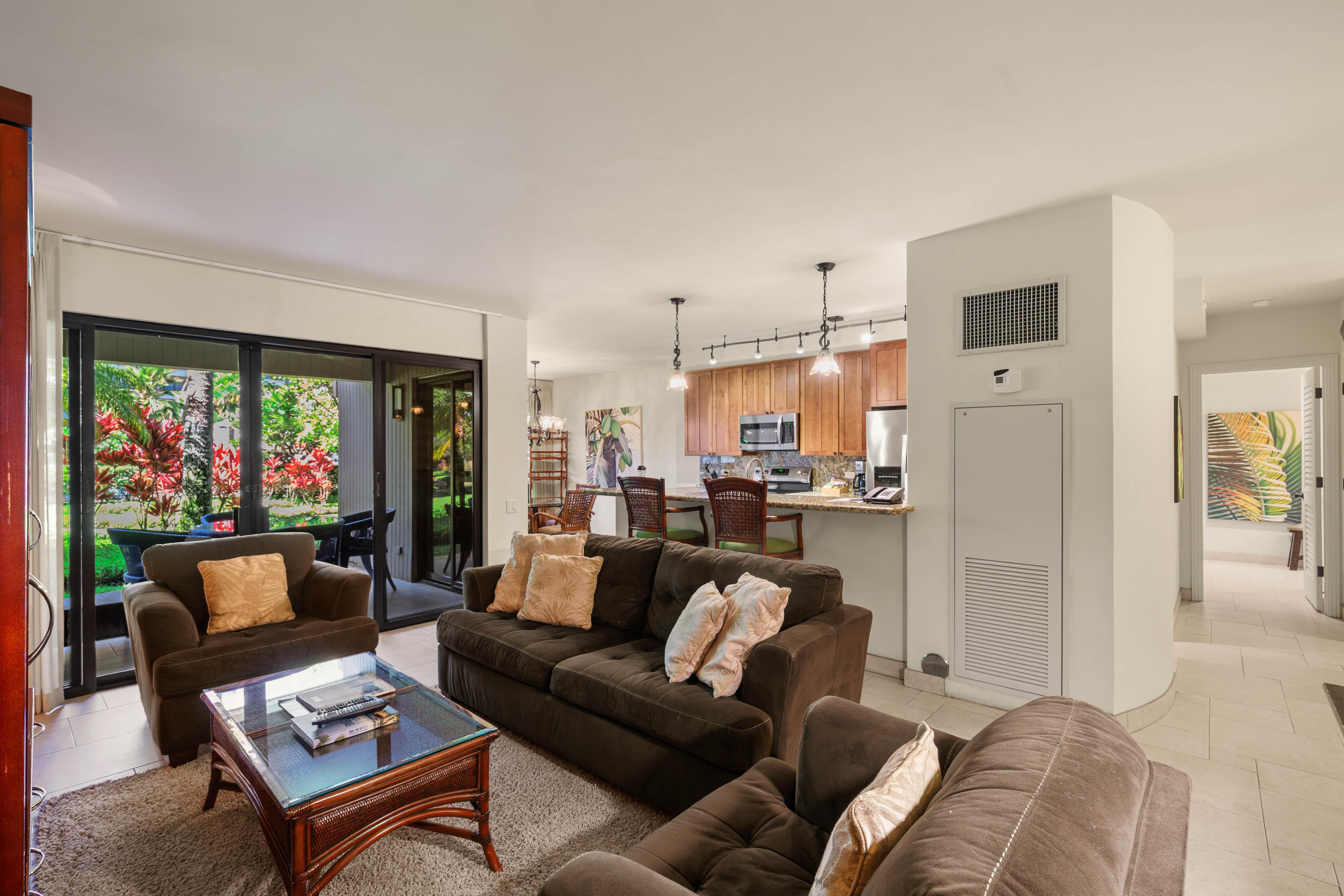 Welcome to Kaanapali Alii 114, a serene one-bedroom garden view condo nestled among the lush tropical landscape of Maui’s premier beachfront resort. This peaceful retreat combines the ease of ground-level access with the comfort of resort living, offering gentle breezes, vibrant greenery, and a sense of privacy just moments from the sand. Tasteful coastal decor and natural tones create a soothing atmosphere, while the open layout invites light and flow throughout the space.