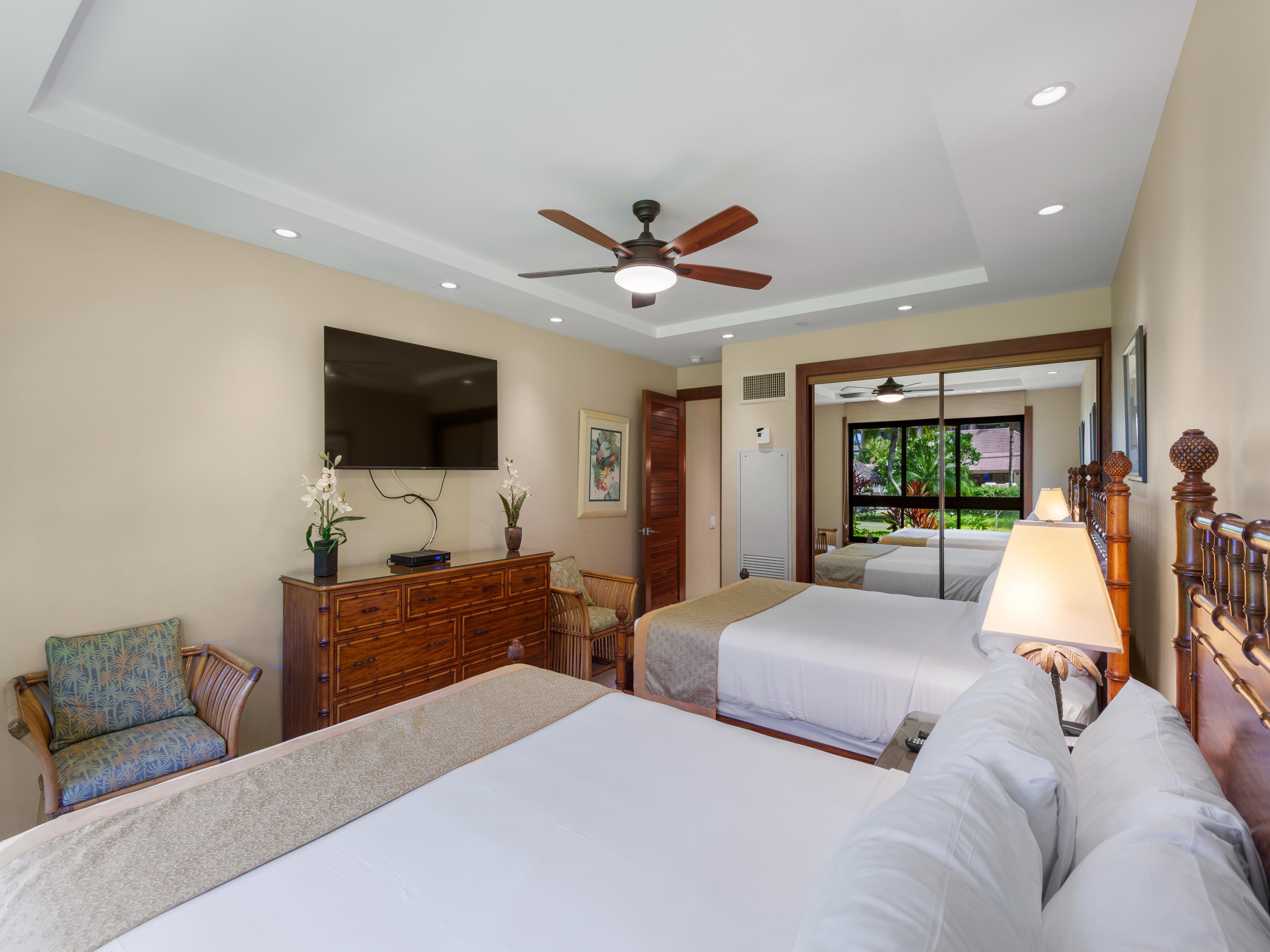 Elegant coastal decor and abundant natural light bring the beauty of the island indoors. The primary bedroom has a comfortable California king bed while the second bedroom has two queen beds. A sofa bed in the living room adds additional sleeping options.