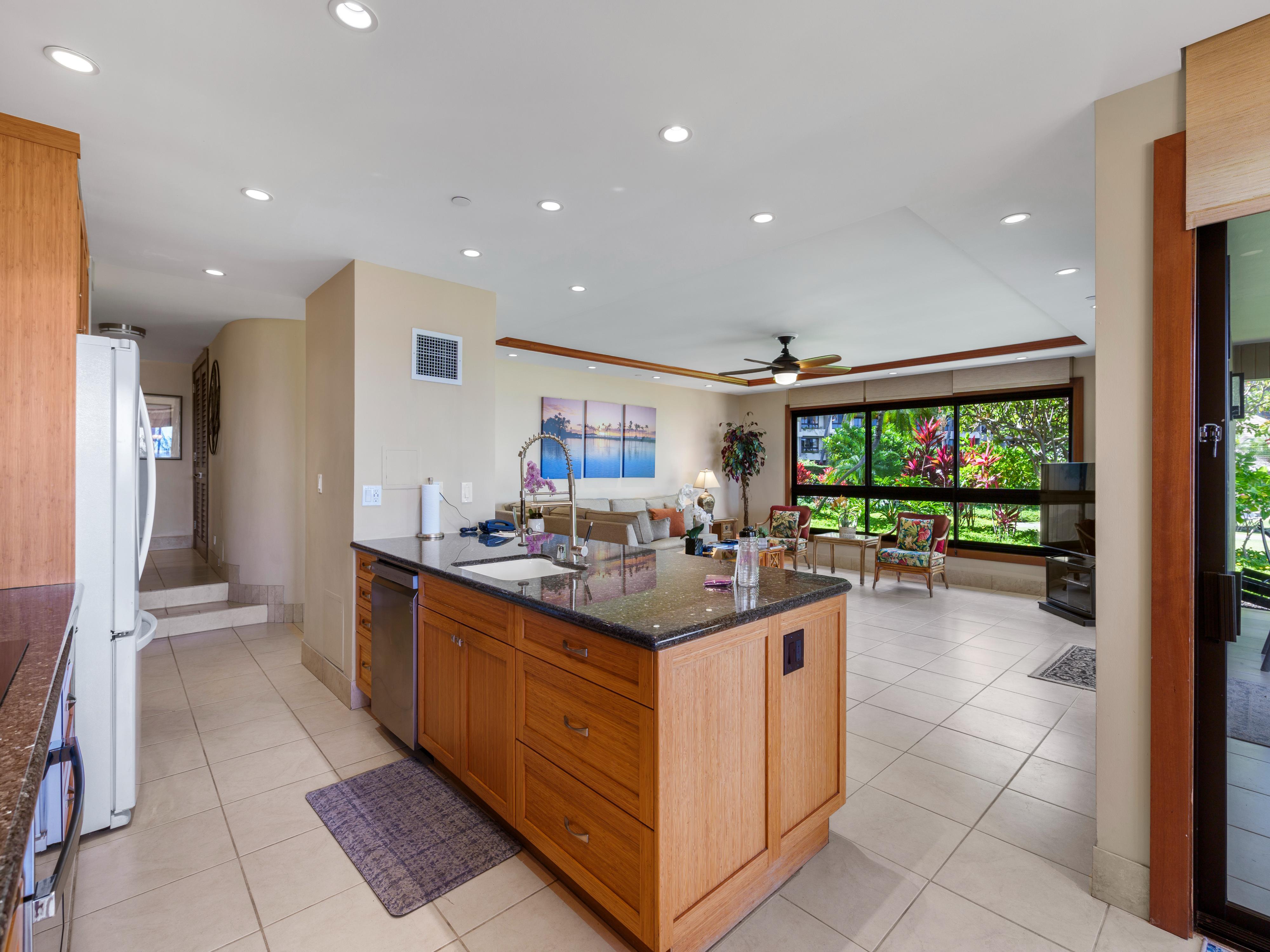 Inside, the open-concept 1,900 square foot layout creates a seamless flow between the living room, dining area, and kitchen, making it perfect for socializing with your travel party or simply unwinding after a long day exploring the beauty of Maui.