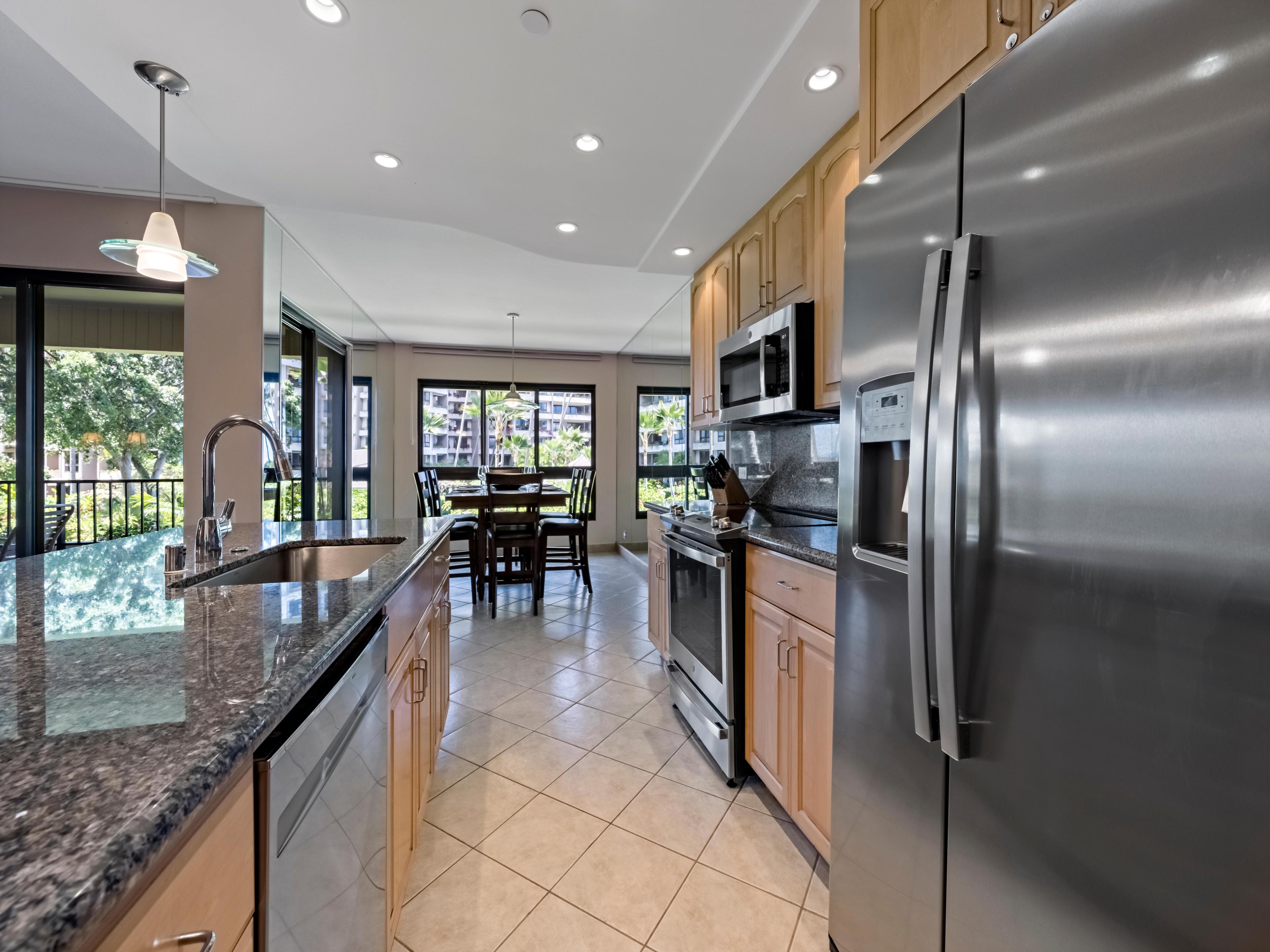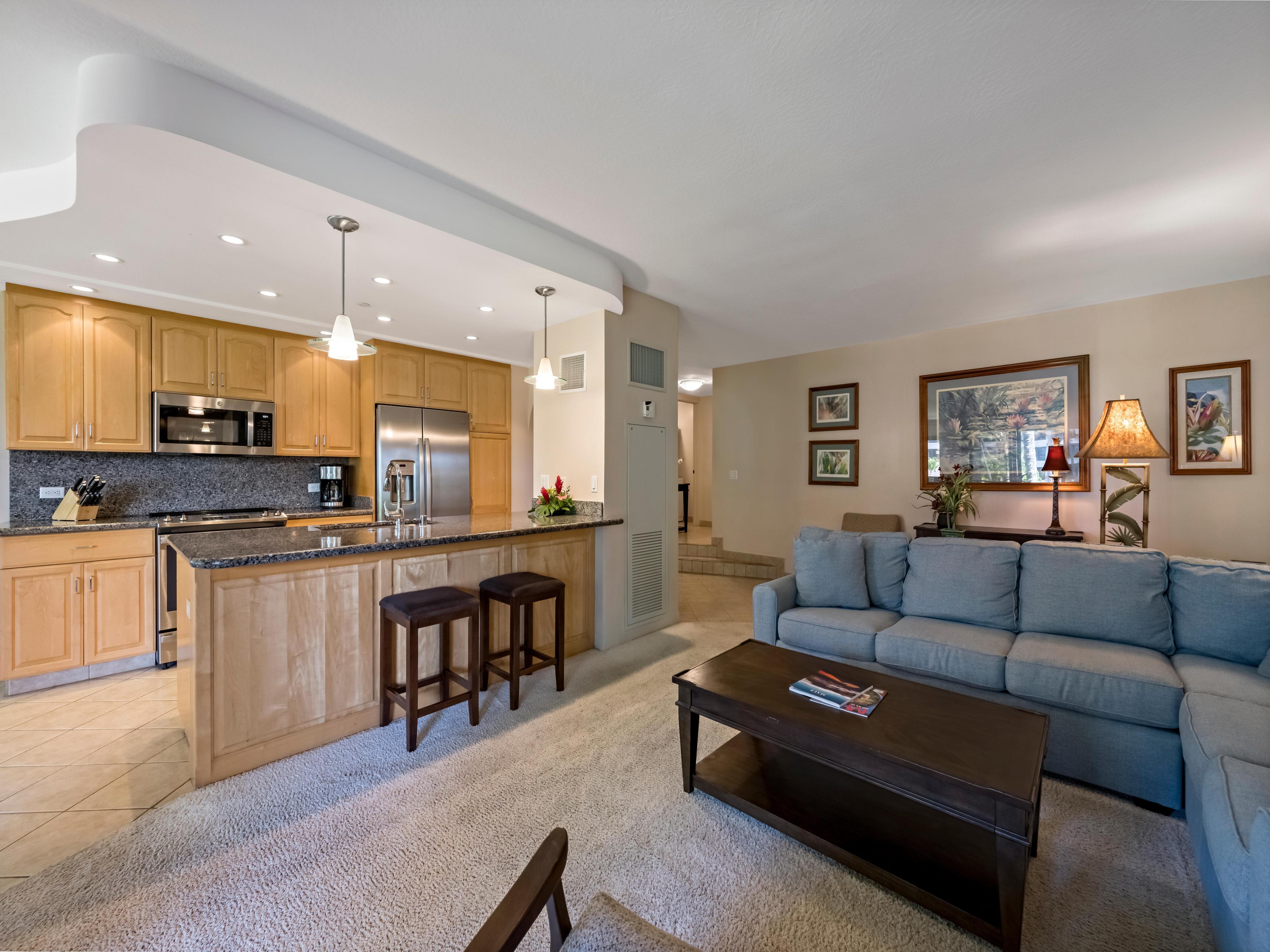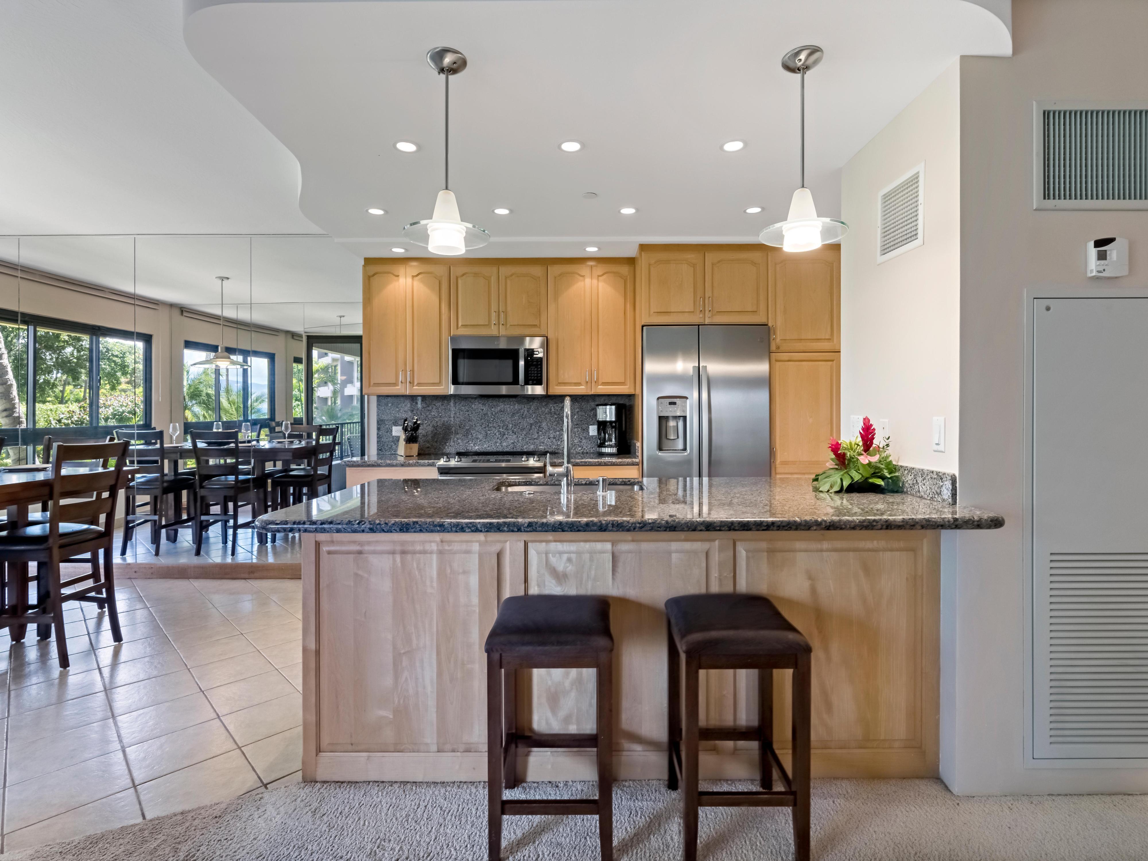 Guests can enjoy breathtaking ocean views from the expansive private lanai, where the soothing sounds of the waves enhance the tropical experience. The gourmet kitchen is fully equipped, allowing for easy meal preparation that can be enjoyed at the dining table or al fresco on the lanai while taking in the great view.